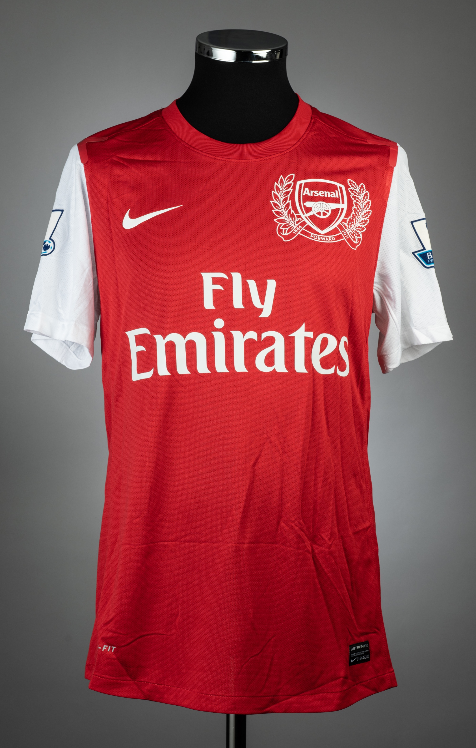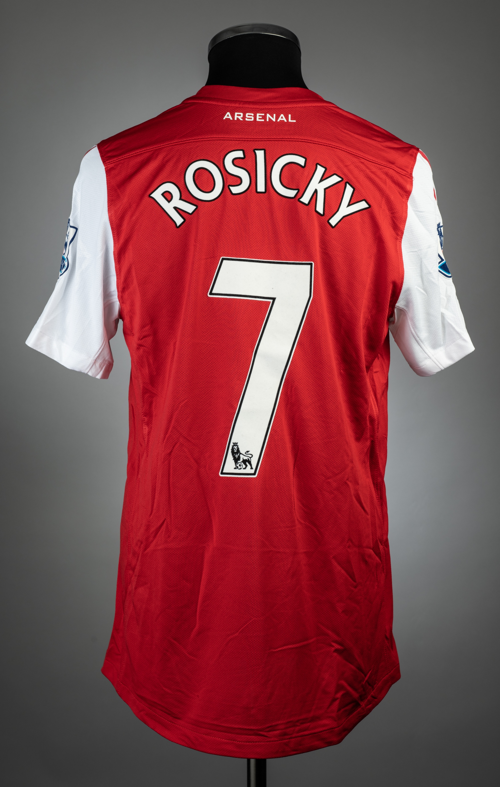Tomas Rosicky red and white Arsenal no.7 home jersey, season 2011-12 match issue, NIke, short-sleeved with BARCLAYS PREMIER LEAGUE sleeve badges, clu