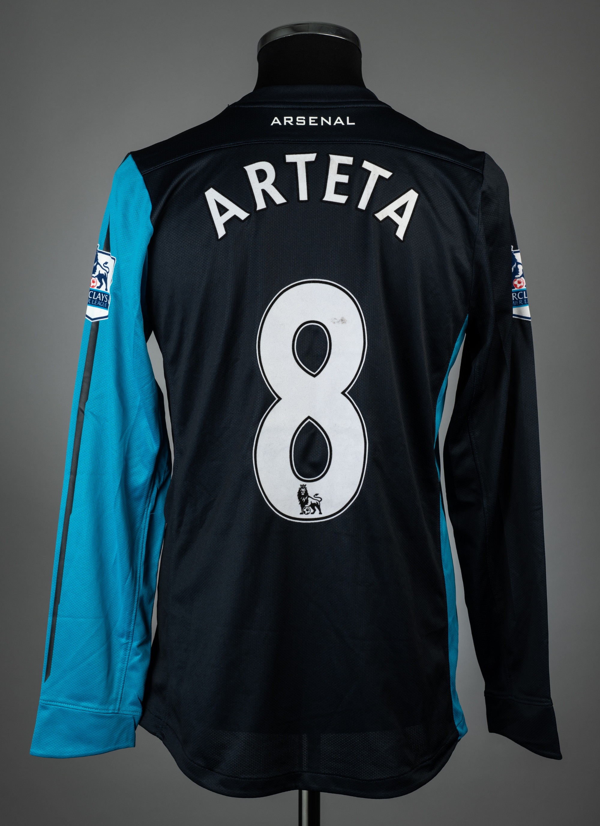 Mikel Arteta navy & light blue Arsenal no.8 away jersey, season 2011-12, match issue, Nike, long-sleeved with BARCLAYS PREMIER LEAGUE sleeve badges, club crest and sponsor logo, reverse lettered ARTETA, size M, rubberized shoulder seams tacky