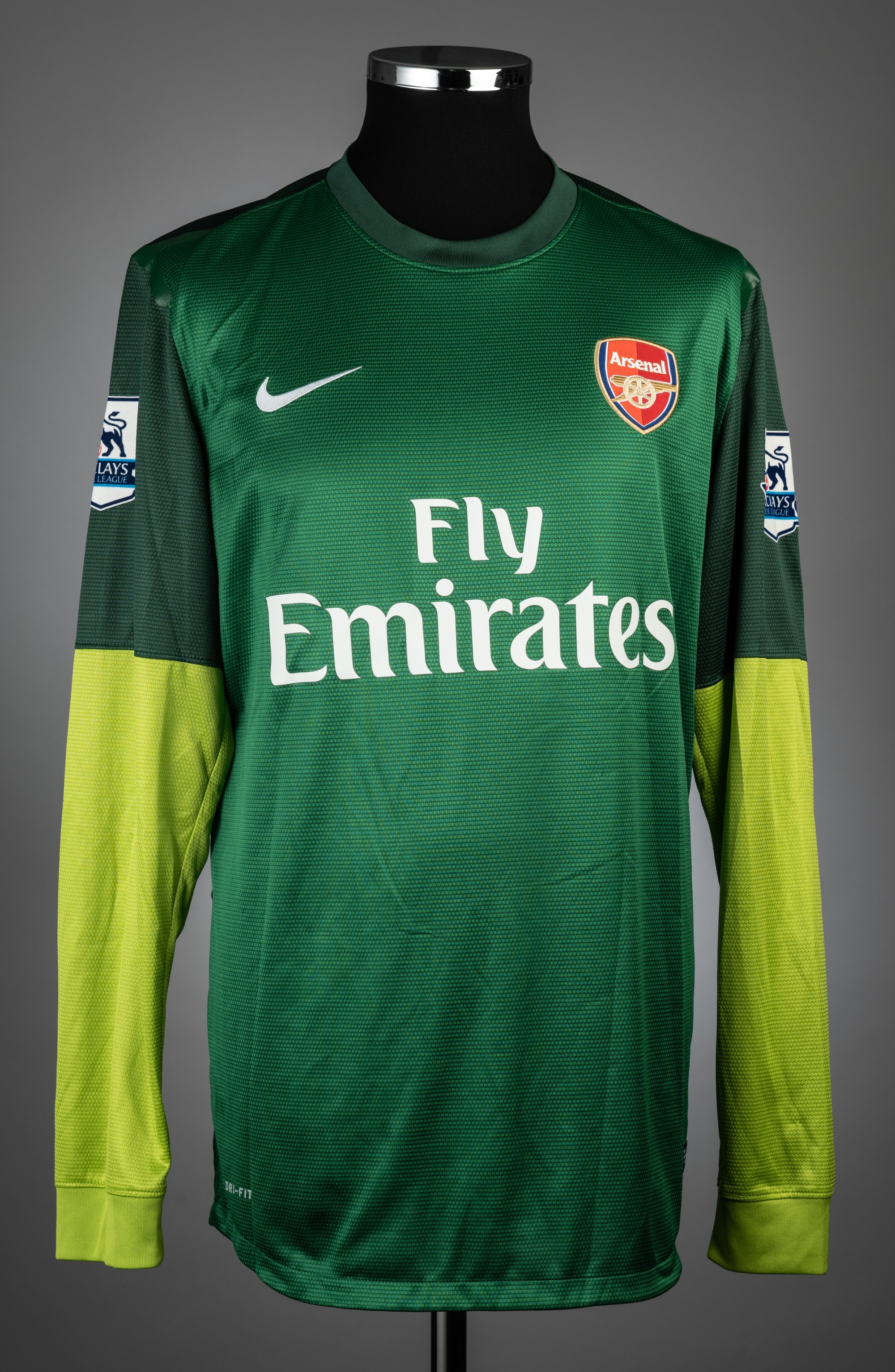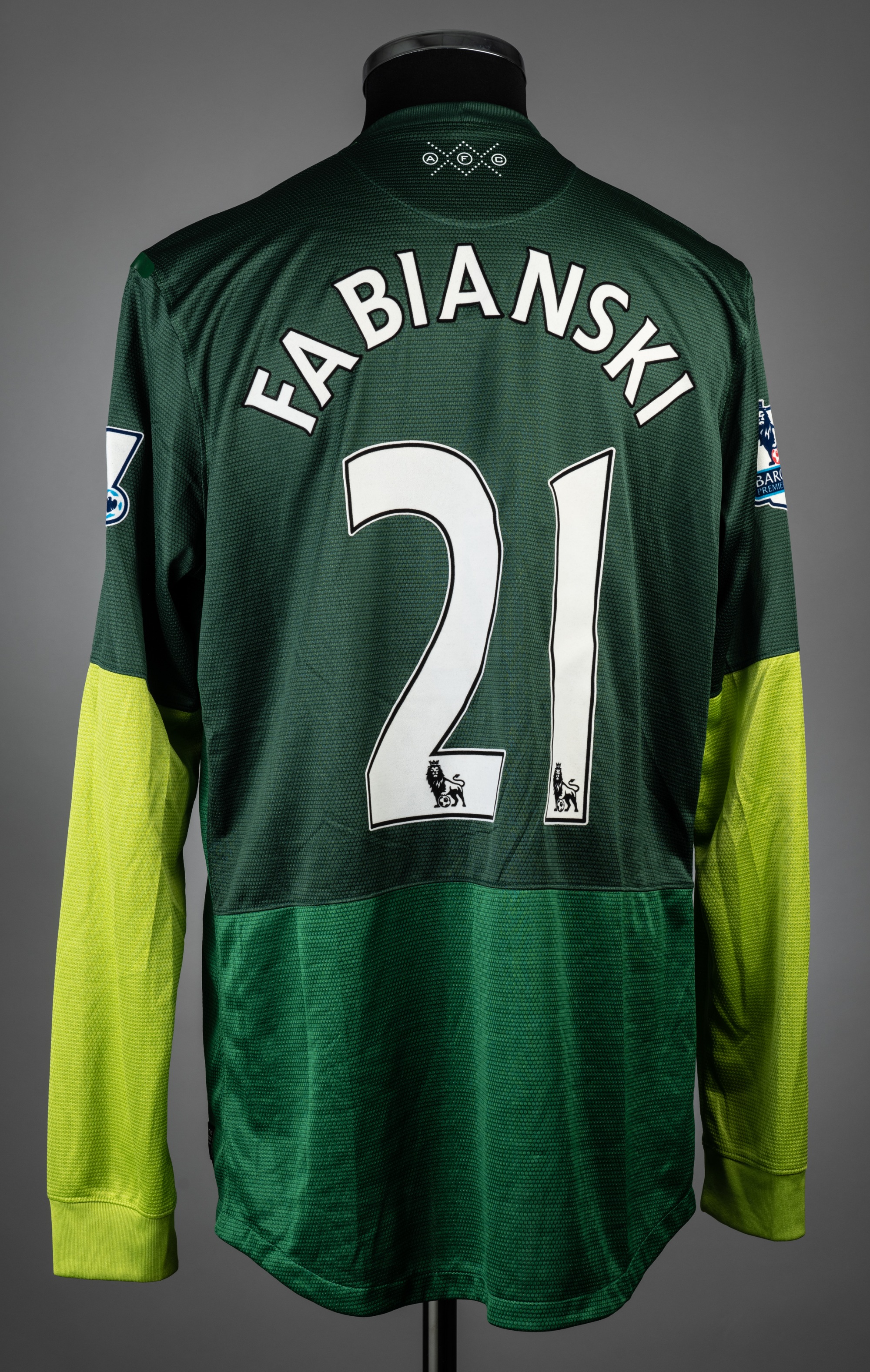 Lukasz Fabianski green Arsenal no.21 goalkeeping jersey, season 2012-13, match issue, Nike, long-sleeved with BARCLAYS PREMIER LEAGUE sleeve badge, club crest and sponsor logo, reverse lettered FABIANSKI, size XL, rubberized shoulder seams tacky