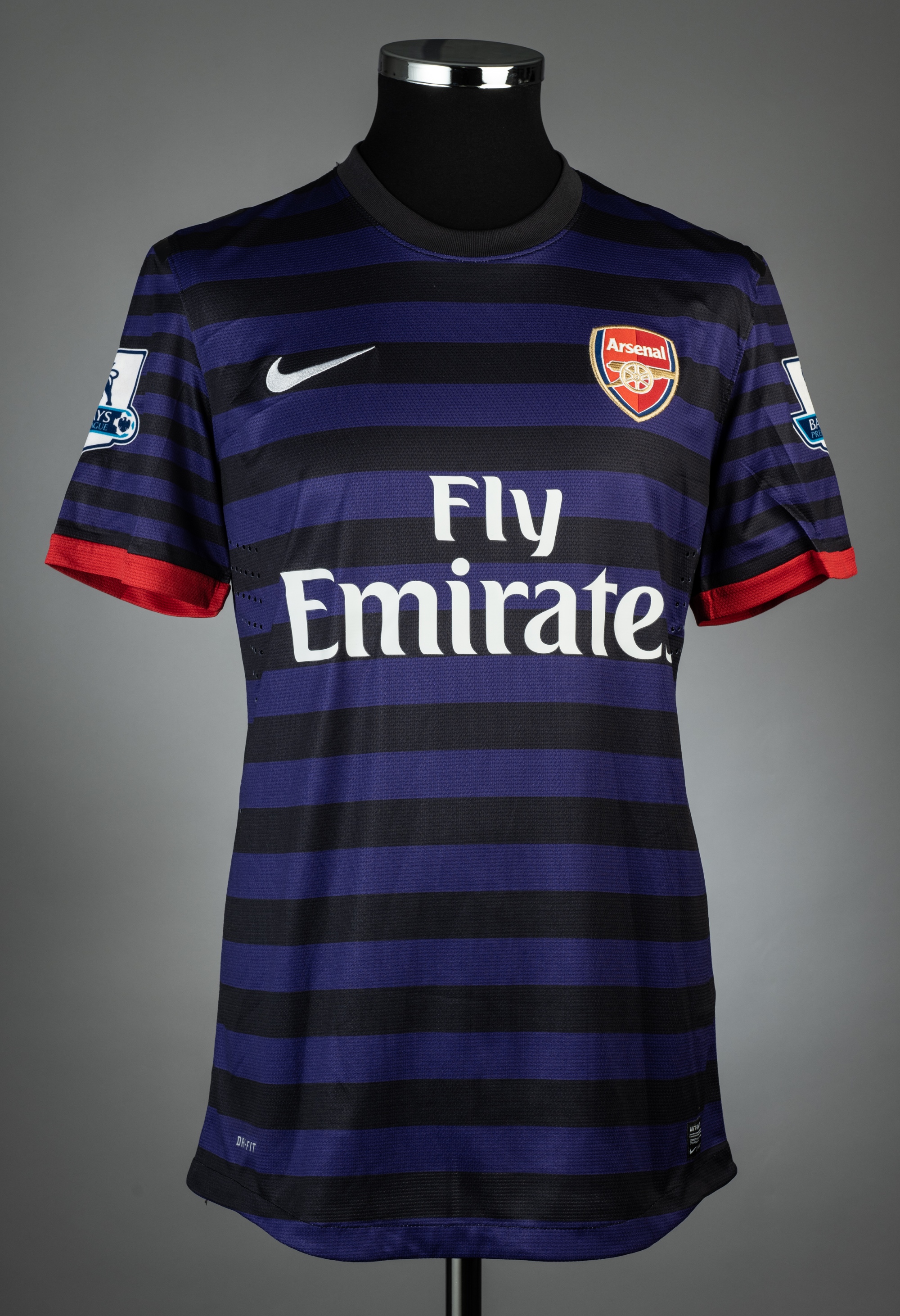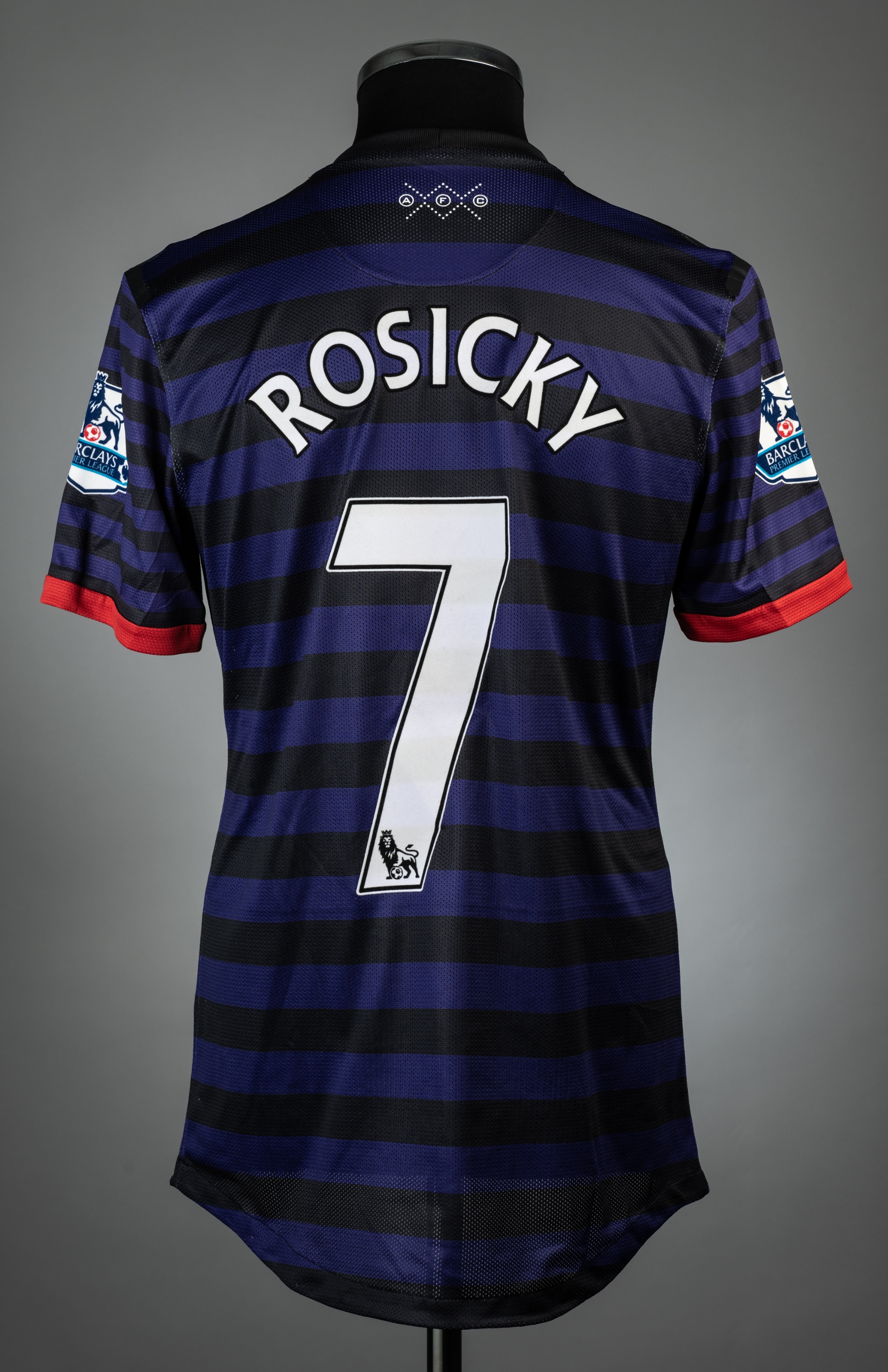 Tomas Rosicky purple & black hooped Arsenal no.7 away jersey, season 2012-13, match issue, Nike, short-sleeved with BARCLAYS PREMIER LEAGUE sleeve badges, club crest and sponsor logo, reverse lettered ROSICKY, size L, rubberized shoulder seams tacky