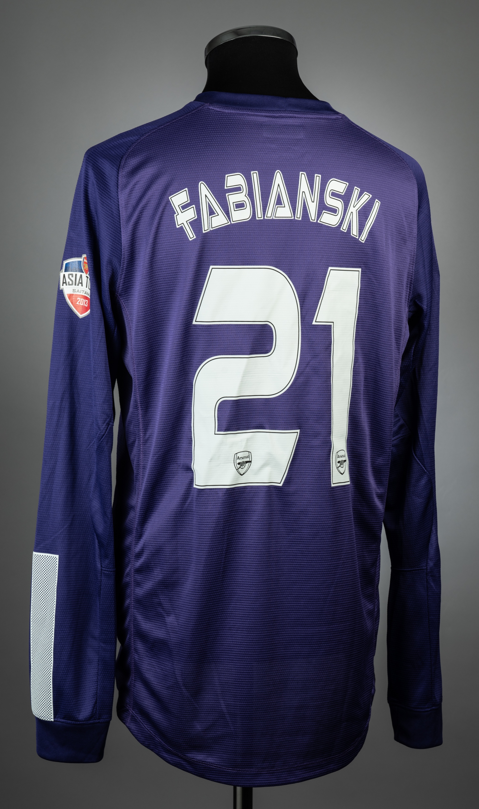 Lukasz Fabianski purple Arsenal no.21 goalkeeping jersey v Urawa Red Diamond, played at Saitama, 26th July 2013, match issue, Nike, long-sleeved with ARSENAL ASIA TOUR SAITAMA 2013 sleeve badges, club crest and sponsor logo in Japanese, reverse lettered FABIANSKI, size L