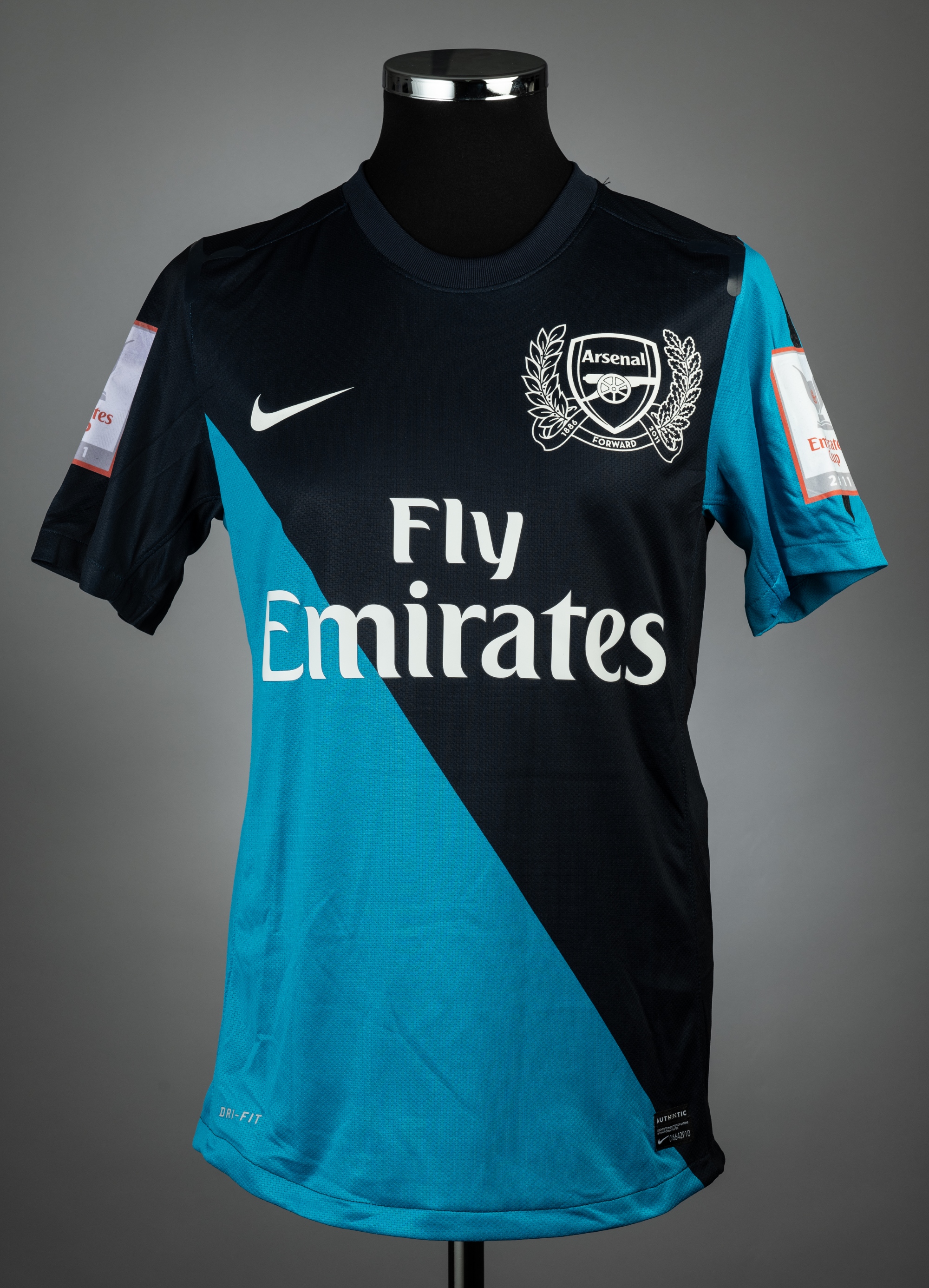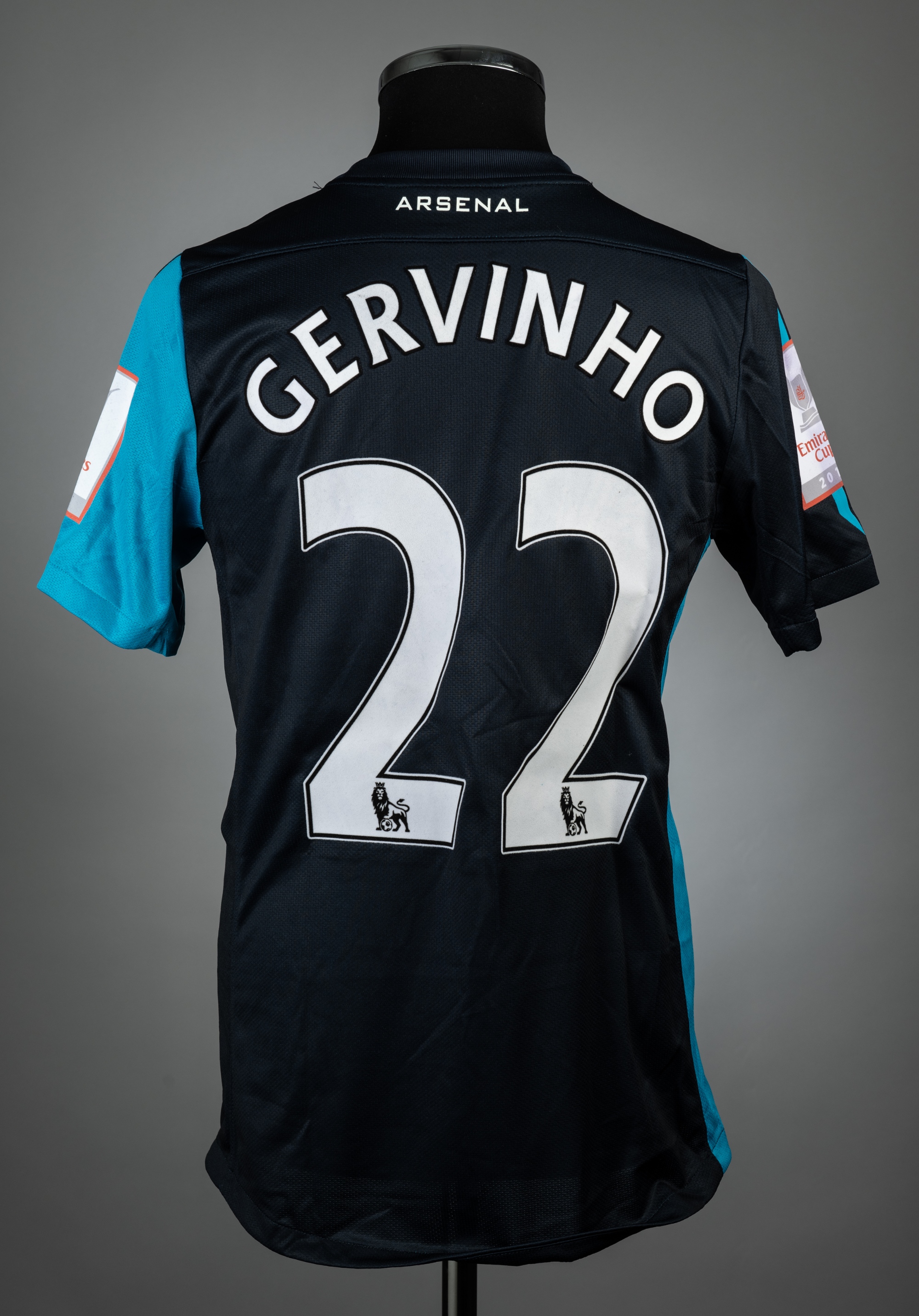 Gervinho navy and light blue Arsenal Emirates Cup no.22 jersey v Boca, played at Emirates Stadium, 3rd August 2013, match issue, Nike, short-sleeved with EMIRATES CUP 2011 sleeve badges, club crest and sponsor logo, reverse lettered GERVINHO, size M, rubberized shoulder seams tacky This fixture resulted in a 2-2 draw.