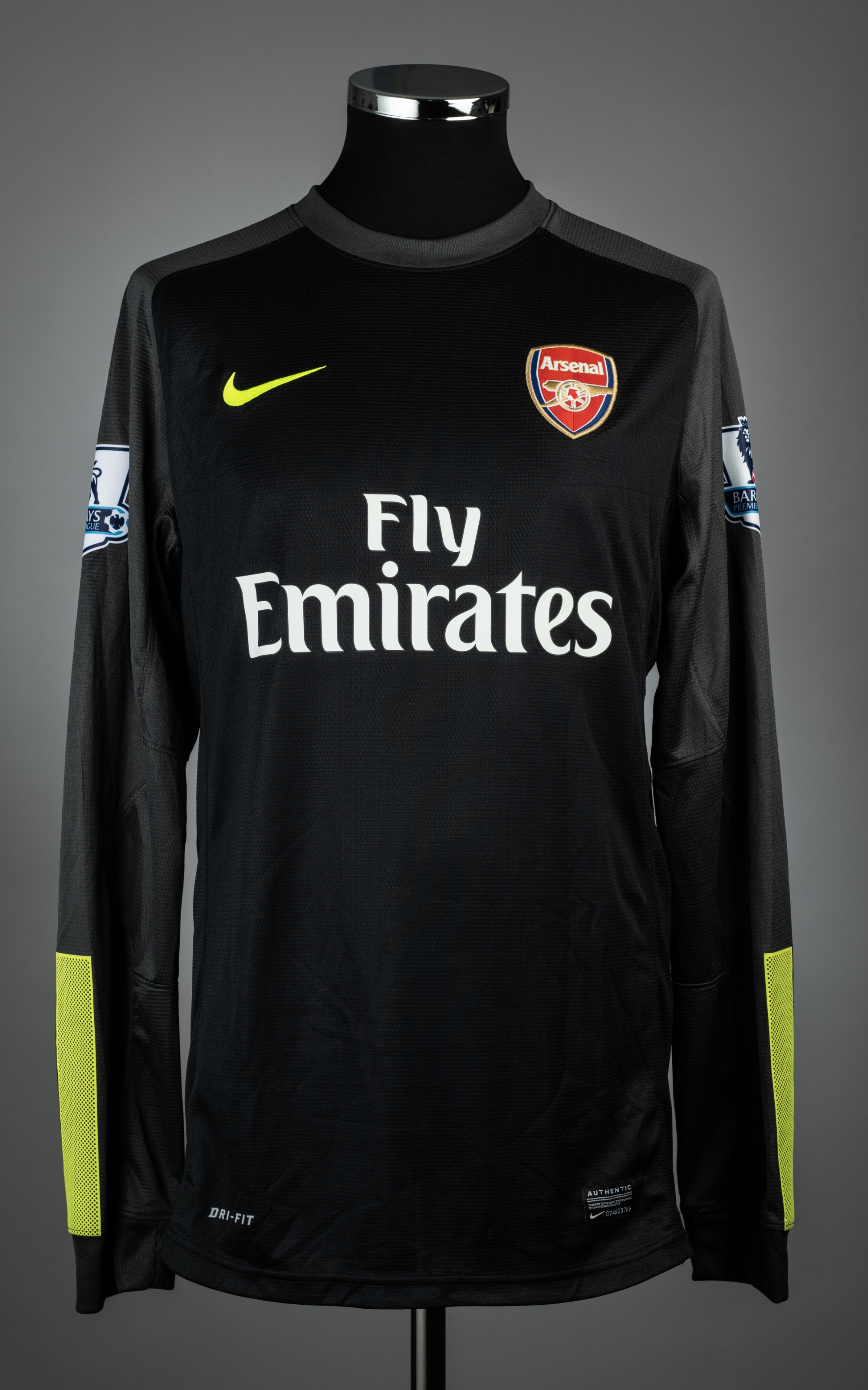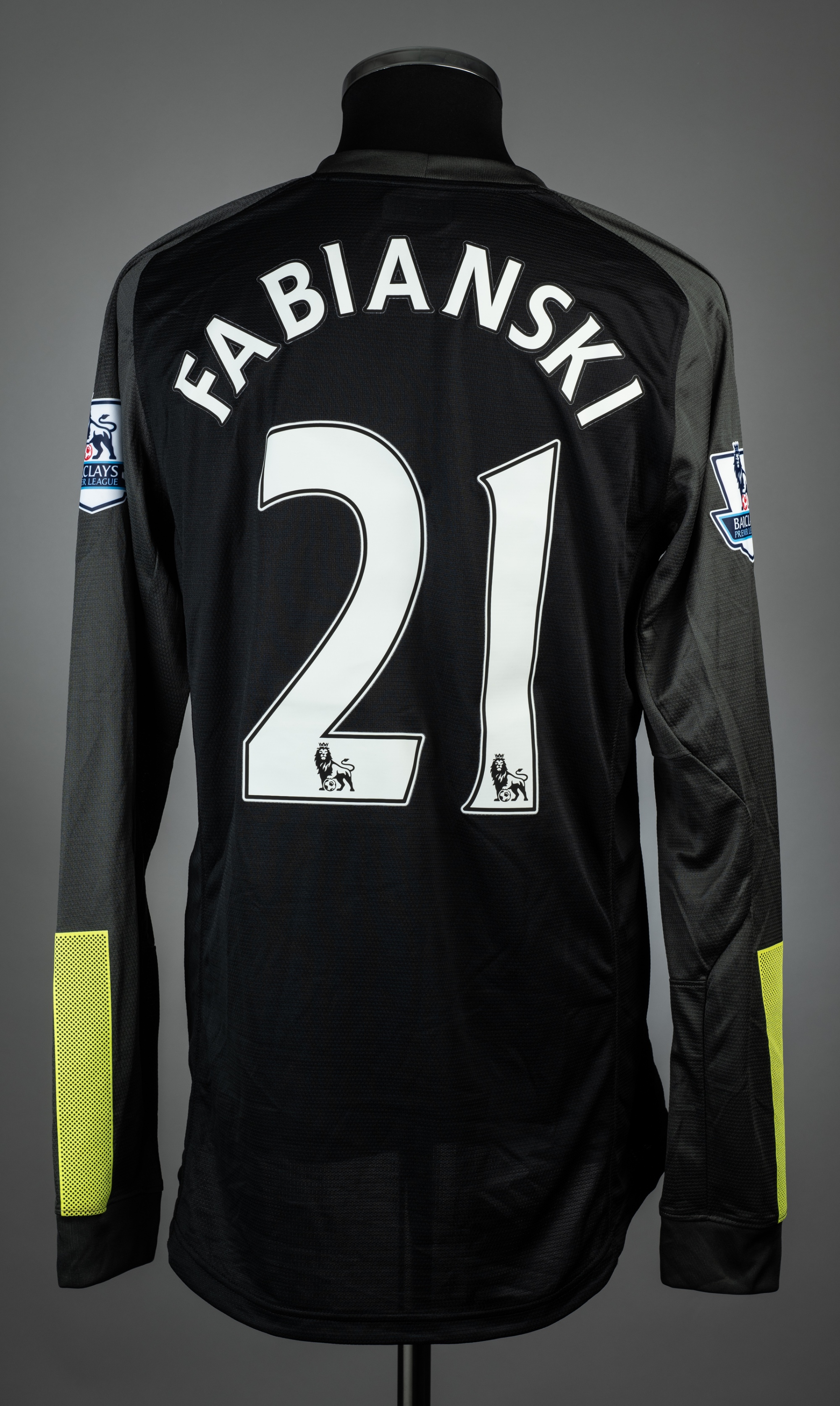 Lukasz Fabianski black & grey Arsenal no.21 goalkeeping away jersey, season 2013-14, match issue, Nike, long-sleeved with BARCLAYS PREMIER LEAGUE sleeve badge, club crest and sponsor logo, reverse lettered FABIANSKI, size L