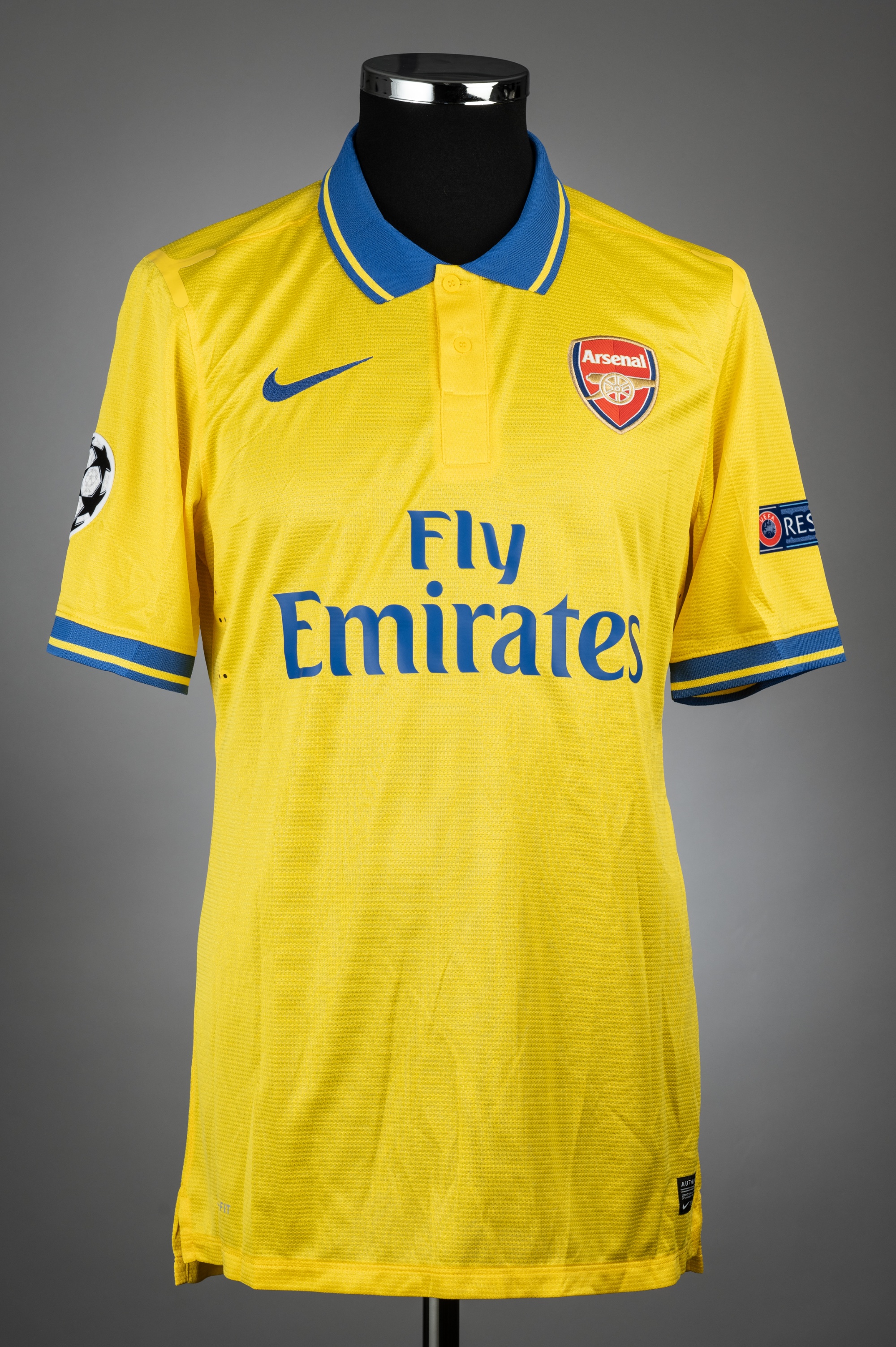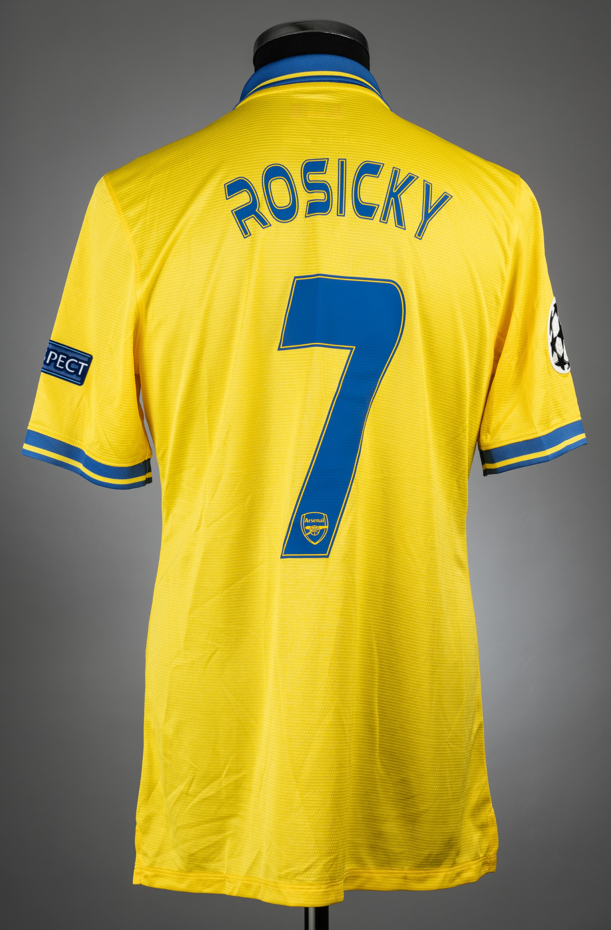 Tomas Rosicky yellow & blue Arsenal UEFA Champions League no.7 away jersey, season 2013-14, match issue, Nike, short-sleeved with UEFA STARBALL and RESPECT sleeve badges, club crest and sponsor logo, reverse lettered ROSICKY, size L
