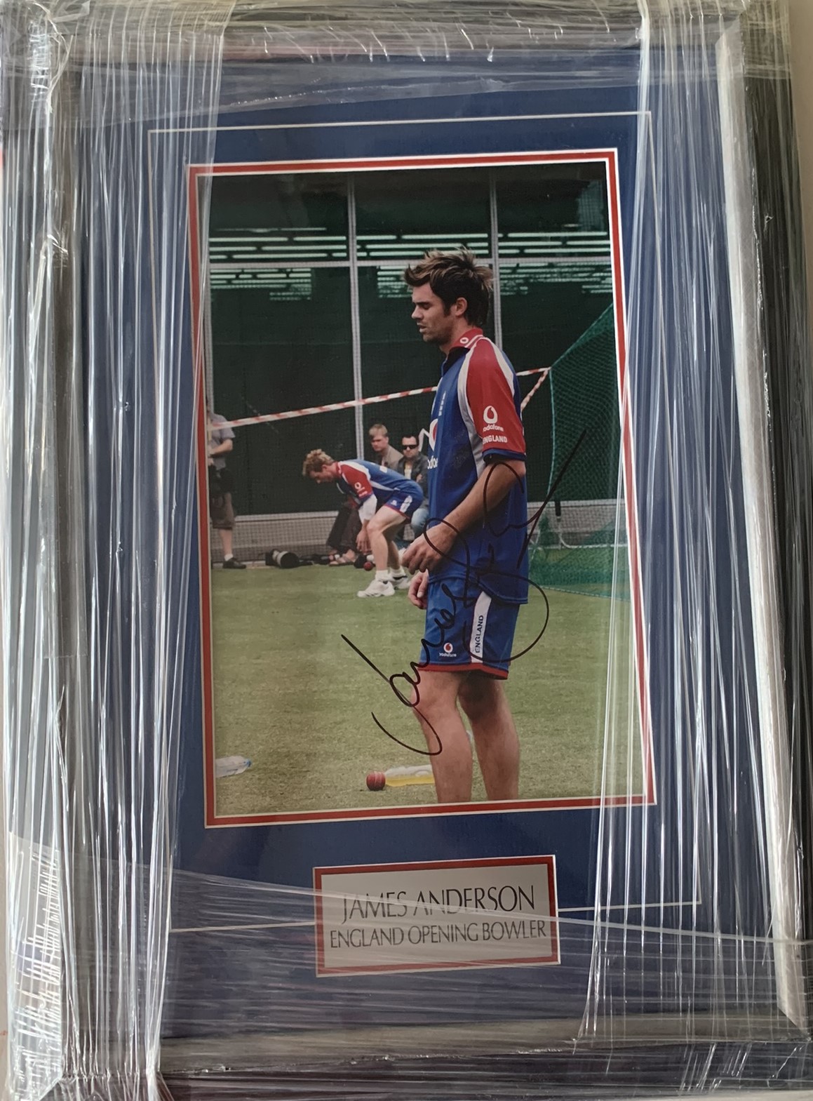 England: Jimmy Anderson signed 8 by 10in. photograph, professionally framed / glazed, double matted and plaque. Frame Size: 37 by 51cm. Anderson is E