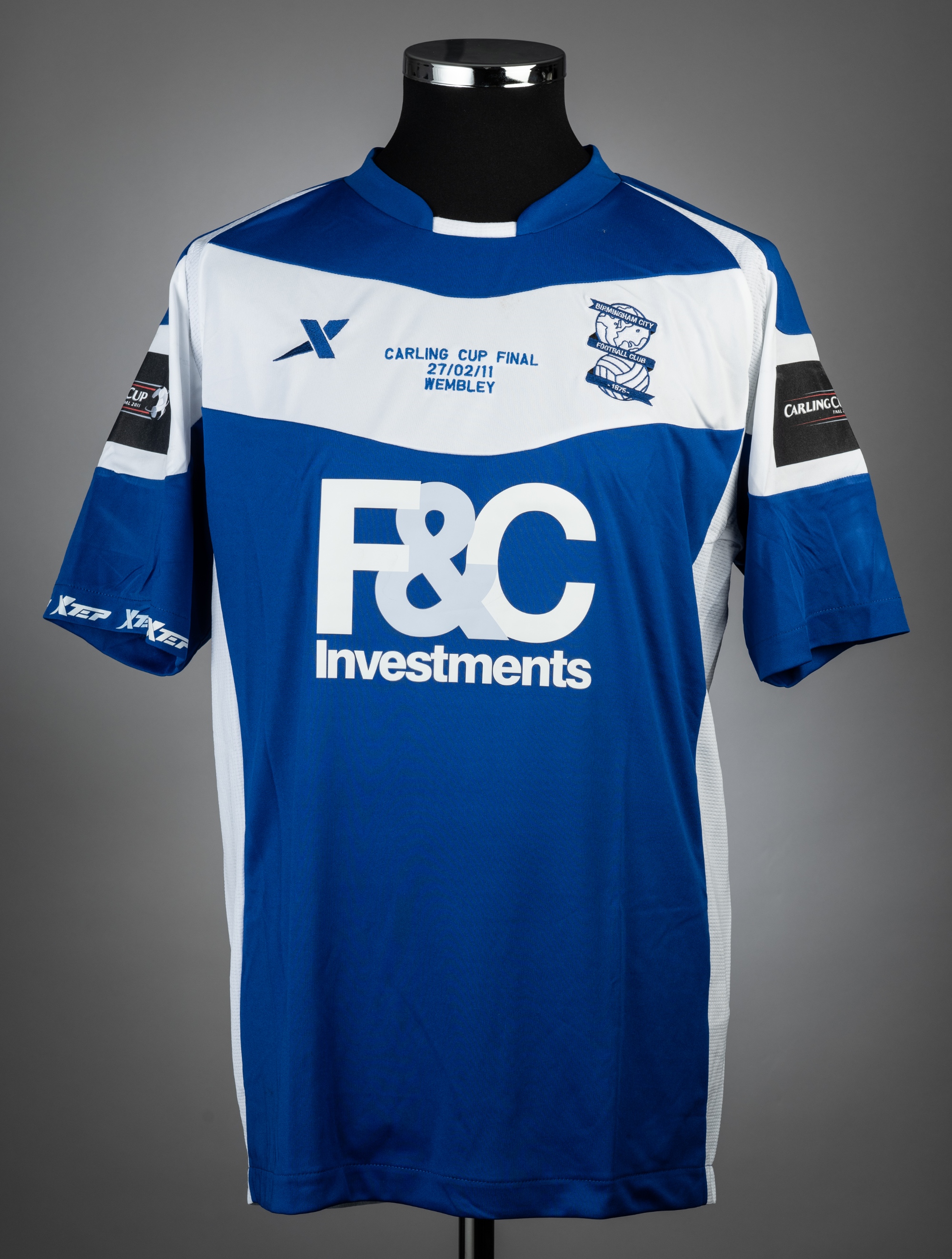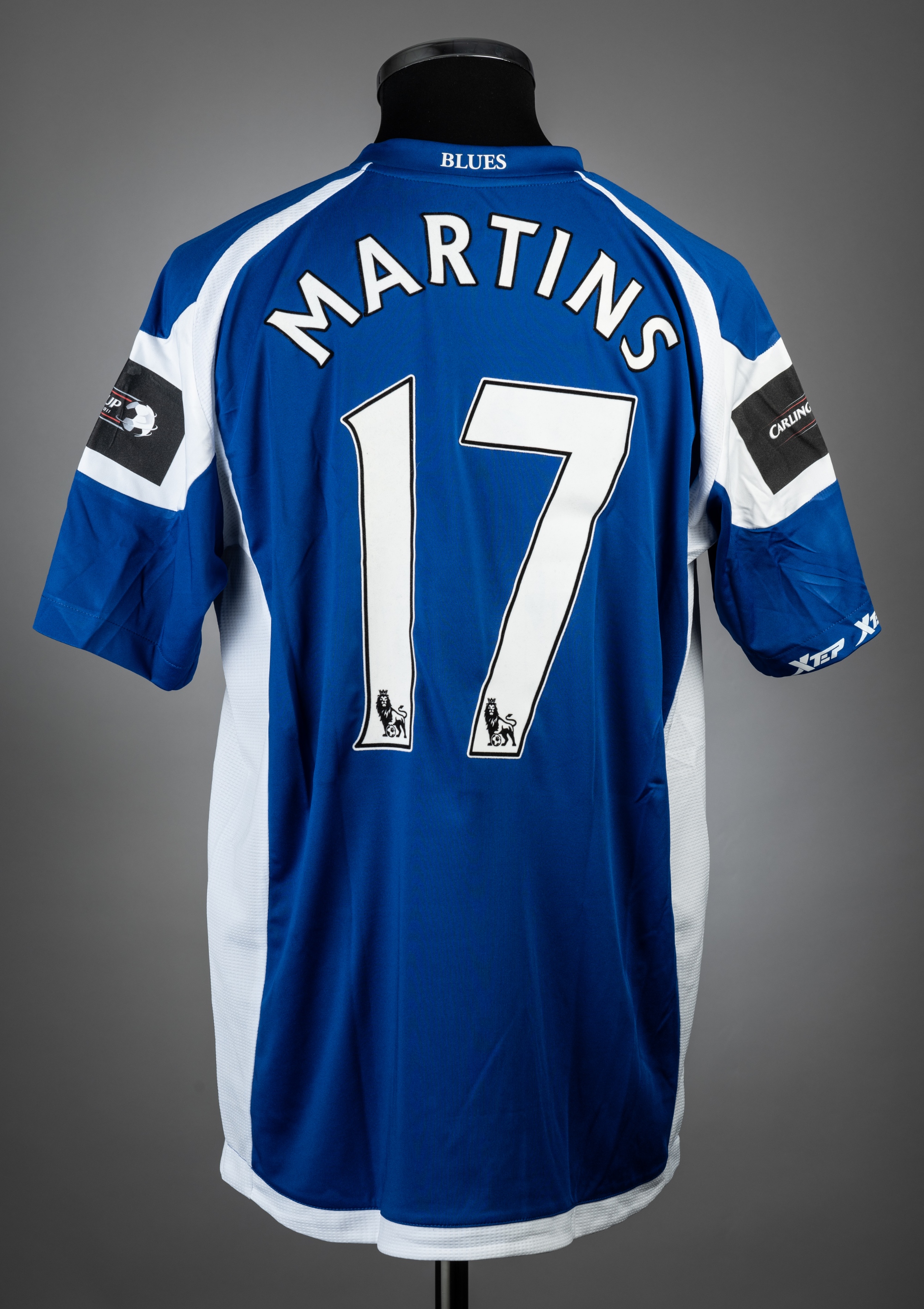 Obafemi Martins blue & white Birmingham City Carling Cup Final no.17 jersey v Arsenal, played at Wembley, on 27th February 2011, match-issue, Xtep, short-sleeved with CARLING CUP FINAL 2011 sleeve badges, embroidered CARLING CUP FINAL 27/02/22 WEMBLEY, club crest and sponsor logo, reverse lettered MARTINS, size L Birmingham City defeated Arsenal 2-1, with Martins scoring the winning goal in the 89th minute.