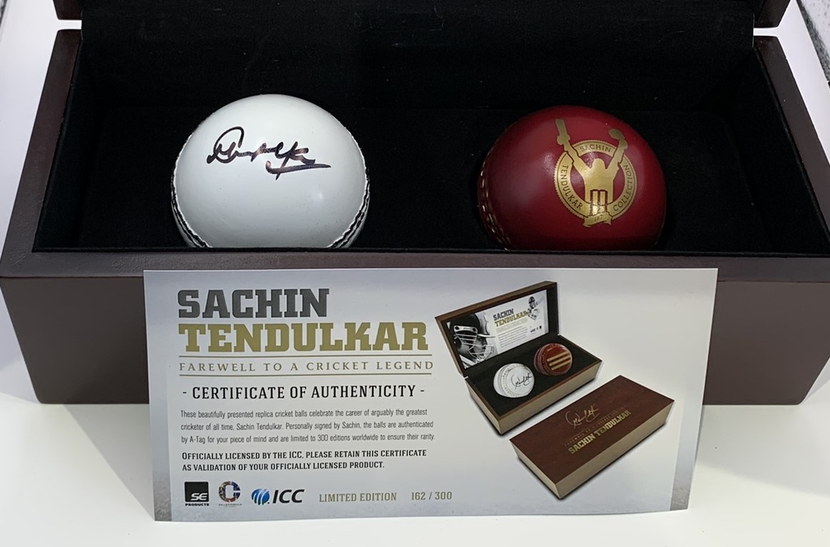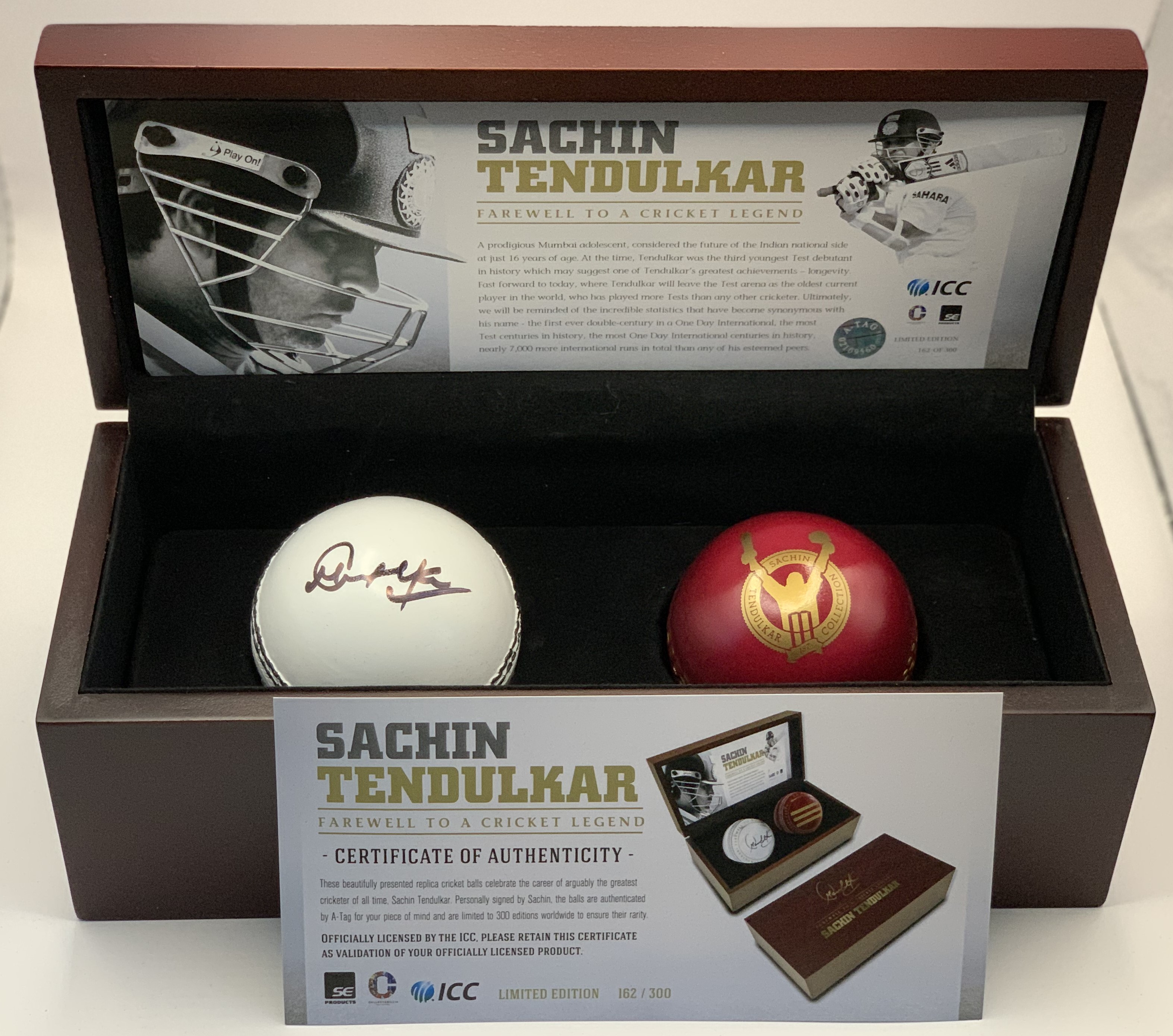 India: Sachin Tendulkar signed Limited Edition Cricket Ball set in display box with official ICC COA and ICC hologram, includes one signed white ball and one red ball with stats, set in a display box with Official COA and ICC hologram, no.162 of 300 produced world wide, sold out in less than 1 hour. Very rare to find.