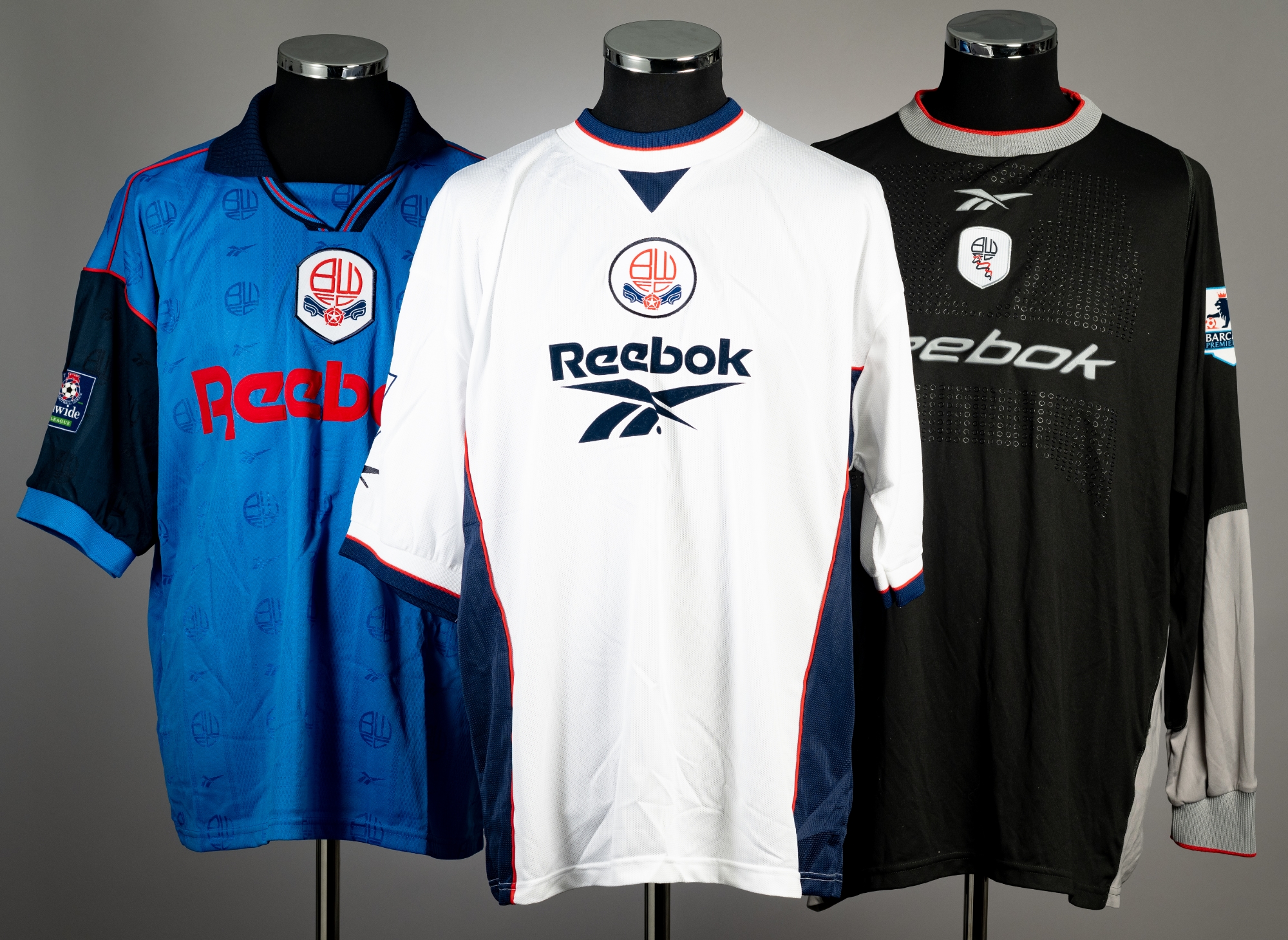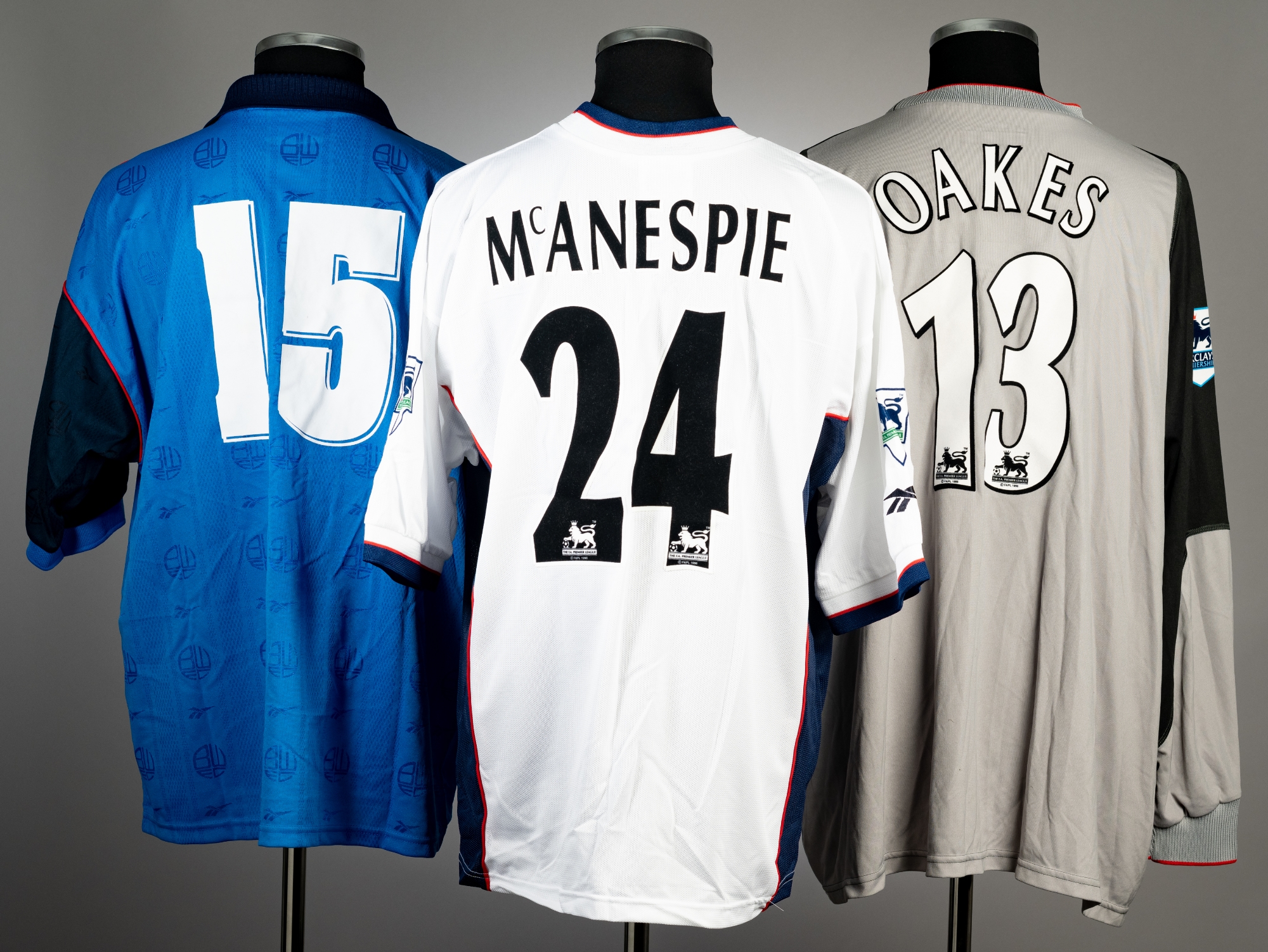 A group of three Bolton Wanderers match jerseys, comprising Steve McAnespie white home no.24 premier league jersey; Andy Oakes black and grey no.13 goalkeeping premier league jersey; blue and navy away no.15 unnamed Nationwide Football jersey, (3)