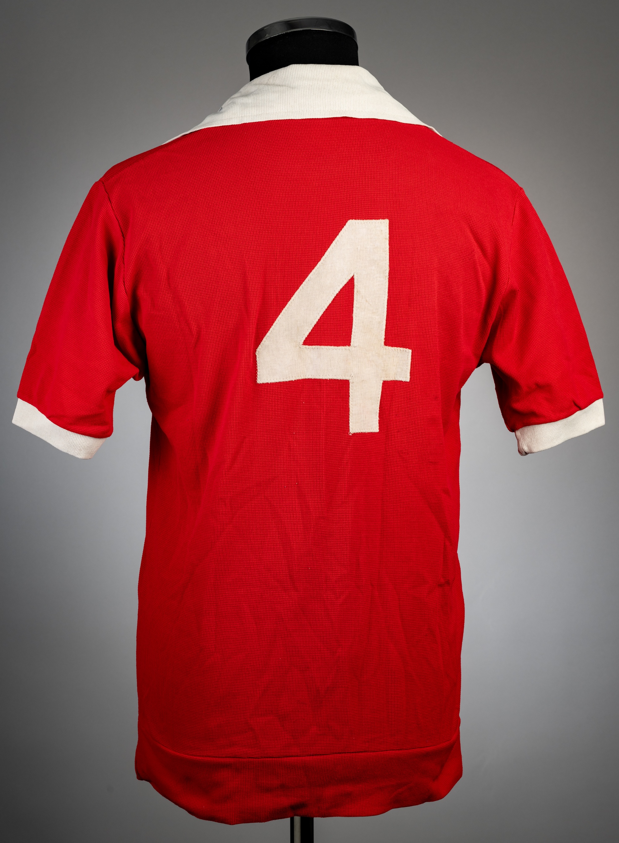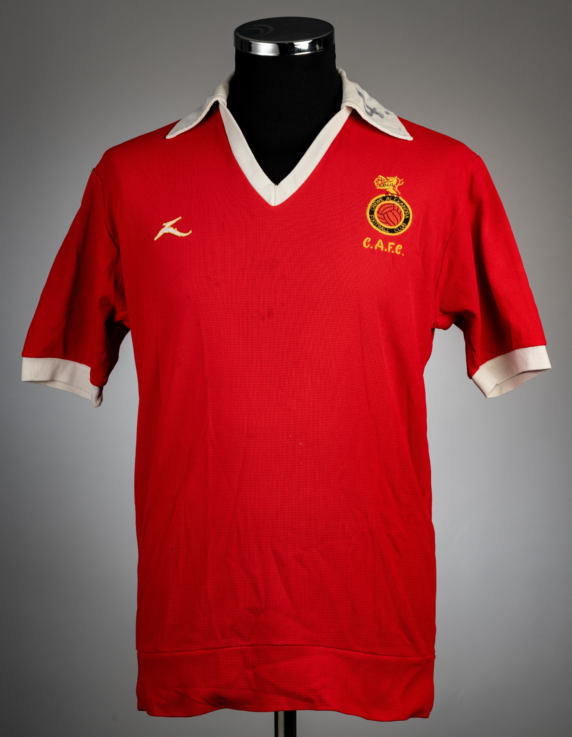 Ray Lugg red Crewe Alexandra no.4 home jersey, season 1976-77, Maker possibly Bukta, short-sleeve with embroidered club crest and C.A.F.C., white wing collar and elasticated sleeve cuffs, bearing no.4 in black marker pen on collar wing