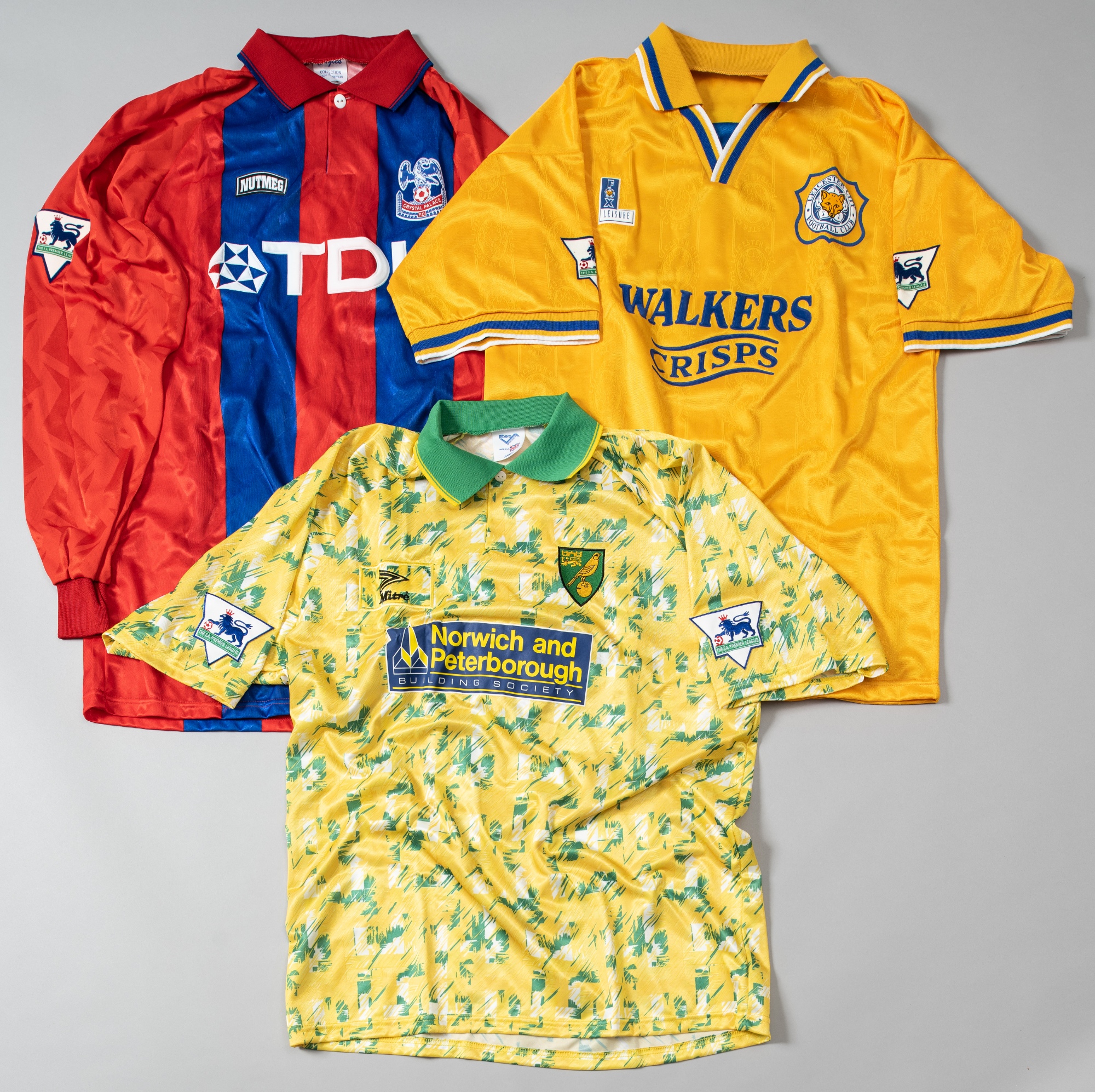 Three Premier League match jerseys, comprising Simon Osbourne red and blue striped Crystal Palace no.9 home jersey; Deryn Brace yellow and green Norwich City no.23 home jersey; Ian Ormondroyd amber and blue Leicester City no.11 away jersey, each jersey bearing some wear, one without neck label, (3)