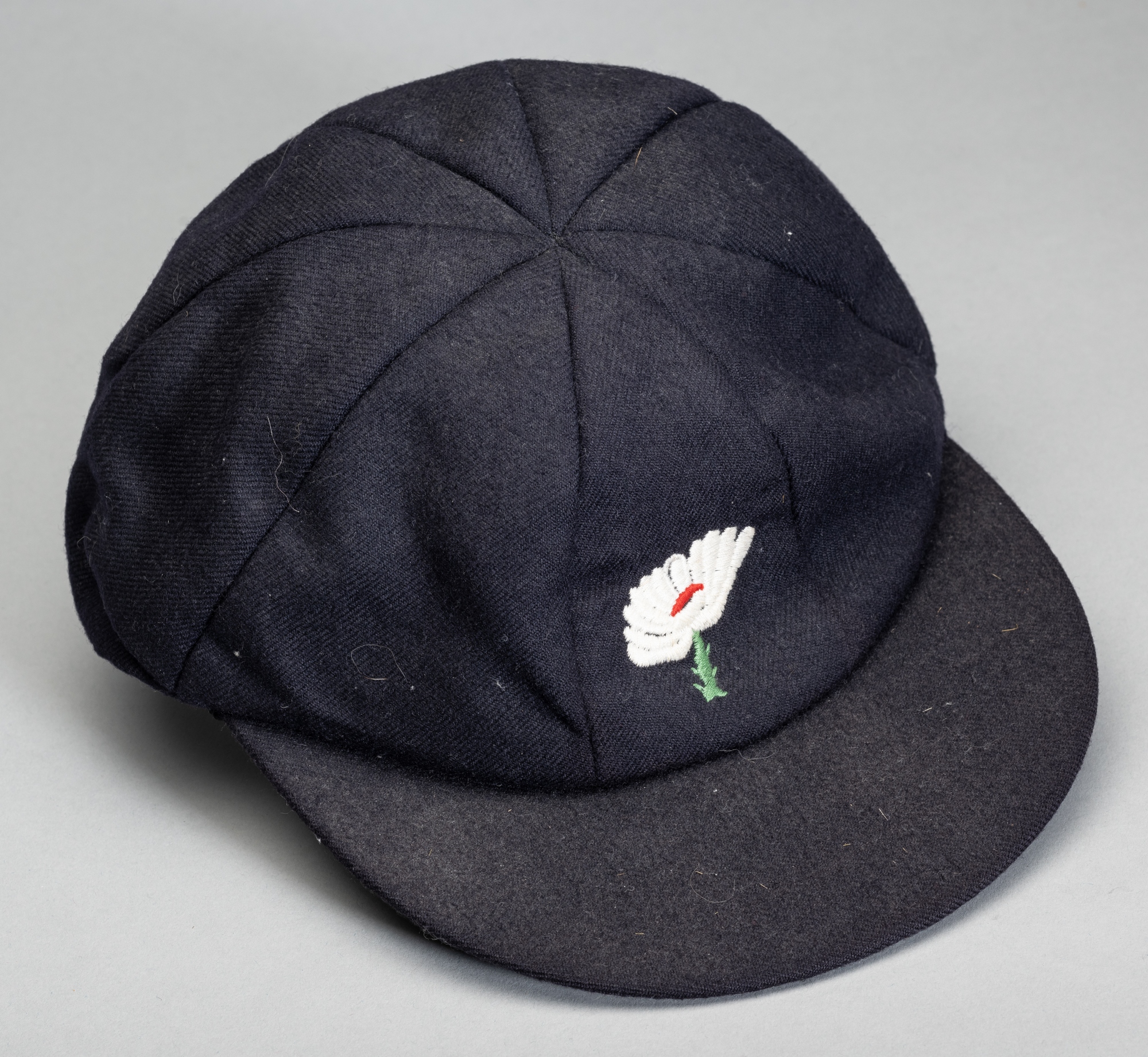 Yorkshire County Cricket Club representative cap, navy wool cap embroidered with white rose crest