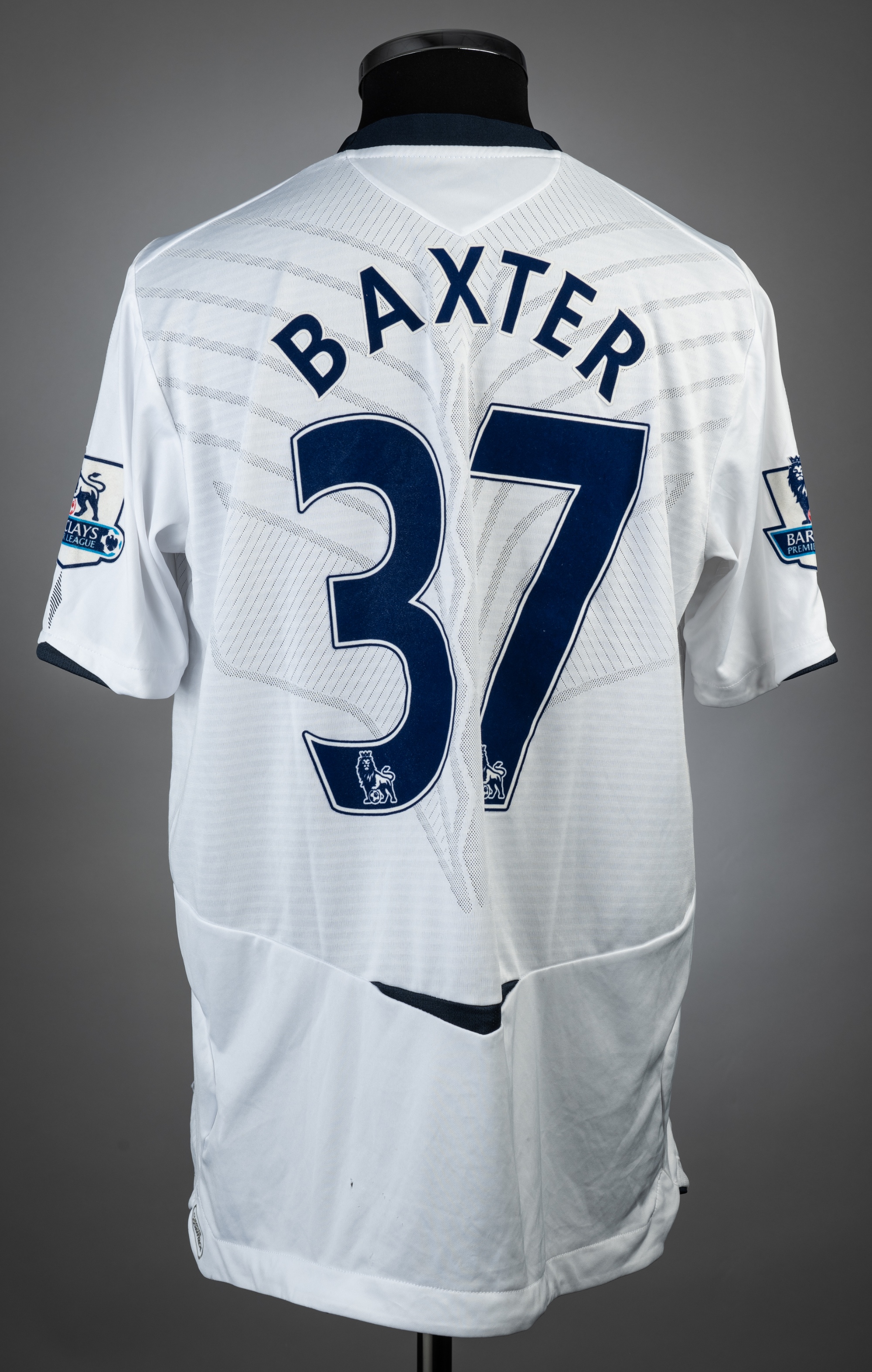 Jose Baxter white, grey & navy Everton no.37 away jersey, season 2008-09, match-issue, Umbro, short-sleeved with BARCLAYS PREMIER LEAGUE sleeve badges, club crest and sponsor logo, reverse lettered BAXTER, size L