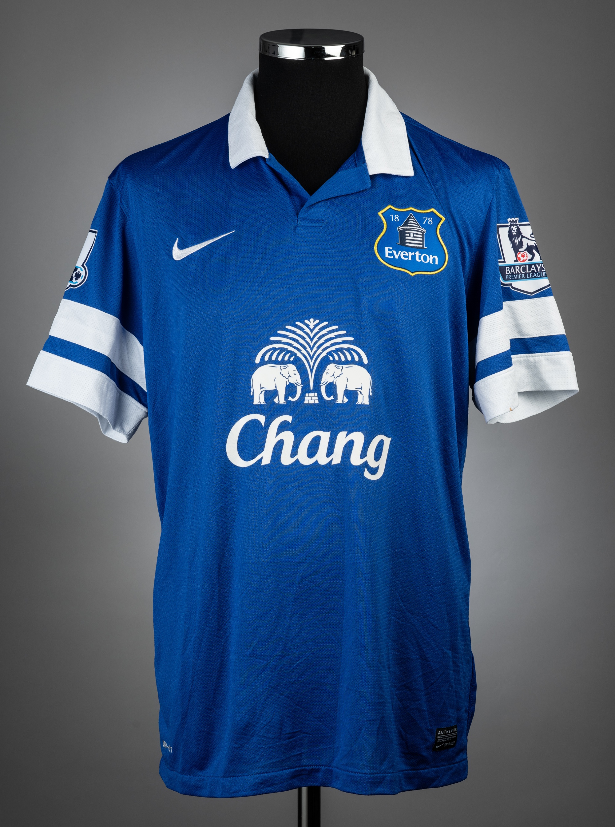 Phil Jagielka blue & white Everton no.6 home jersey, season 2013-14, match-issue, Nike, short-sleeved with BARCLAYS PREMIER LEAGUE sleeve badges, clu