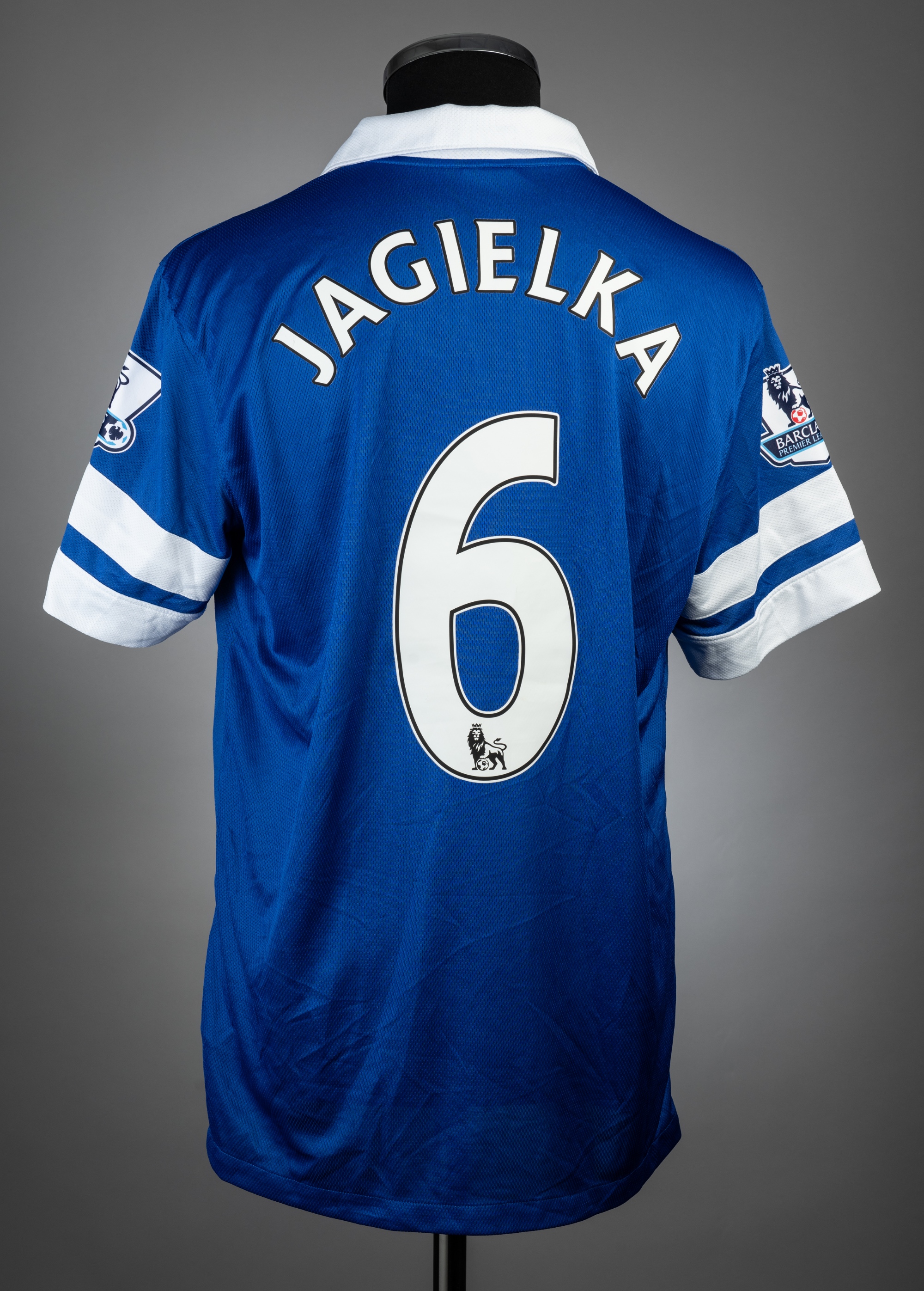 Phil Jagielka blue & white Everton no.6 home jersey, season 2013-14, match-issue, Nike, short-sleeved with BARCLAYS PREMIER LEAGUE sleeve badges, club crest and sponsor logo, reverse lettered JAGIELKA, size L