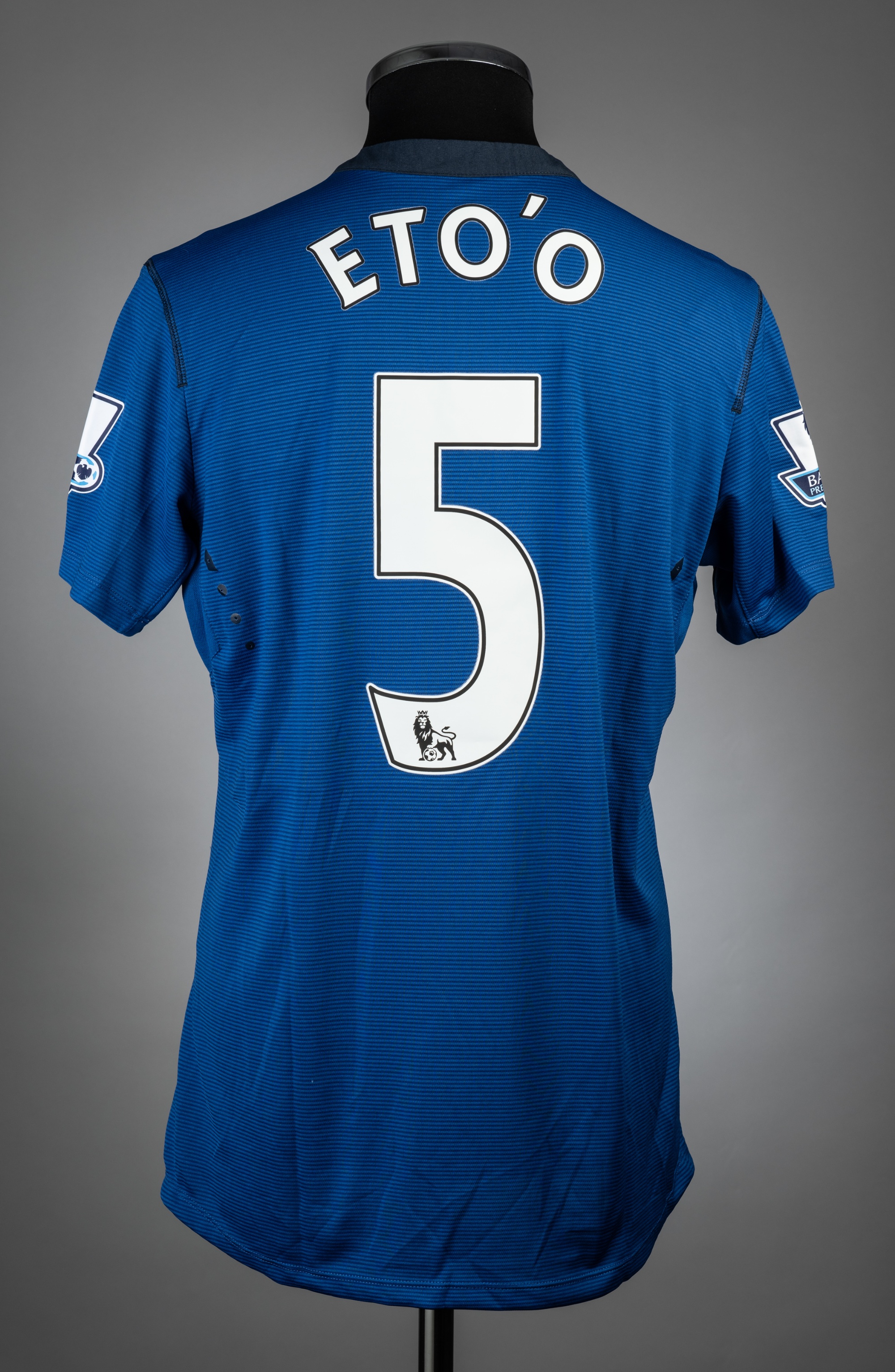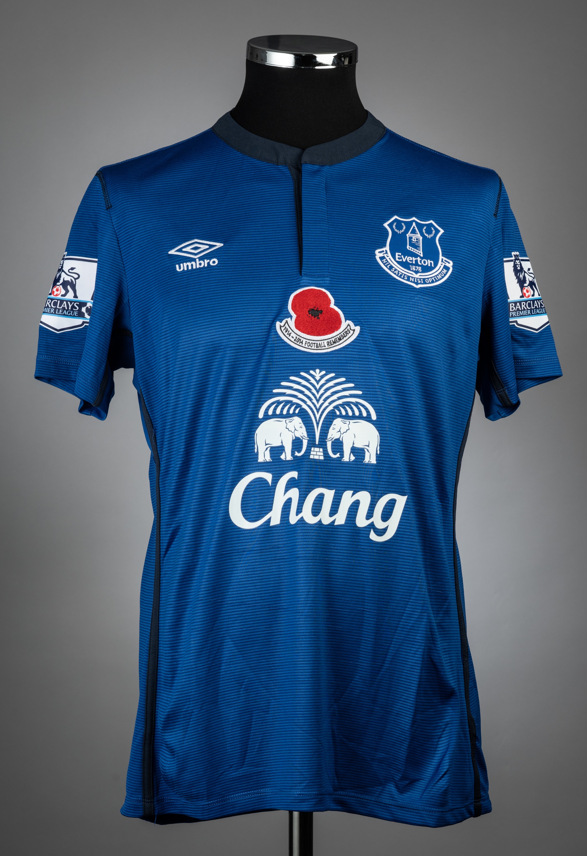 Samuel Eto'o blue Everton no.5 poppy jersey v Sunderland, played at Stadium of Light, 9th November 2014, match-issue, Umbro, short-sleeved with BARCLAYS PREMIER LEAGUE sleeve badges, club crest and sponsor logo, reverse lettered ETO'O, size M This fixture resulted in a 1-1 draw.