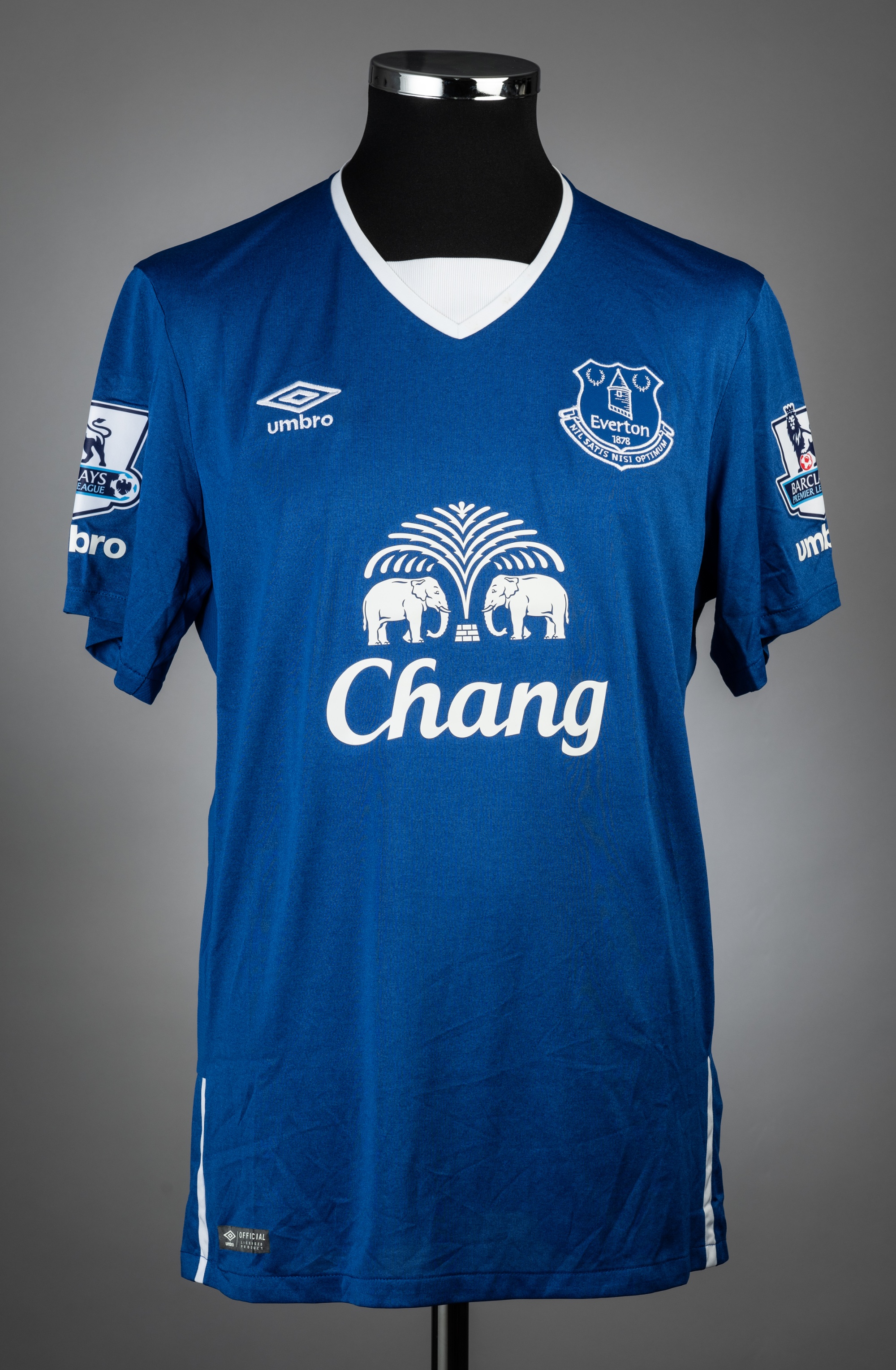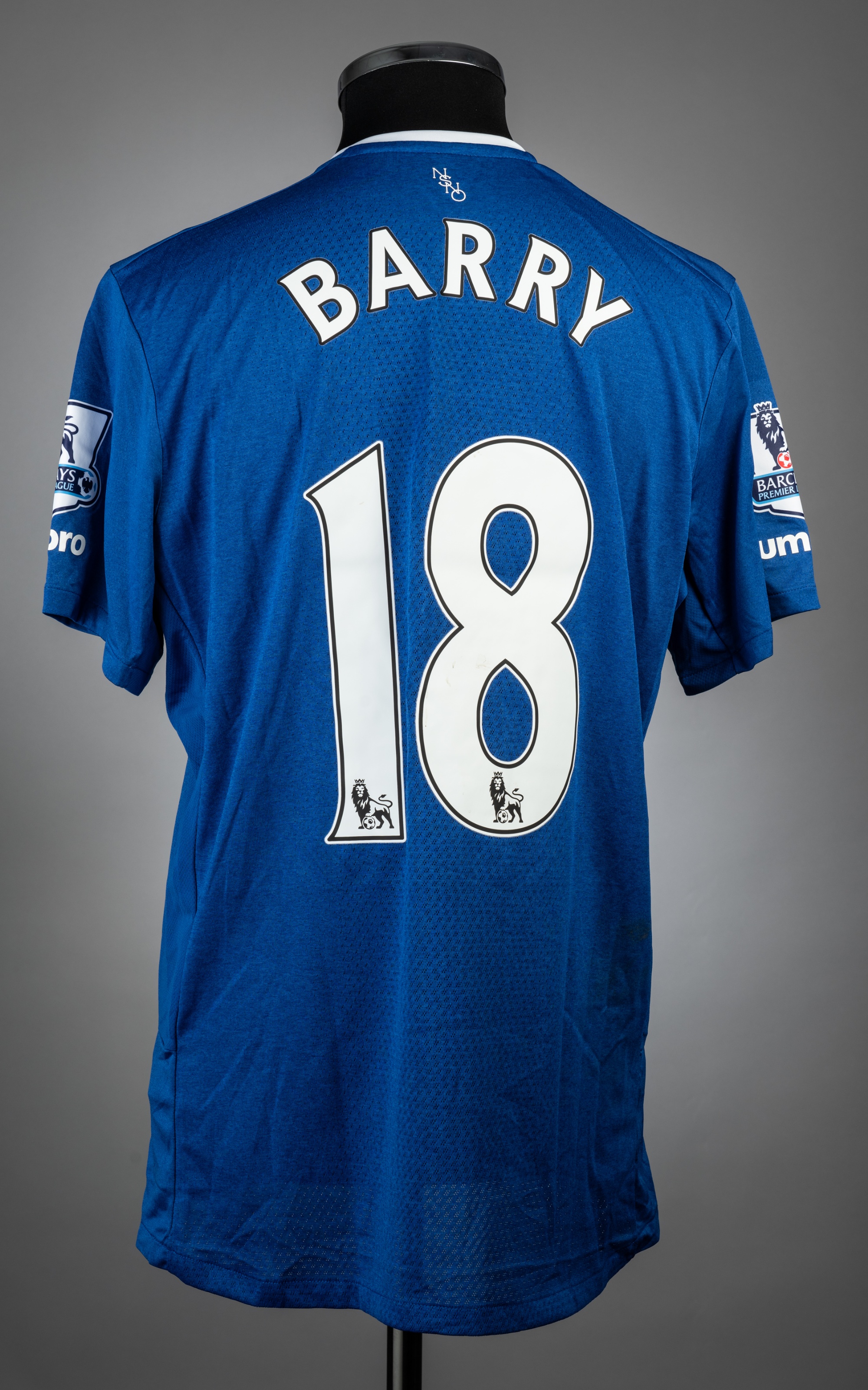 Gareth Barry blue & white Everton no.18 jersey v Manchester City, played at Goodison Park, on 23rd August 2015, match-issue, Umbro, short-sleeved with BARCLAYS PREMIER LEAGUE sleeve badges, club crest and sponsor logo, reverse lettered BARRY, size L Manchester City defeated Everton 2-0.