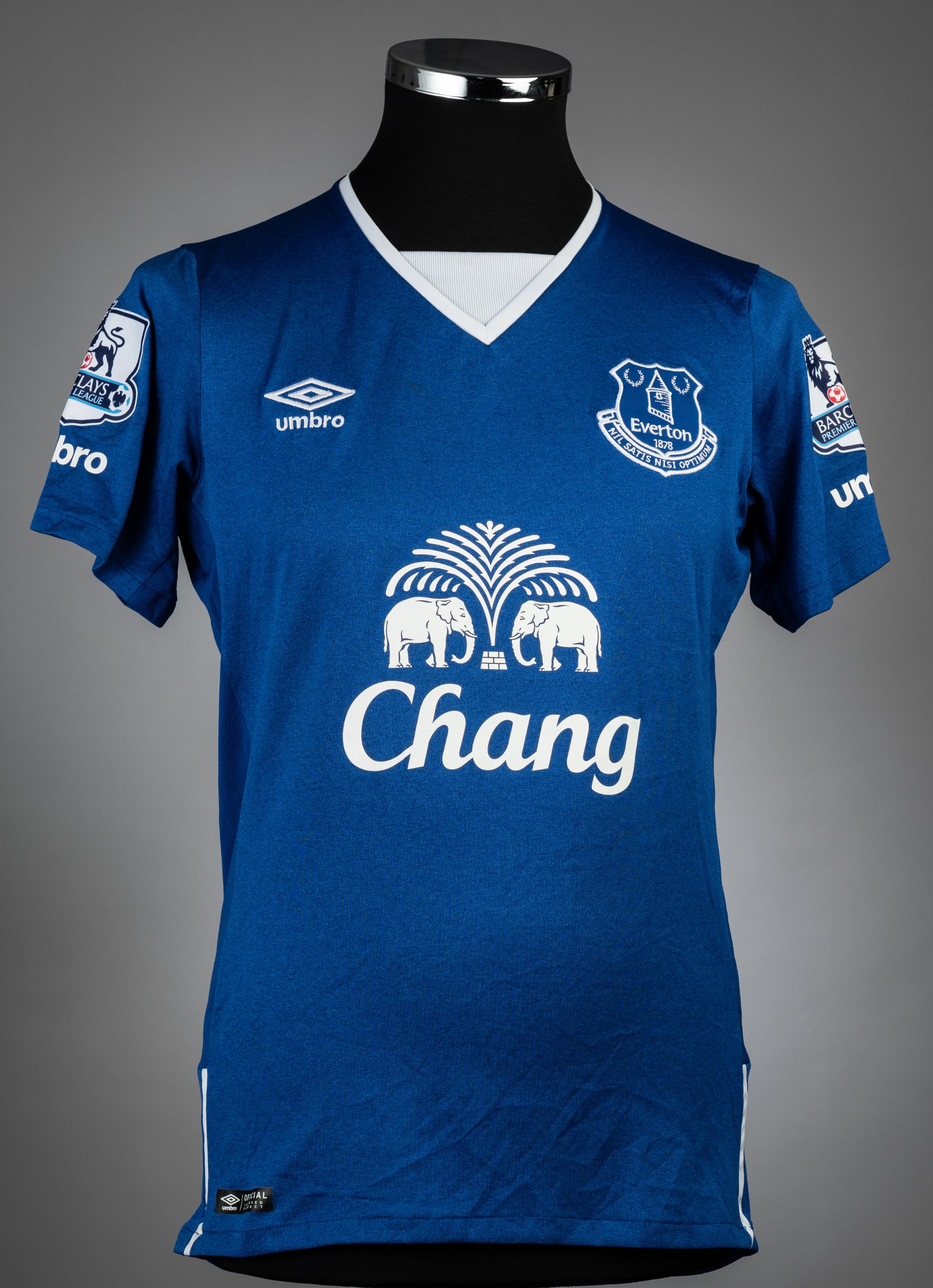 Leighton Baines blue & white Everton no.3 home jersey, season 2015-16, match-issue, Umbro, shorts-sleeved with BARCLAYS PREMIER LEAGUE sleeve badges,
