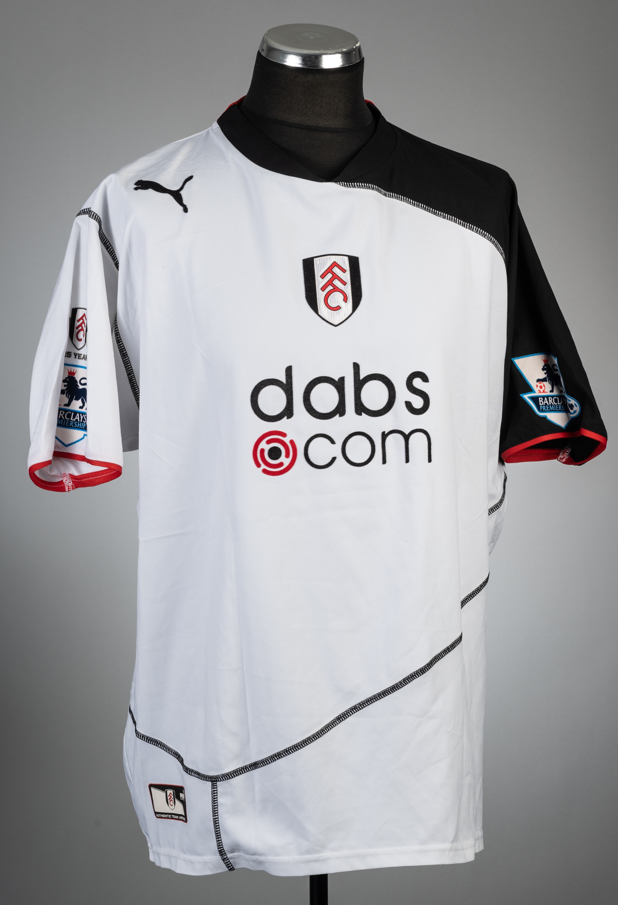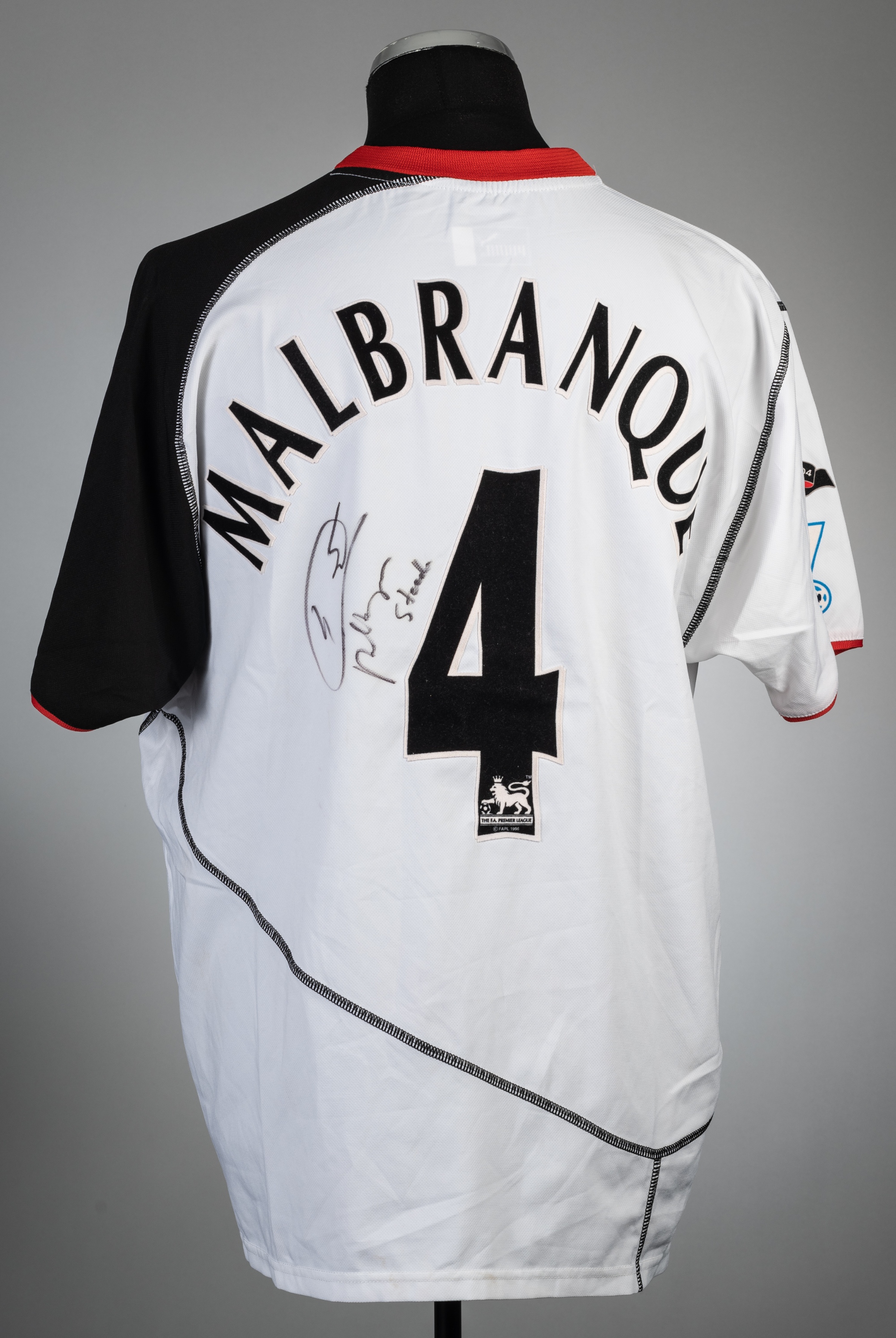 Steed Malbranque signed white Fulham no.4 home jersey, season 2003-04, Puma, short-sleeved with BARCLAYS PREMIERSHIP sleeve badges, club crest and sponsor logo, reverse lettered MALBRANQUE, signed in black marker pen on reverse, size XL