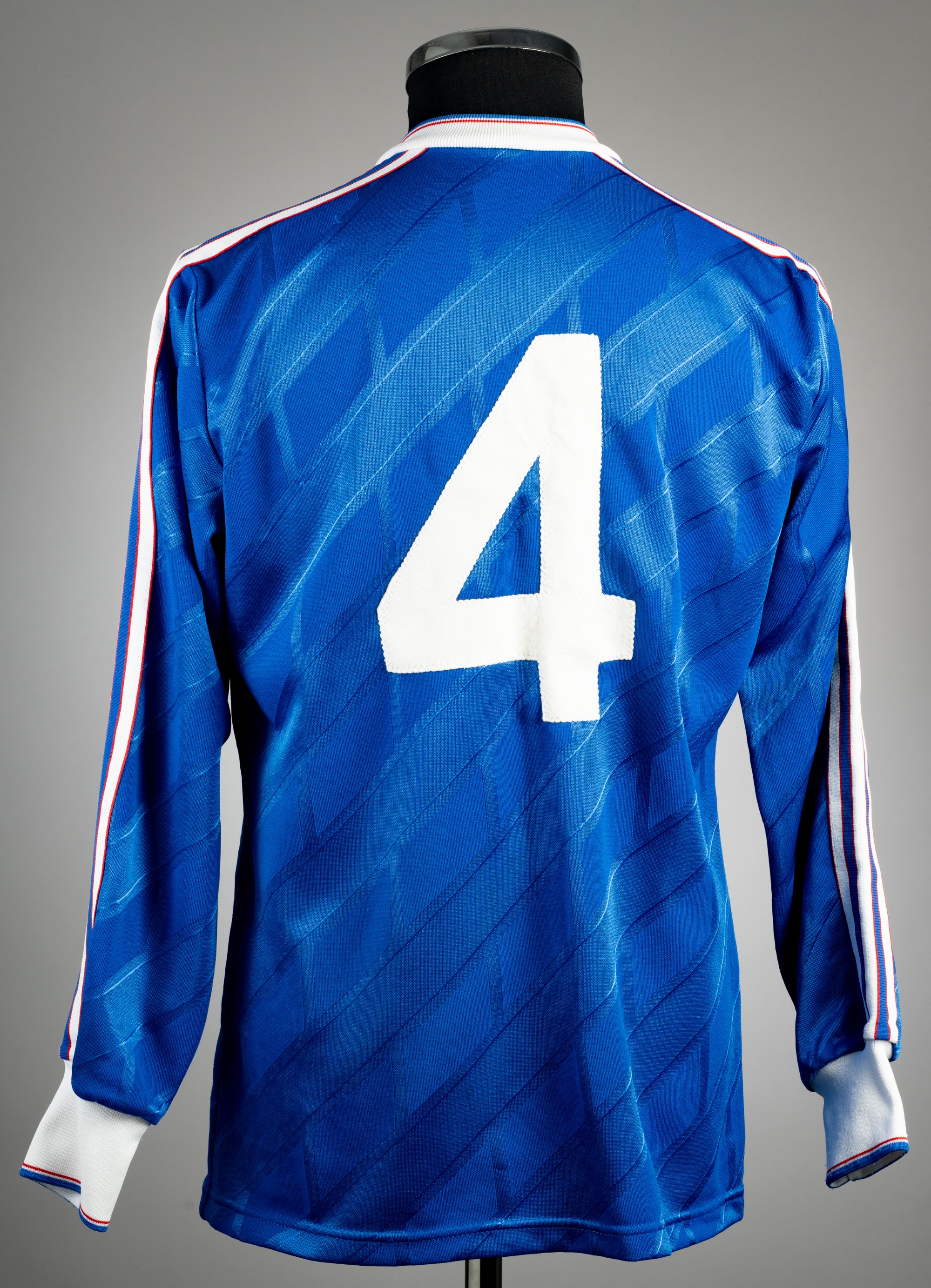 Blue Ipswich Town no.4 home jersey, season 1987-88, Adidas, long-sleeved with embroidered club crest, reverse numbered 4, bears neck label, size Larg