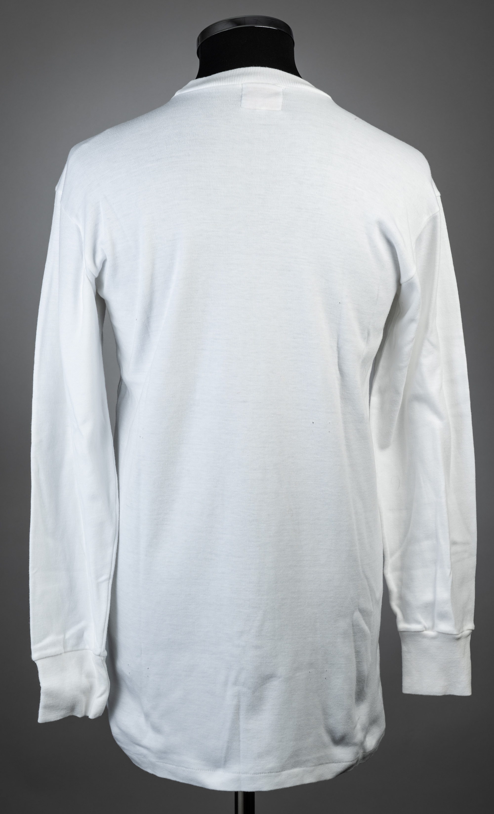 White Leeds United 1965 F.A. Cup Final un-numbered jersey, Umbro, long-sleeved with embroidered club crest and FA CUP FINAL 1965, reverse vacant, No number, bears orange Umbro neck label and OSM label, bears stain to front
