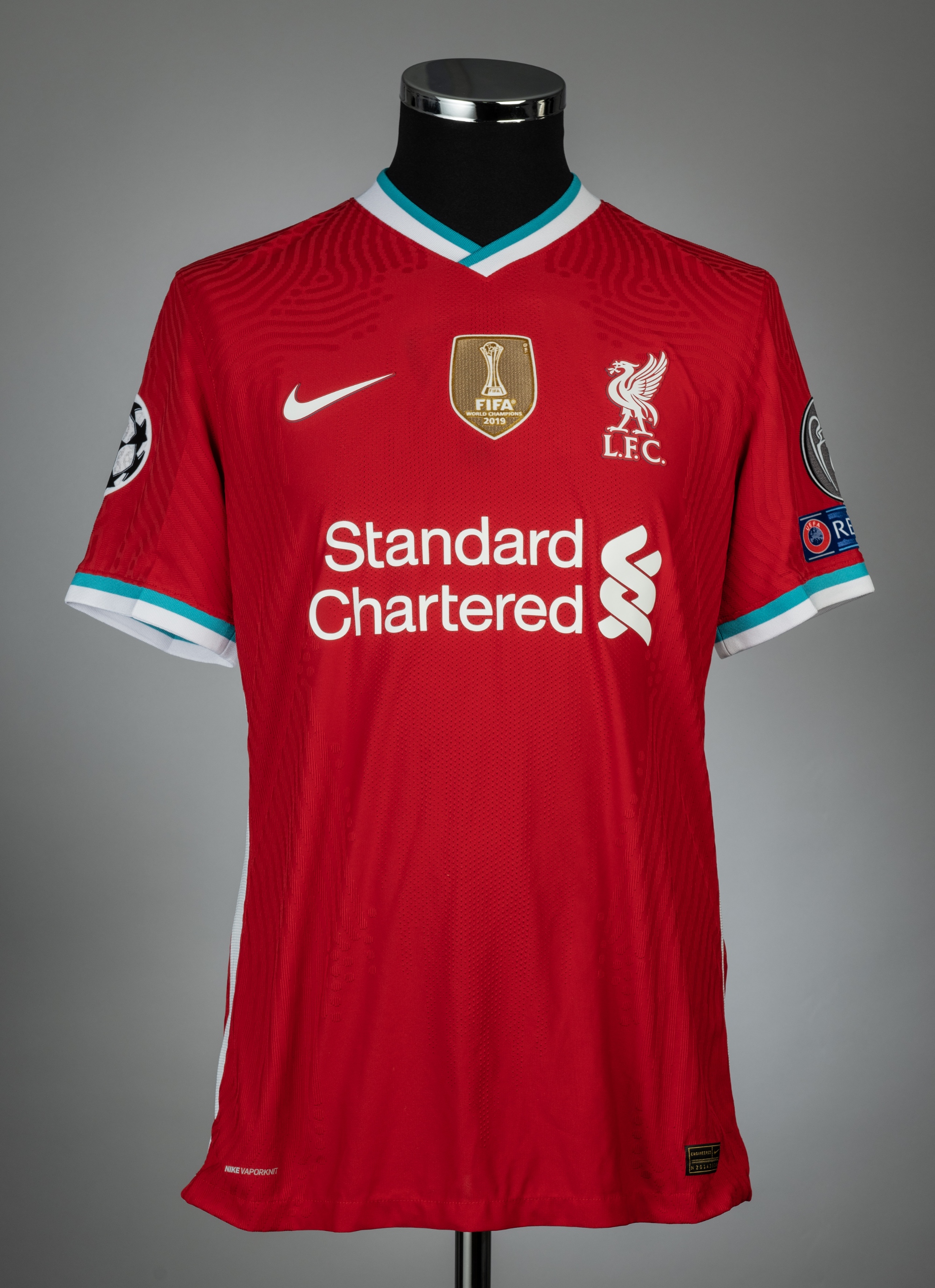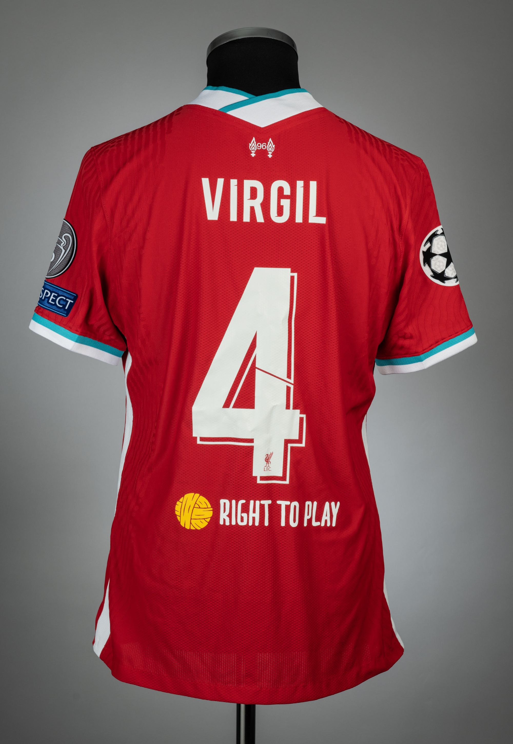 Virgil van Dijk red Liverpool UEFA Champions League no.4 jersey, season 2020-21, match issue, Nike, short-sleeved UEFA STARBALL, CHAMPIONSLEAGUE WINNERS and RESPECT sleeve badges, club crest and sponsor logo, reverse lettered VIRGIL, size L This jersey was match issued but not used due to Virgil being injured during the week before the group stages of the competition.