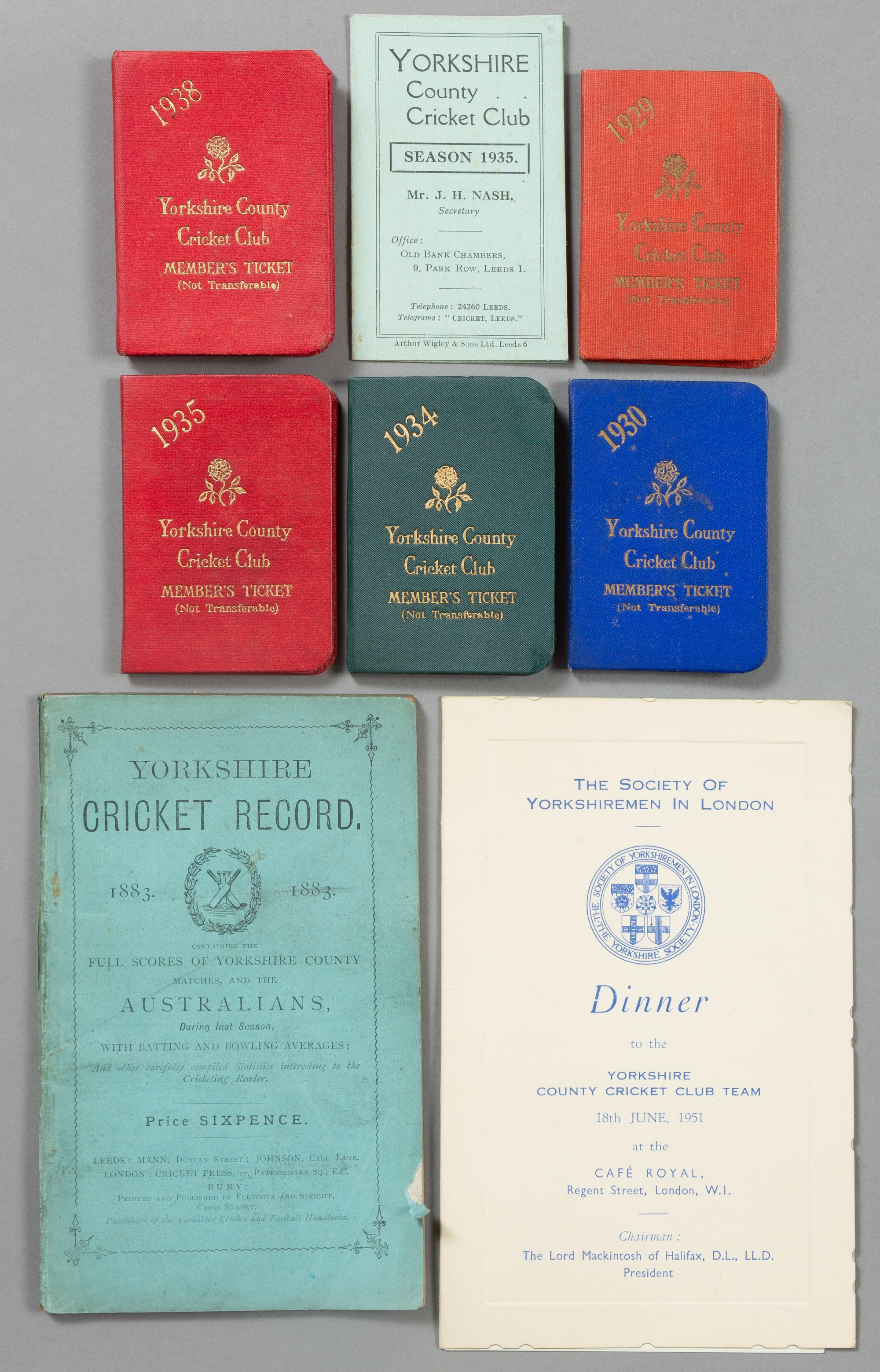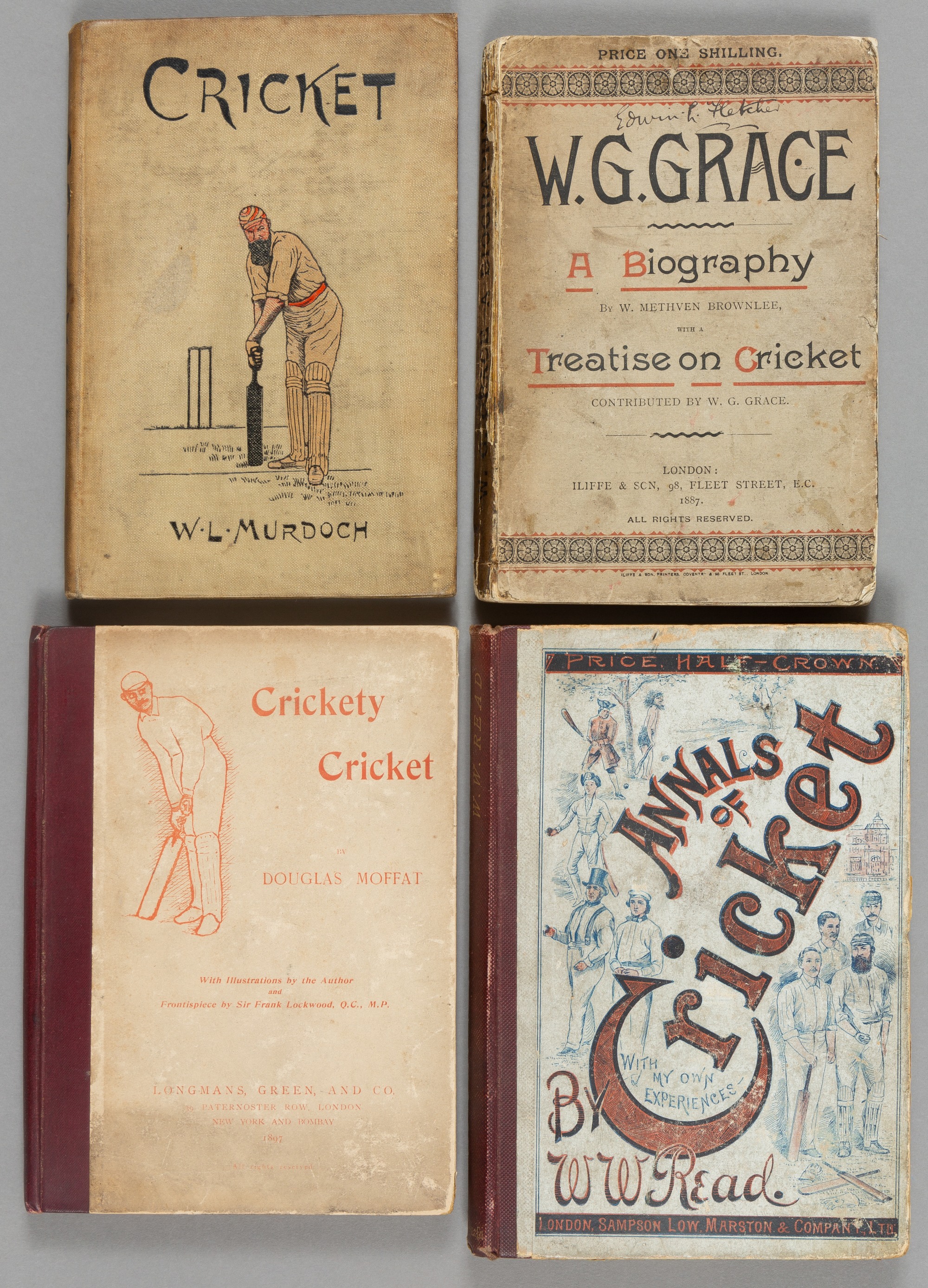 Nine volumes on cricket, The Handbook of Cricket by Edmund Routledge, 1863; Cricket As Now Played by F. D'Arros Planche, 1877, replacement paper wrappers; Cricket Songs by Norman Gale, 3rd Ed., 1896; Crickety Cricket by Douglas Moffat, 1897; Annals of Cricket by W W Read, 1896; The History of A Hundred Centuries, by W.G. Grace and edited by W Yardley, 1895; two copies of W.G. Grace A Biography by W Methven Brownlee, 1887, one lacking the front wrapper; and Cricket by W L Murdoch, 1894; sold together with ephemera of Yorkshire CCC interest, Yorkshire Cricket Record 1883; Member's tickets for 1929, 1930, 1934, 1935 & 1938, and a membership card for 1935; and a dinner menu dated 1951 signed inside by Bob Appleyard