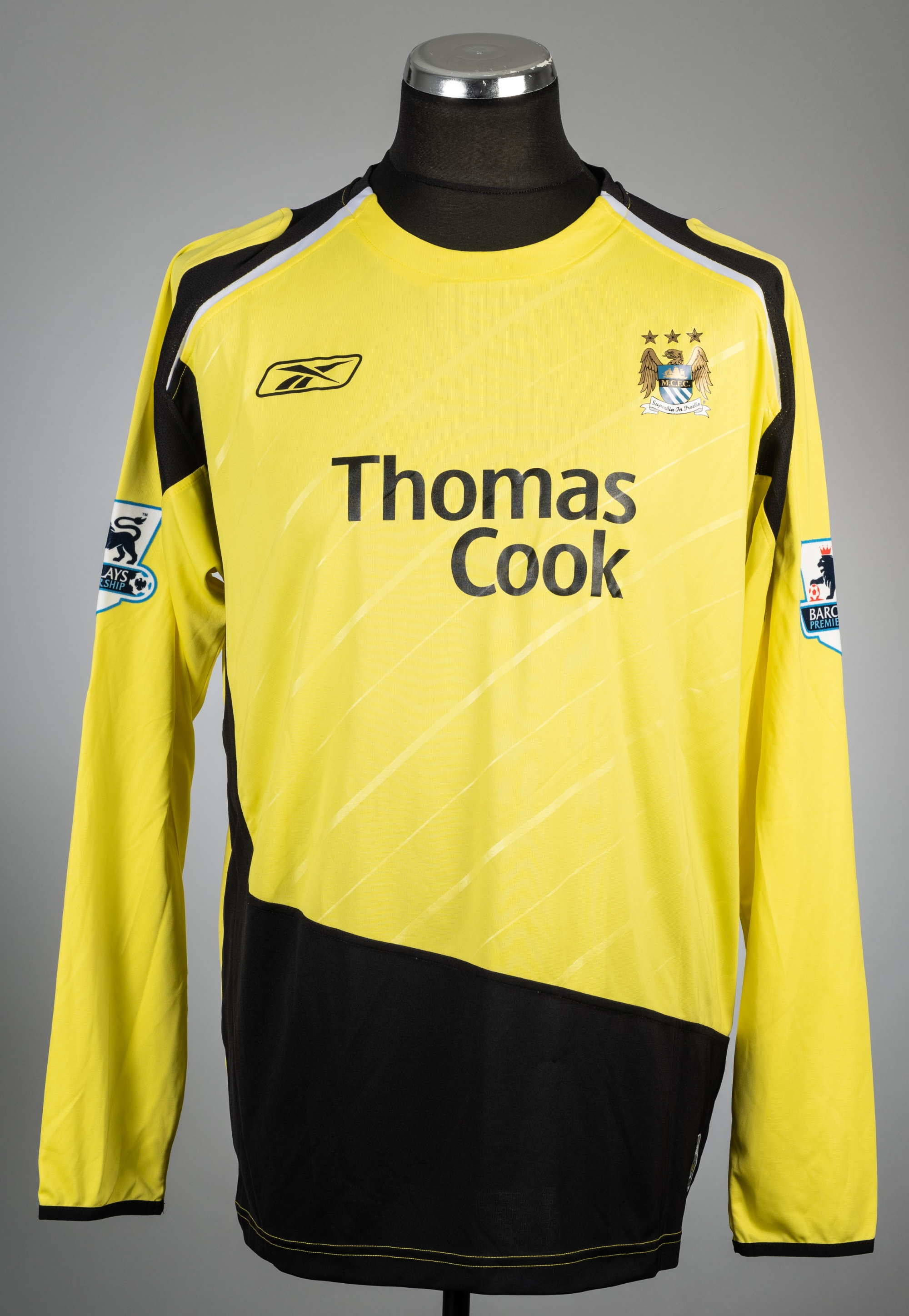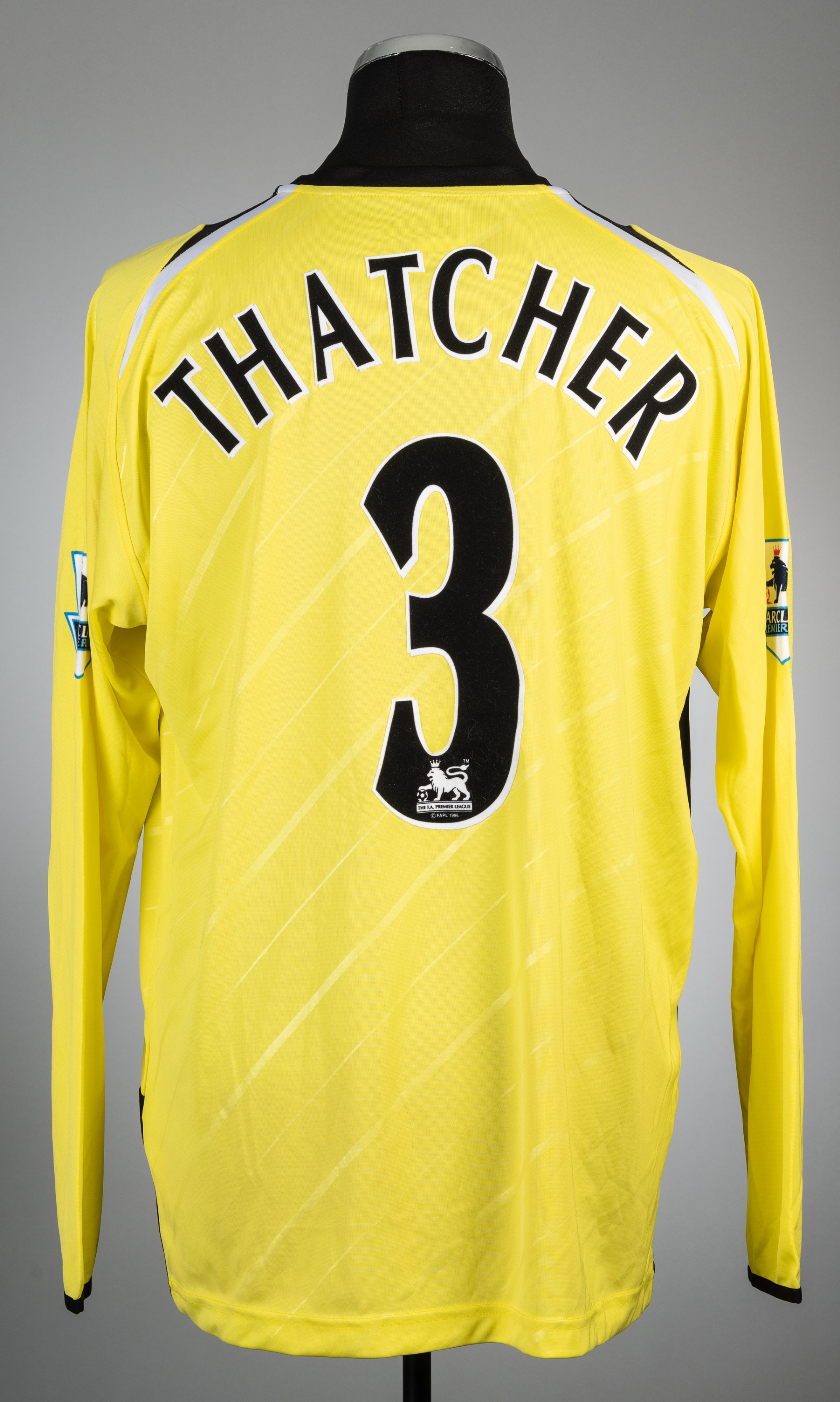 Ben Thatcher yellow Manchester City no.3 third choice jersey, season 2005-06, Reebok, long-sleeved with BARCLAYS PREMIERSHIP sleeve badges, club crest and sponsor logo, reverse lettered THATCHER, size L
