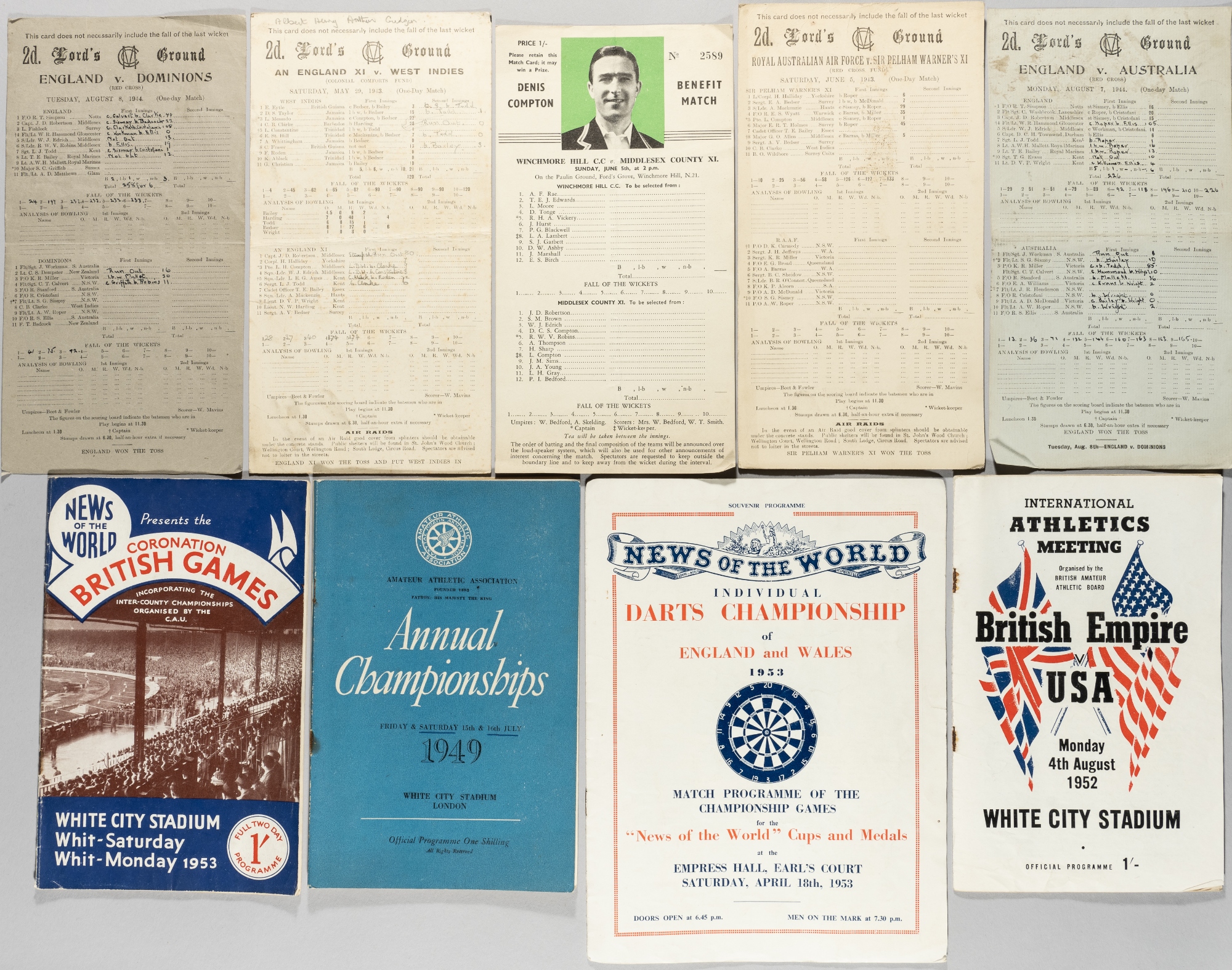 Cricket scorecards and other sports programmes, the scorecards including a number of wartime issues at Lord's, and others from late 1940s and 50s, 38 in total; together with 16 1940s/50s athletics programmes; and other miscellaneous items including ice hockey, darts, football, rugby