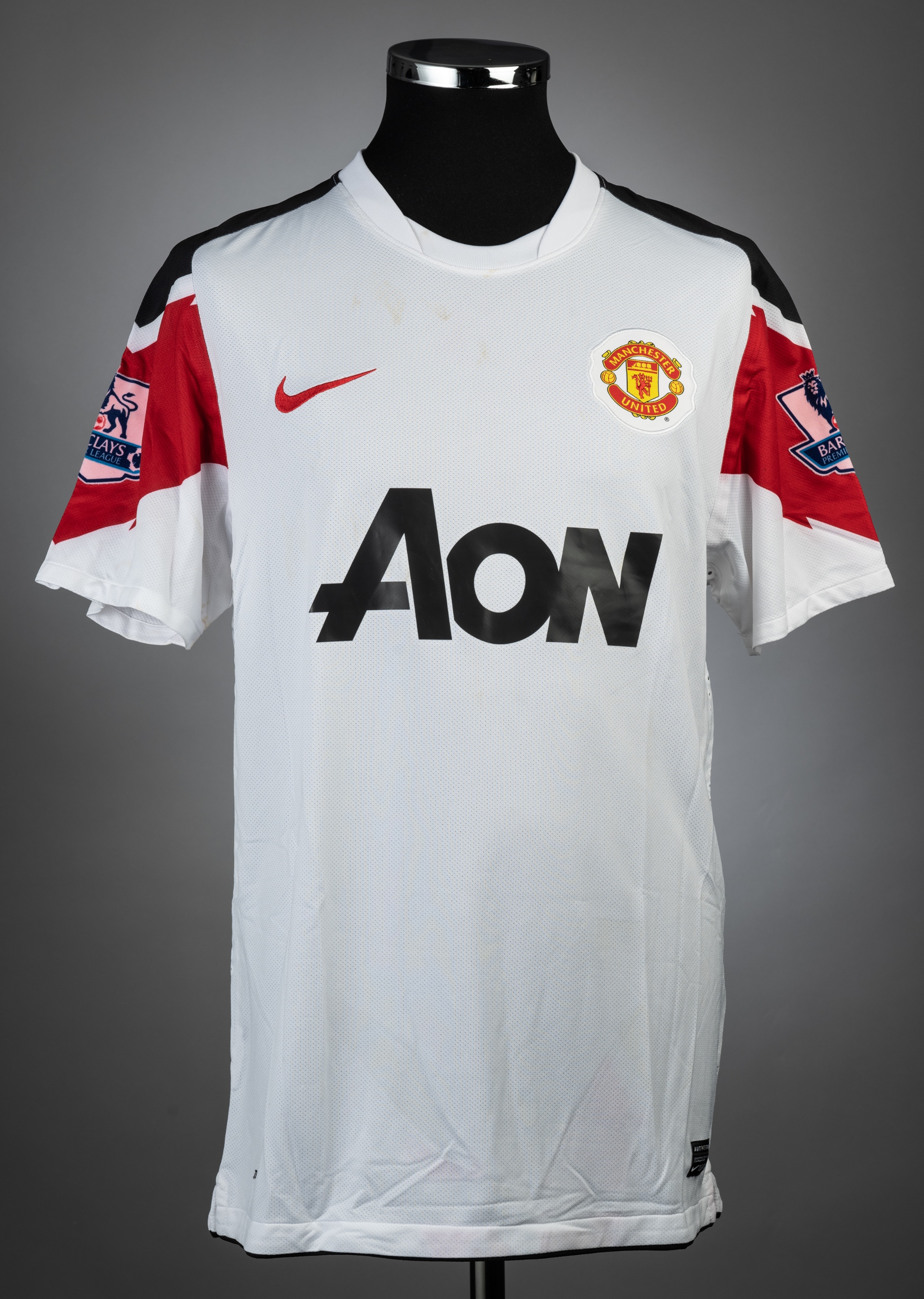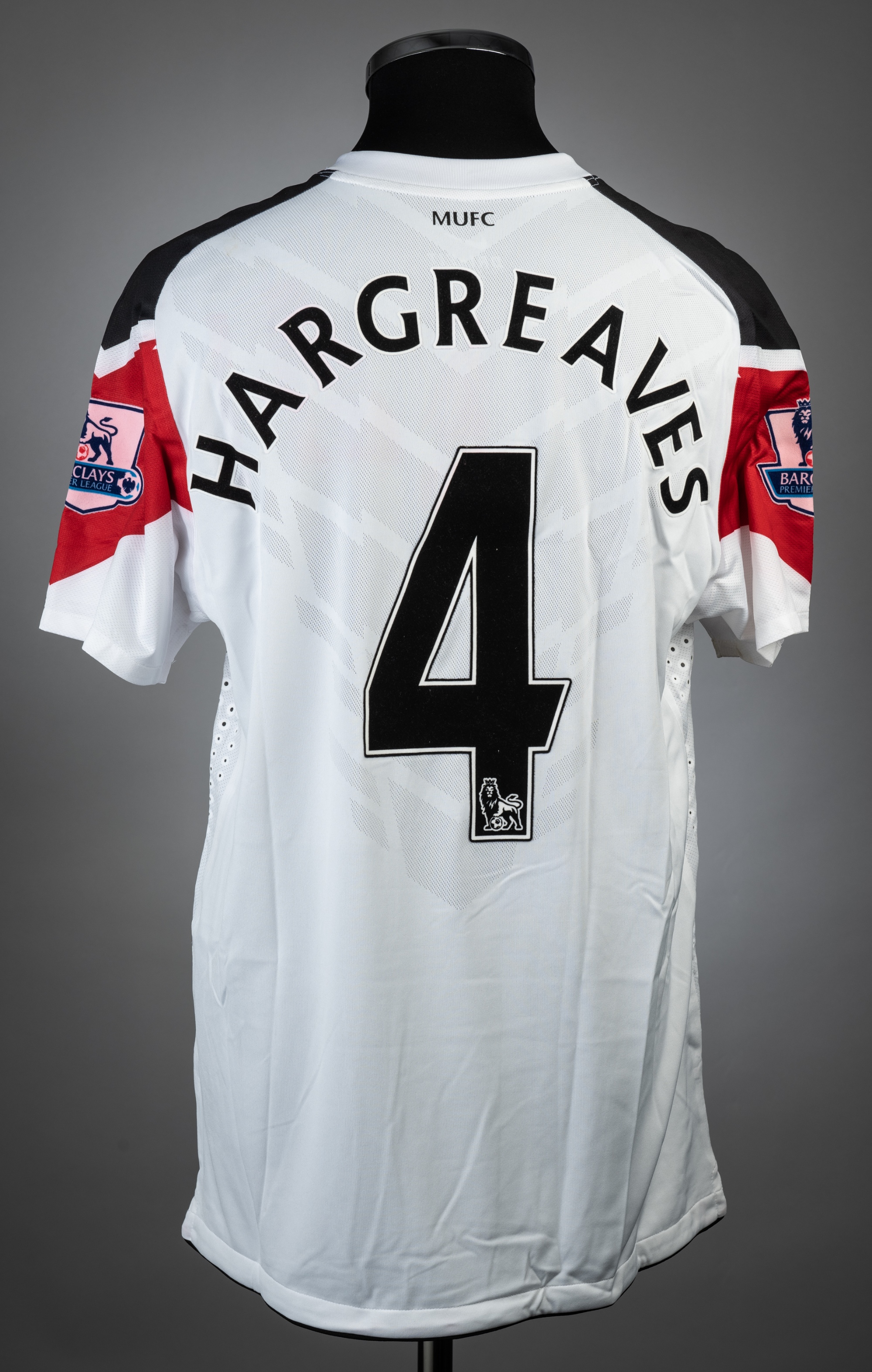 Owen Hargreaves white, red & black Manchester United no.4 away jersey, season 2010-11, match-issue, Nike, short-sleeved with BARCLAYS PREMIER LEAGUE sleeve badges, club crest and sponsor logo, reverse lettered HARGREAVES, size L, bears stains on front and pinkish colour run into sleeve badges