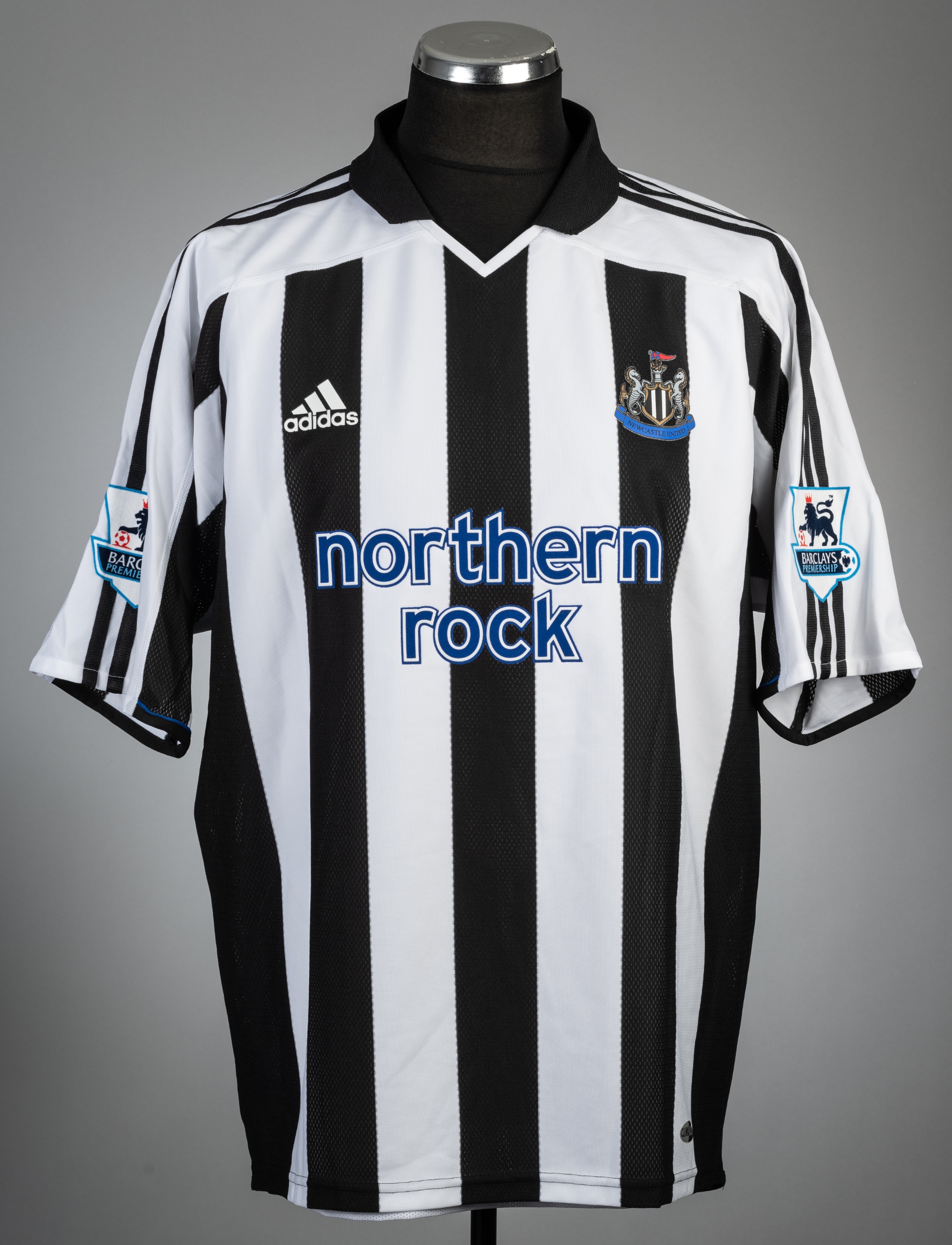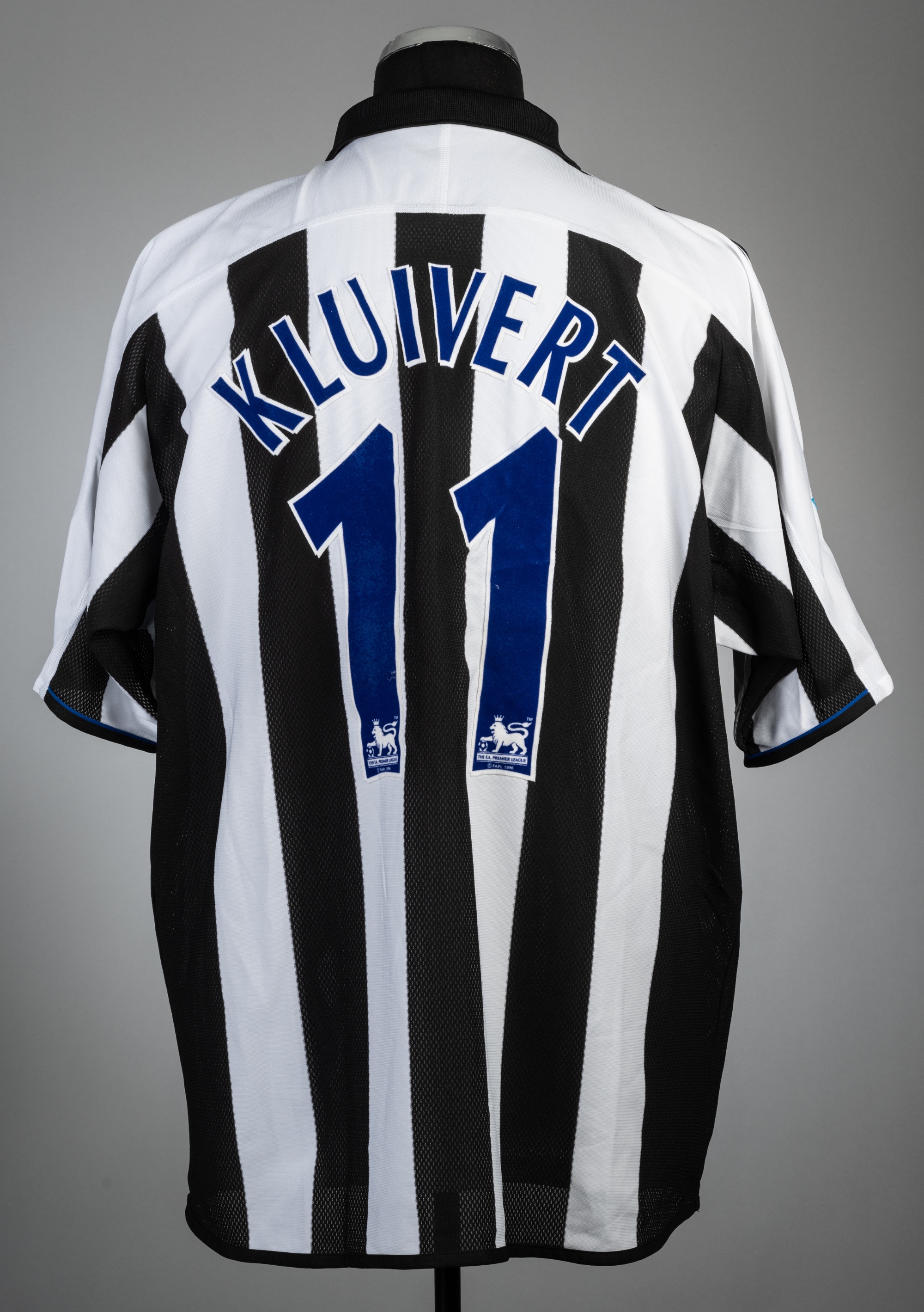 Patrick Kluivert black and white striped Newcastle United no.11 home jersey, season 2004-05, Adidas, short-sleeved with BARCLAYS PREMIERSHIP sleeve badges, club crest and sponsor logo, reverse lettered KLUVERT, size XL