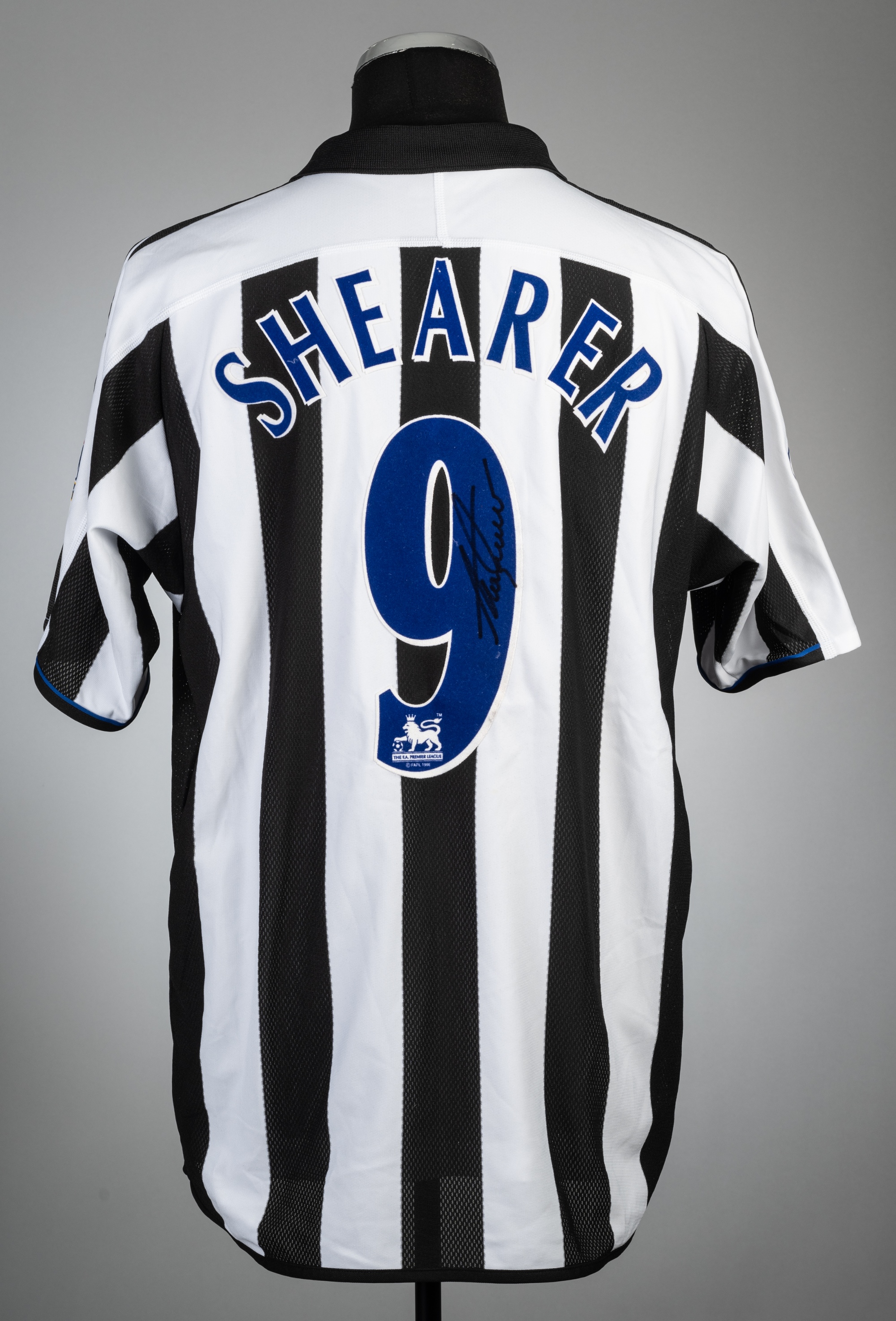 Alan Shearer signed black and white striped Newcastle United no.9 home jersey, season 2004-05, Adidas, short-sleeved with BARCLAYCARD PREMIERSHIP sleeve badges, club crest and sponsor logo, reverse lettered SHEARER, signed in black marker pen on number nine on reverse, size L