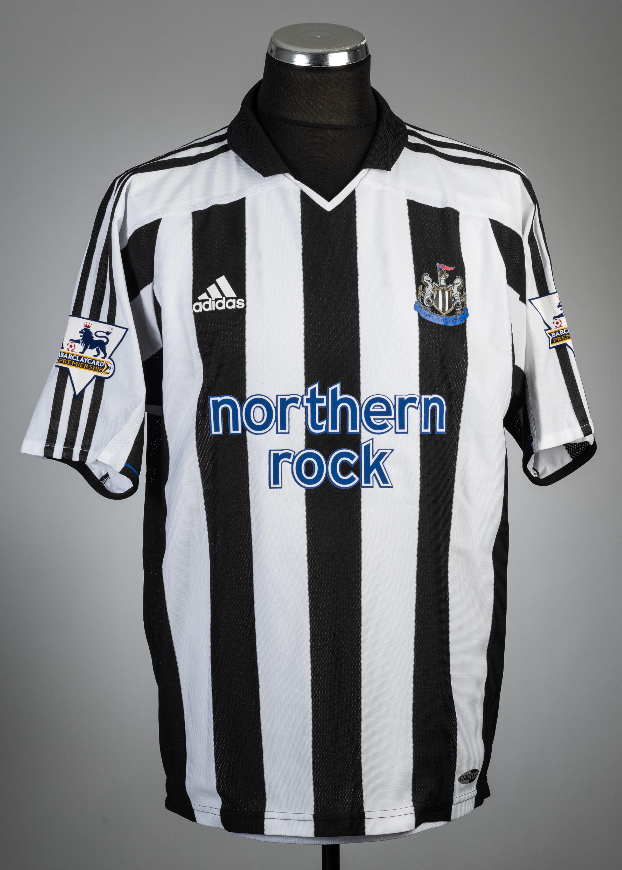 Alan Shearer signed black and white striped Newcastle United no.9 home jersey, season 2004-05, Adidas, short-sleeved with BARCLAYCARD PREMIERSHIP sle