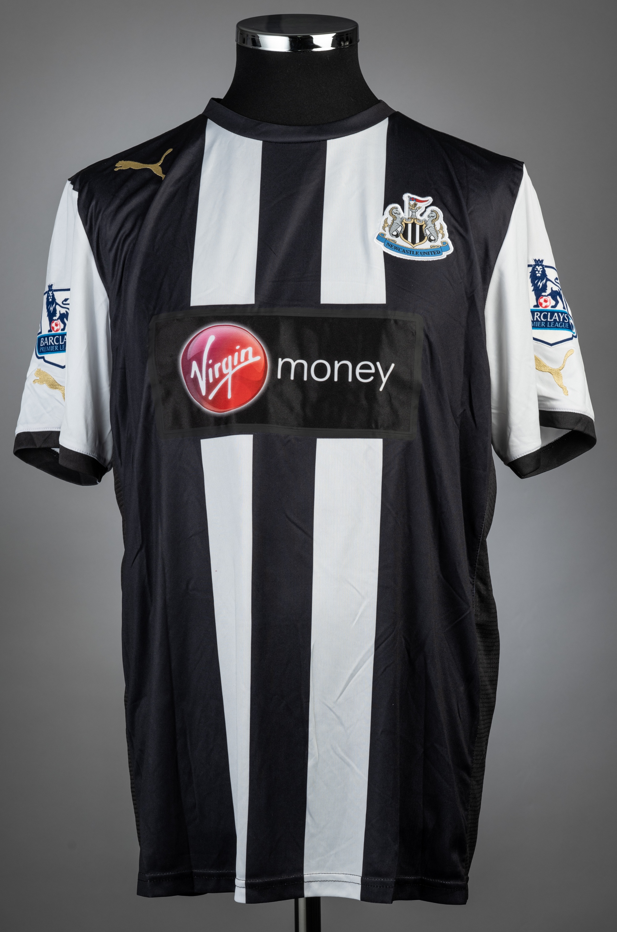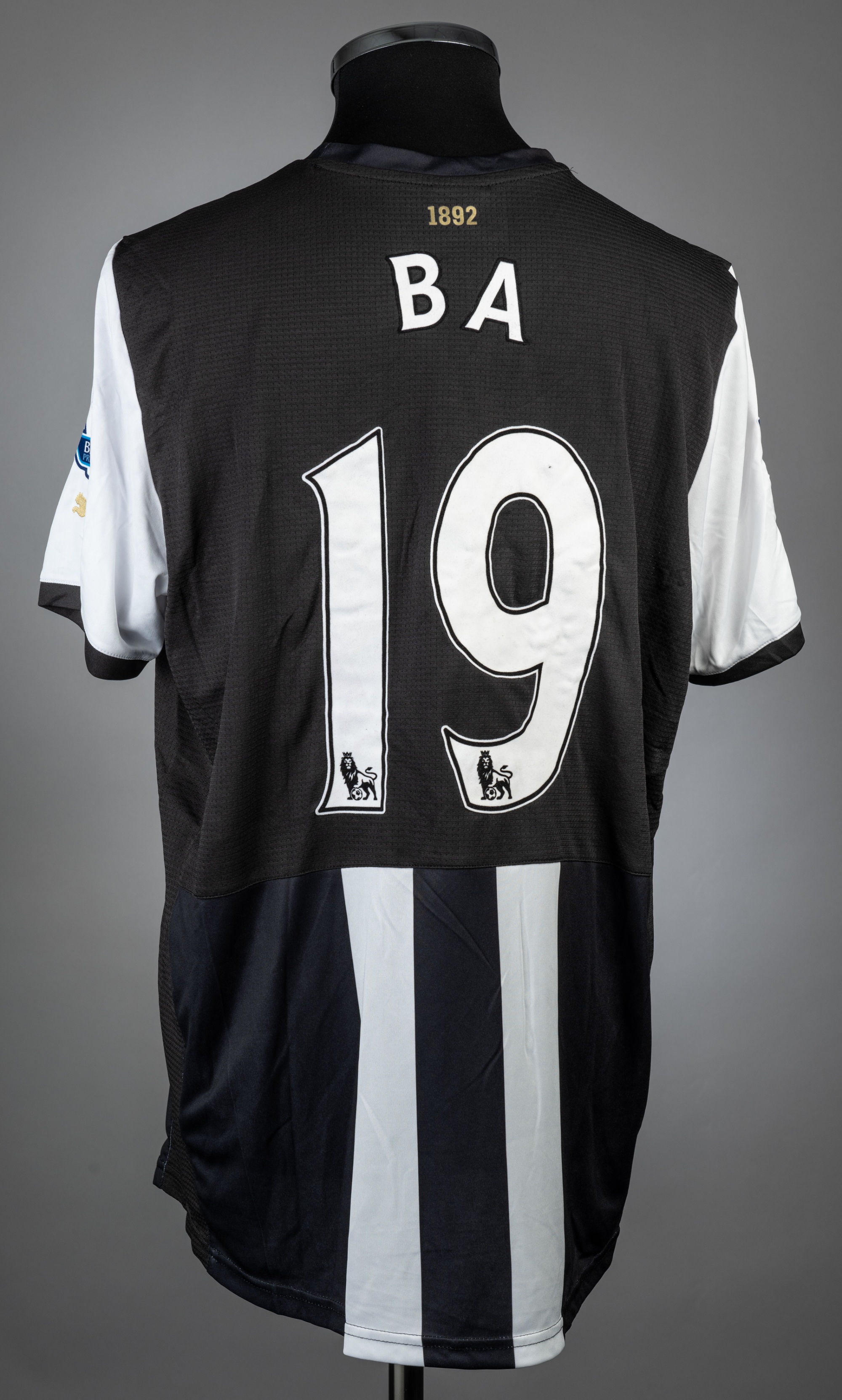 Demba Ba black & white striped Newcastle United no.19 jersey v Manchester City, played at St James' Park, 6th May 2012, match-issue, Puma, short-sleeved with BARCLAYS PREMIER LEAGUE sleeve badges, club crest and sponsor logo, reverse lettered BA, size L Manchester City defeated Newcastle United 2-0.