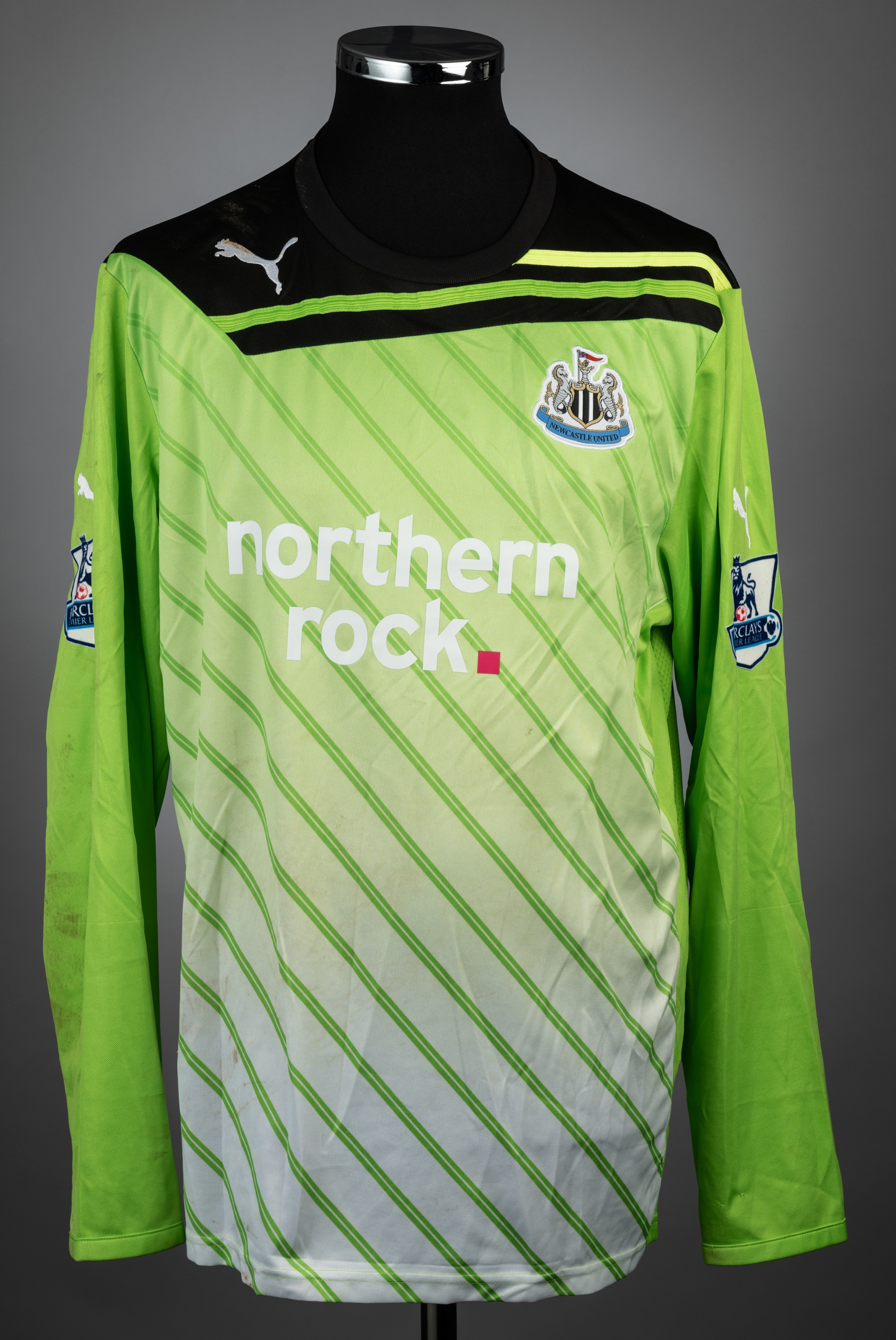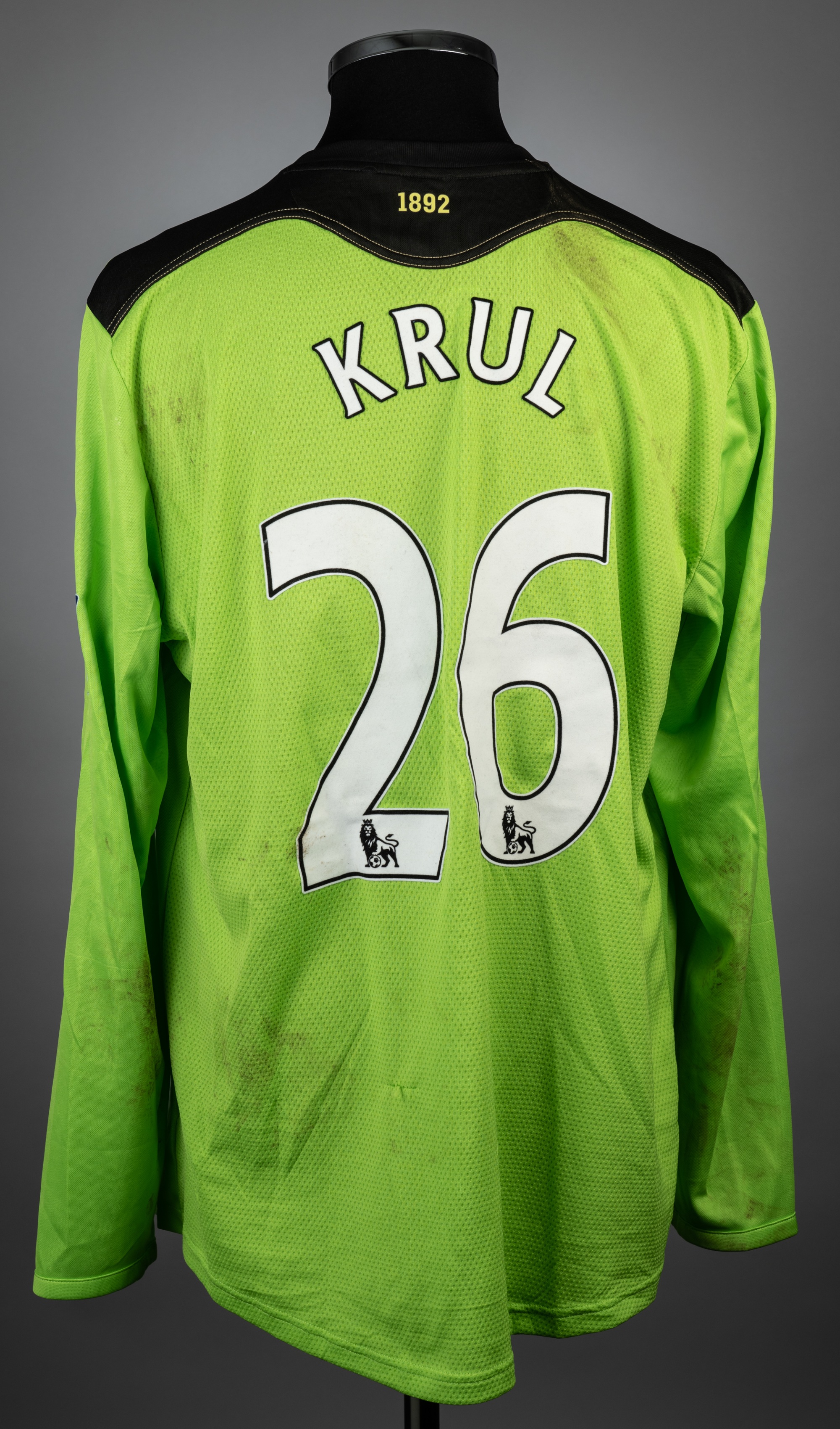 Tim Krul lime green & black Newcastle United no.26 goalkeeping jersey, season 2011-12, match-issue, Puma, long-sleeved with BARCLAYS PREMIER LEAGUE sleeve badges, club crest and sponsor logo, reverse lettered KRUL, size XL, bears pitch marks to sleeves, front and reverse
