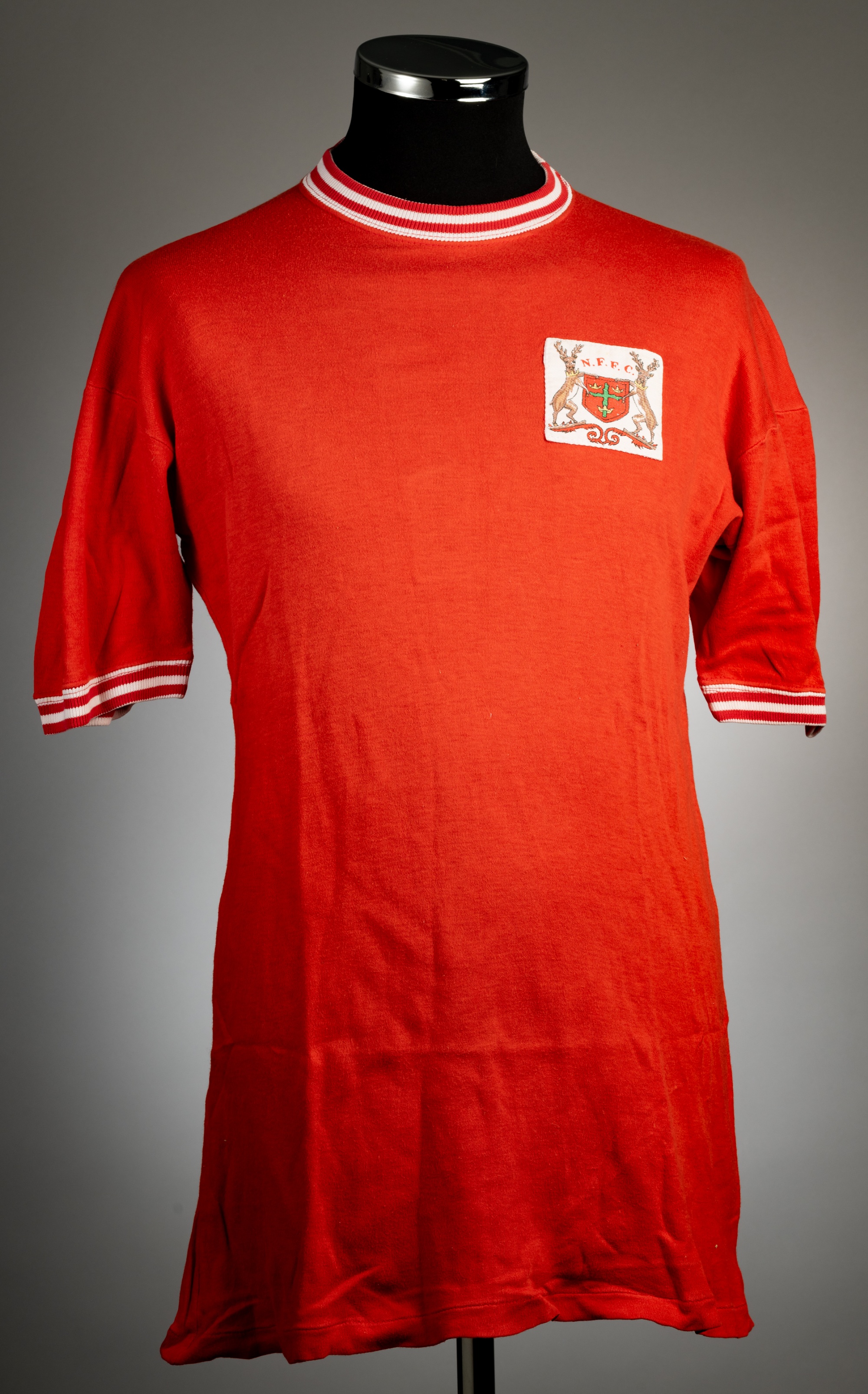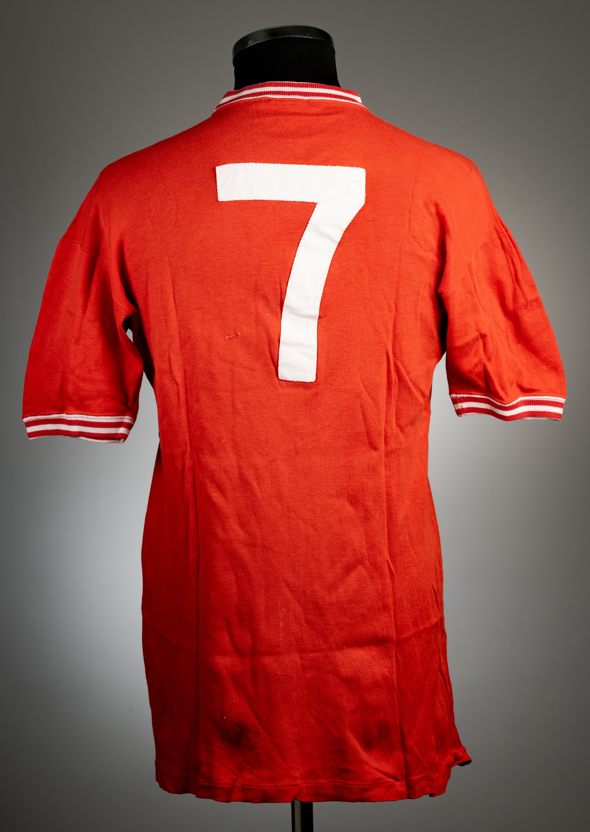 Red Nottingham Forrest no.7 home jersey, circa 1968, Umbro, short-sleeved, elasticated round neck collar and cuffs, with white hoops, embroidered cloth badge, good condition