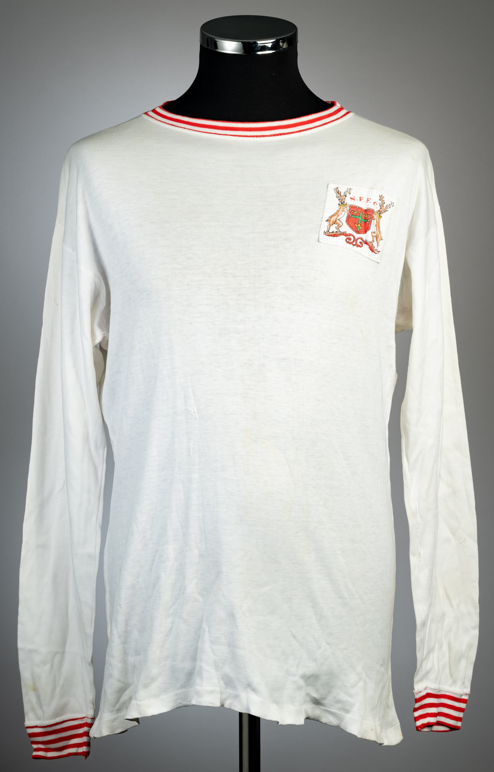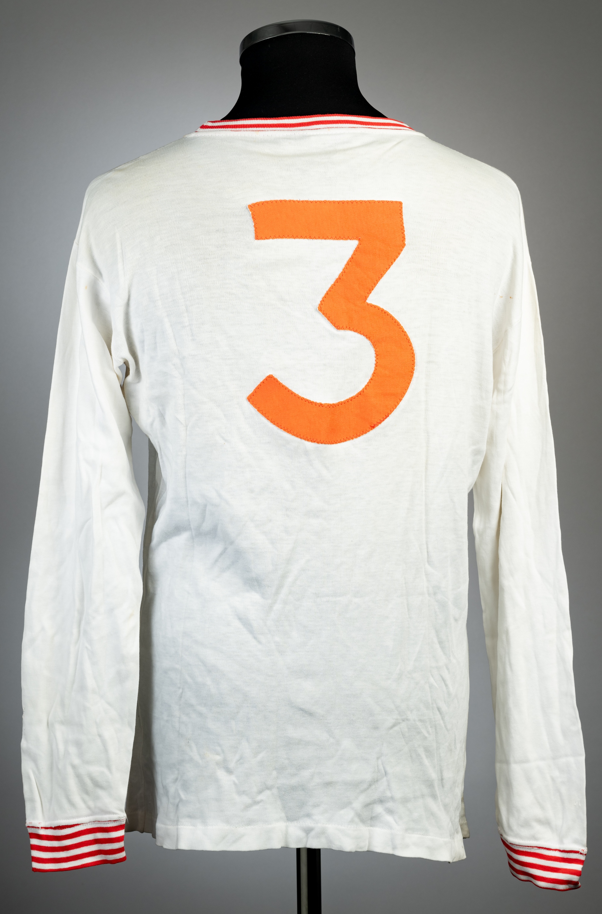 White Nottingham Forrest no.3 away jersey, circa 1970, Umbro 'Aztec', long-sleeved with red and white elasticated collar and cuffs, club crest badge, minor tear to right should sleeve and minor stains