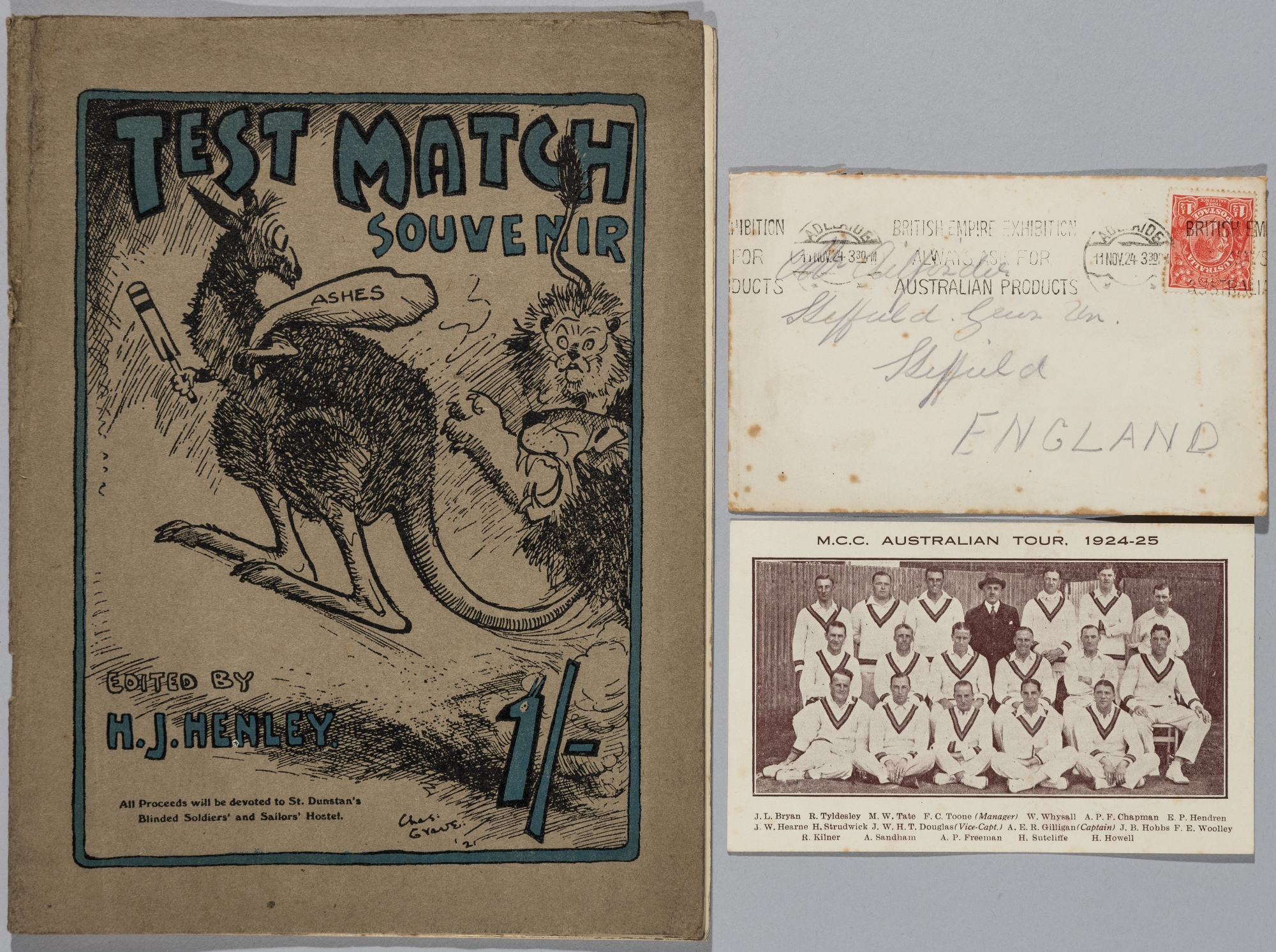 Ashes Test Match souvenir programme 1921, edited by H J Henley, 32-page programme with pictorial cover of a lion and kangaroo; sold together with a MCC Australian tour 1924-25 Christmas postcard, the front with photograph of the Australia team with legend, reverse pencil annotation, together with stamped envelope, each bearing minor wear, (2)