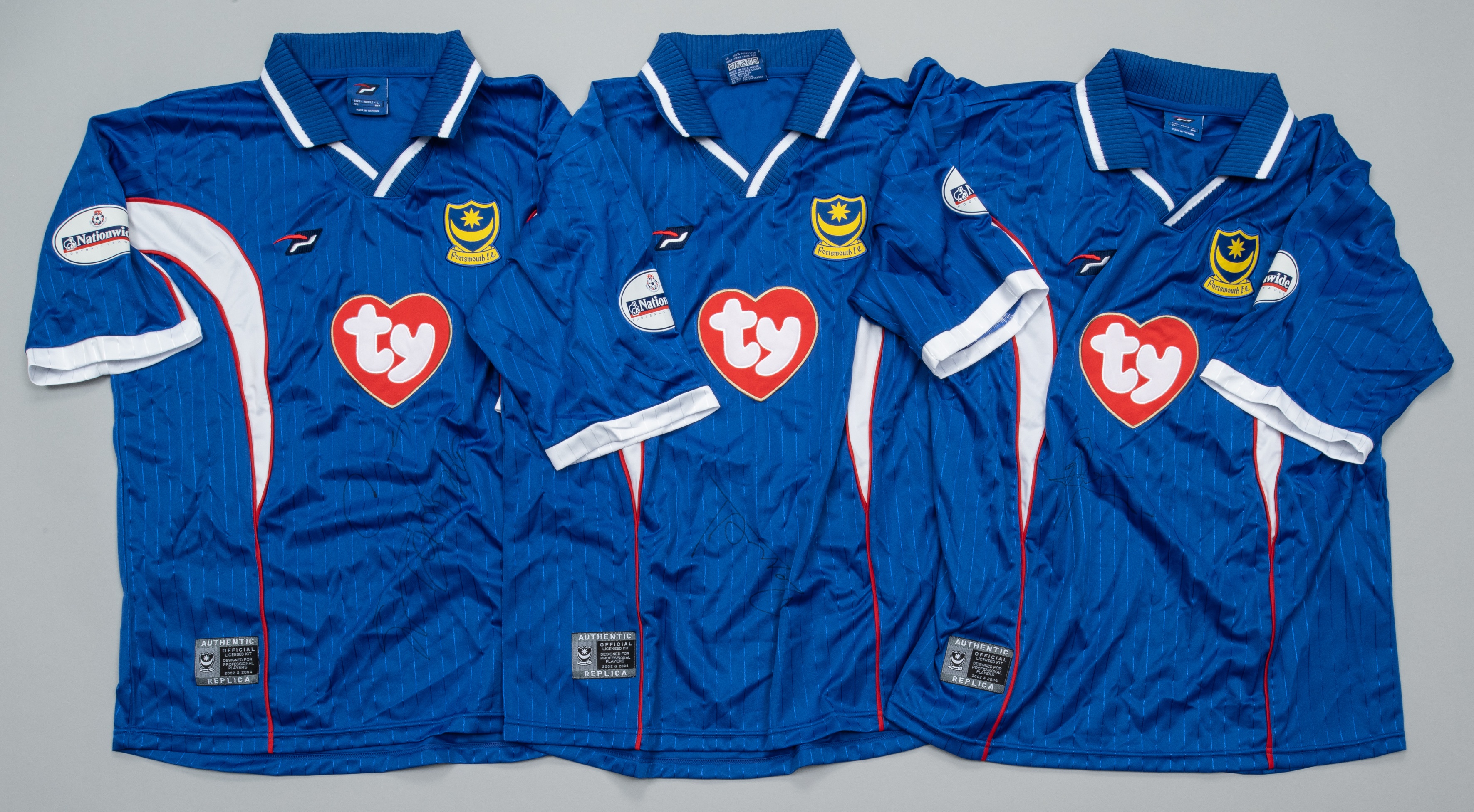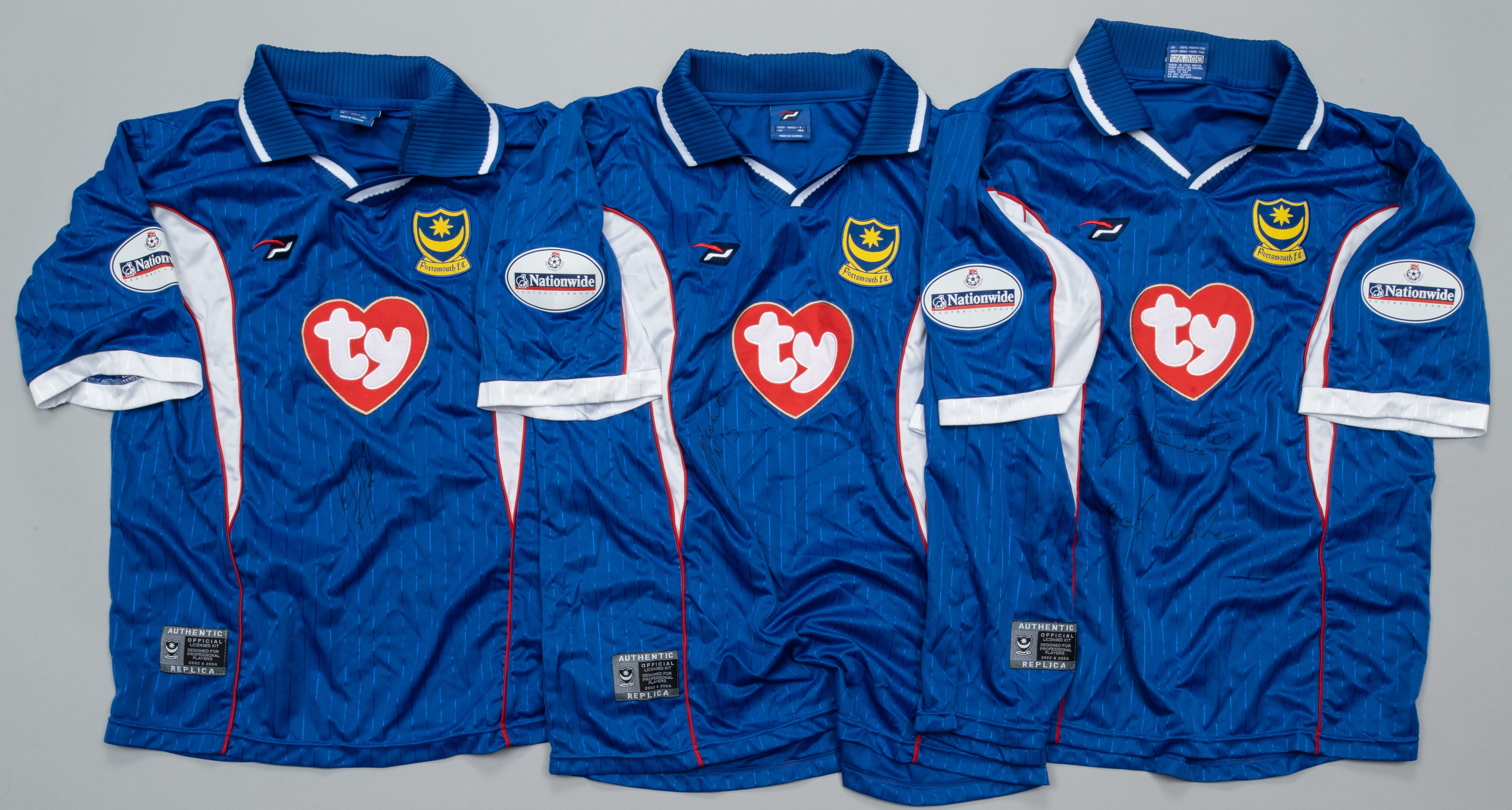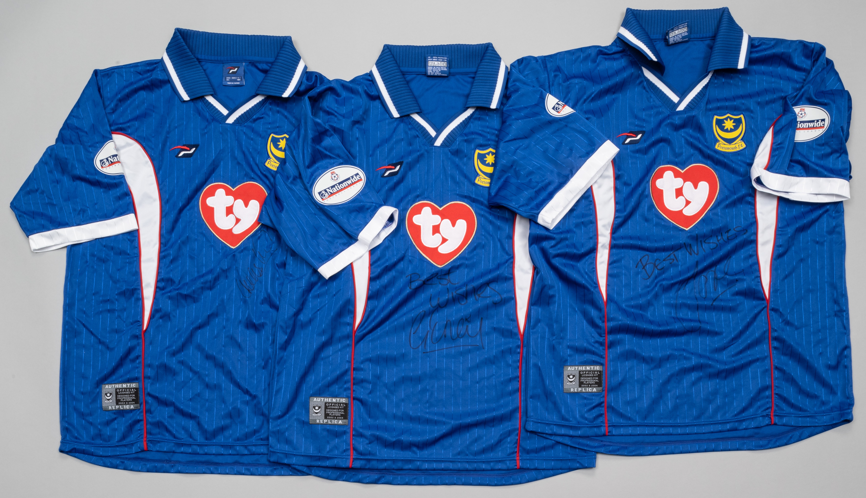 A collection of nine player-signed Portsmouth FC blue home match jerseys from season 2002-03, comprising Nigel Quashie no. 11 jersey, Pompey Sport, short-sleeved with THE FOOTBALL LEAGUE NATIONWIDE FOOTBALL LEAGUE sleeve badges, club crest badge, sponsor logo, reverse lettered QUASHIE, signed in fine black marker pen to front, size L; Gary O'Neill no.26 jersey, Pompey sport, short-sleeved with THE FOOTBALL LEAGUE NATIONWIDE FOOTBALL LEAGUE sleeve badges, club crest badge, sponsor logo, reverse lettered O'NEILL, signed in black marker pen to front, size L; Hayden Foxe no.5 jersey, Pompey Sport, short-sleeved with THE FOOTBALL LEAGUE NATIONWIDE FOOTBALL LEAGUE sleeve badges, club crest badge, sponsor logo, reverse lettered FOXE, signed in black marker pen on front, size L; Lassina Diabate no.13 jersey, Pompey Sport, short-sleeved with THE FOOTBALL LEAGUE NATIONWIDE FOOTBALL LEAGUE sleeve badges, club crest badge, sponsor logo, reverse lettered DIABATE, signed in fine black marker pen to front, size L; Yakubu no.20 jersey, Pompey sport, short-sleeved with THE FOOTBALL LEAGUE NATIONWIDE FOOTBALL LEAGUE sleeve badges, club crest badge, sponsor logo, reverse lettered YAKUBU, signed in fine black marker pen to front, size L; Gianluca Festa no.35 jersey, Pompey Sport, short-sleeved with THE FOOTBALL LEAGUE NATIONWIDE FOOTBALL LEAGUE sleeve badges, club crest badge, sponsor logo, reverse lettered FESTA, signed in fine black marker pen on front, size L; Vincent Pericard no. 17 jersey, Pompey Sport, short-sleeved with THE FOOTBALL LEAGUE NATIONWIDE FOOTBALL LEAGUE sleeve badges, club crest badge, sponsor logo, reverse lettered PERICARD, signed in fine black marker pen to front, size L; Svetoslav Todorov no.9 jersey, Pompey sport, short-sleeved with THE FOOTBALL LEAGUE NATIONWIDE FOOTBALL LEAGUE sleeve badges, club crest badge, sponsor logo, reverse lettered TODOROV, signed in fine black marker pen to front, size L; Arjan de Zeeuw no.6 jersey, Pompey Sport, short-sleeved with THE FOOTBALL LEAGUE NATIONWIDE FOOTBALL LEAGUE sleeve badges, club crest badge, sponsor logo, reverse lettered DE ZEEUW, signed in fine black marker pen on front, size L