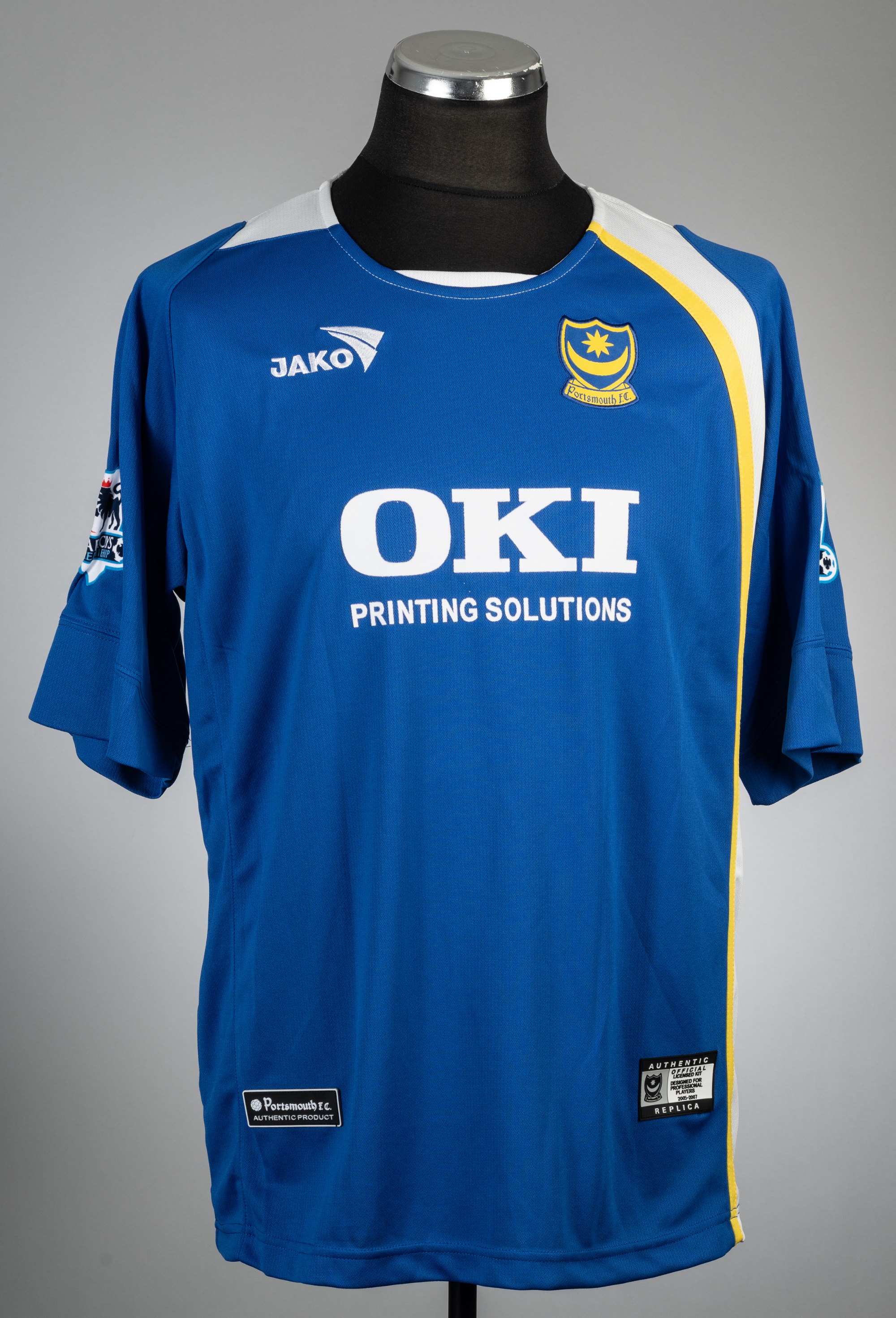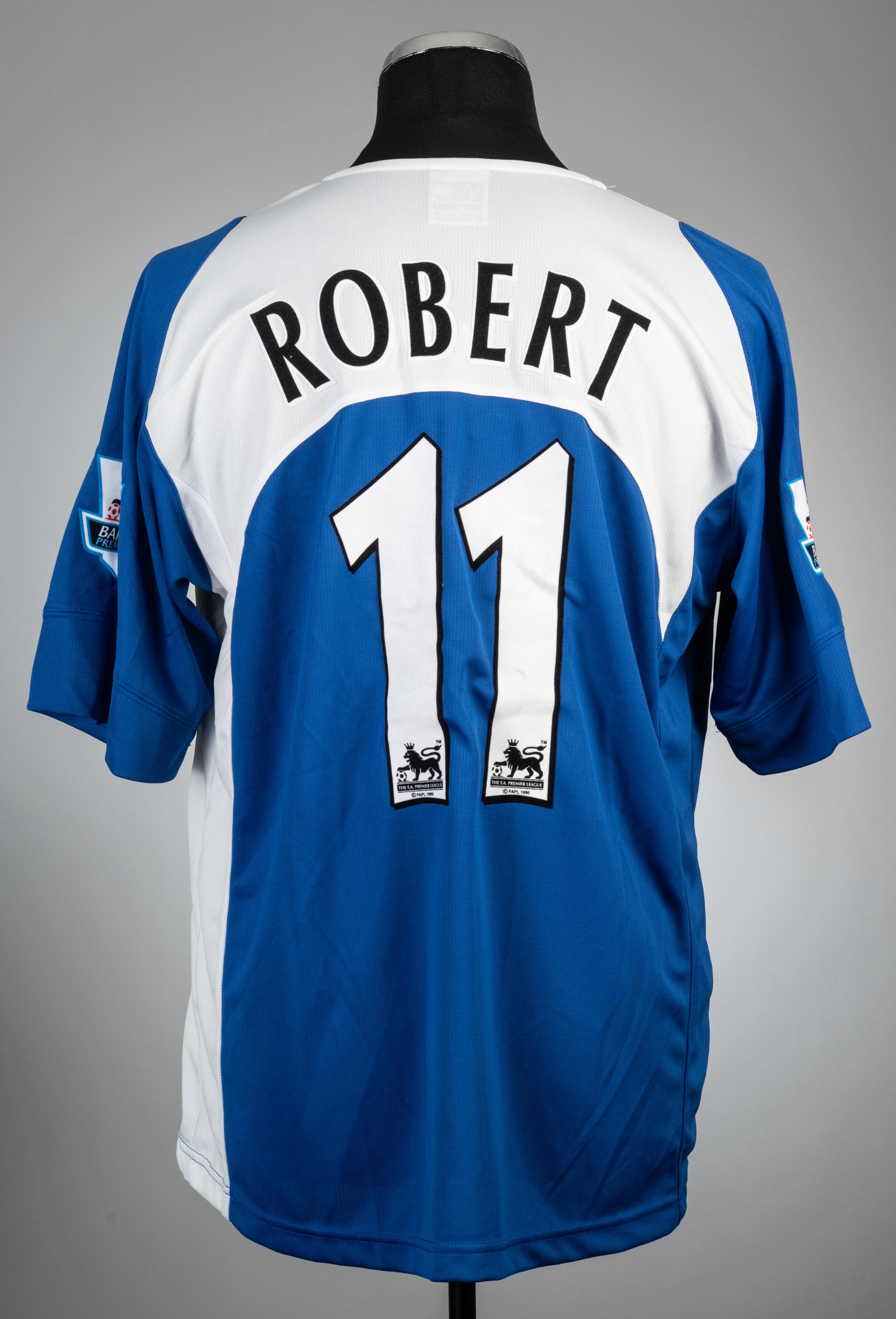 Laurent Robert, blue and white Portsmouth no.11 home jersey, season 2005-06, Jako, short-sleeved with BARCLAYS PREMIERSHIP sleeve badges, club crest and sponsor logo, reverse lettered ROBERT, size 42-44in., with retail tag