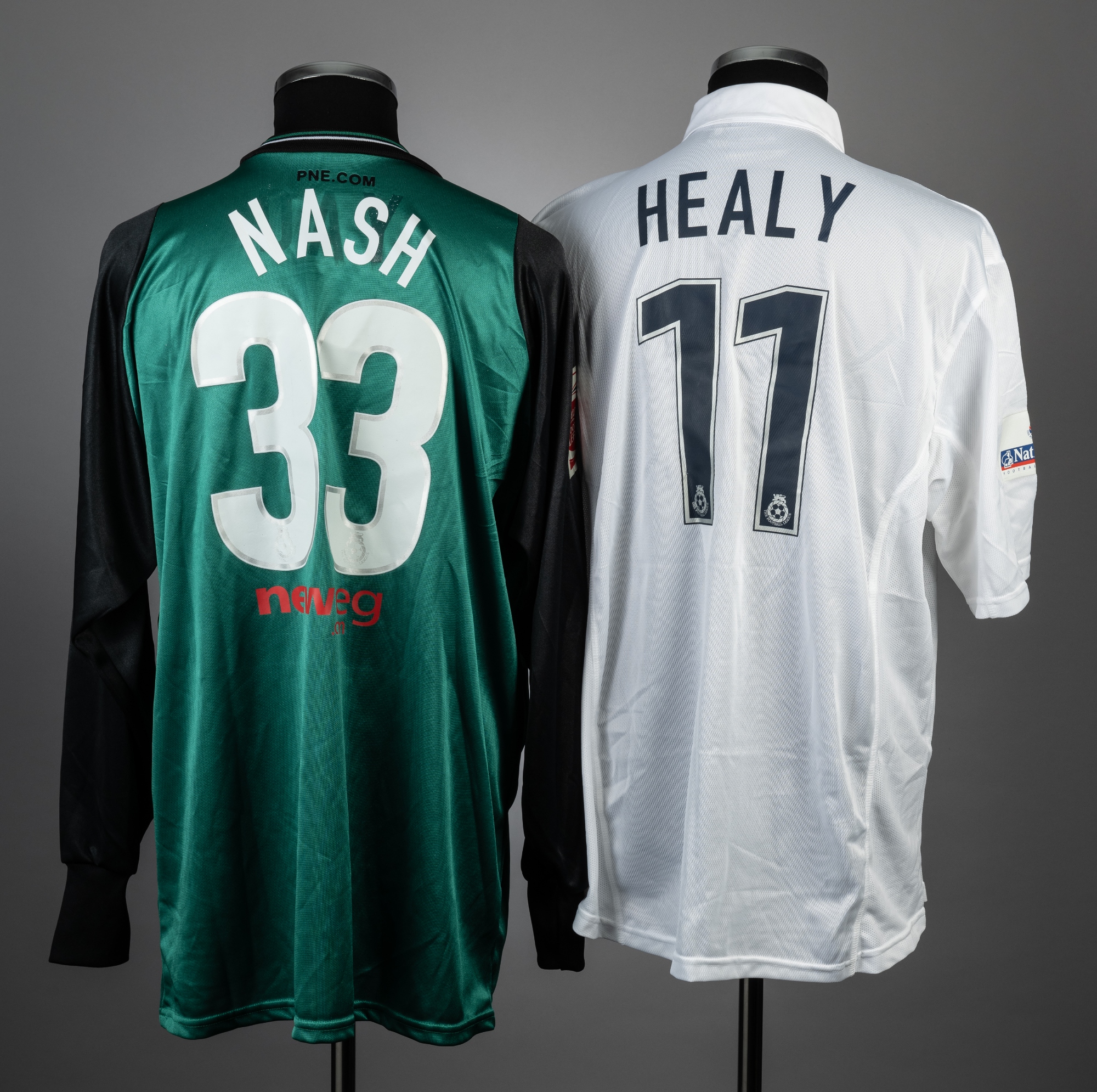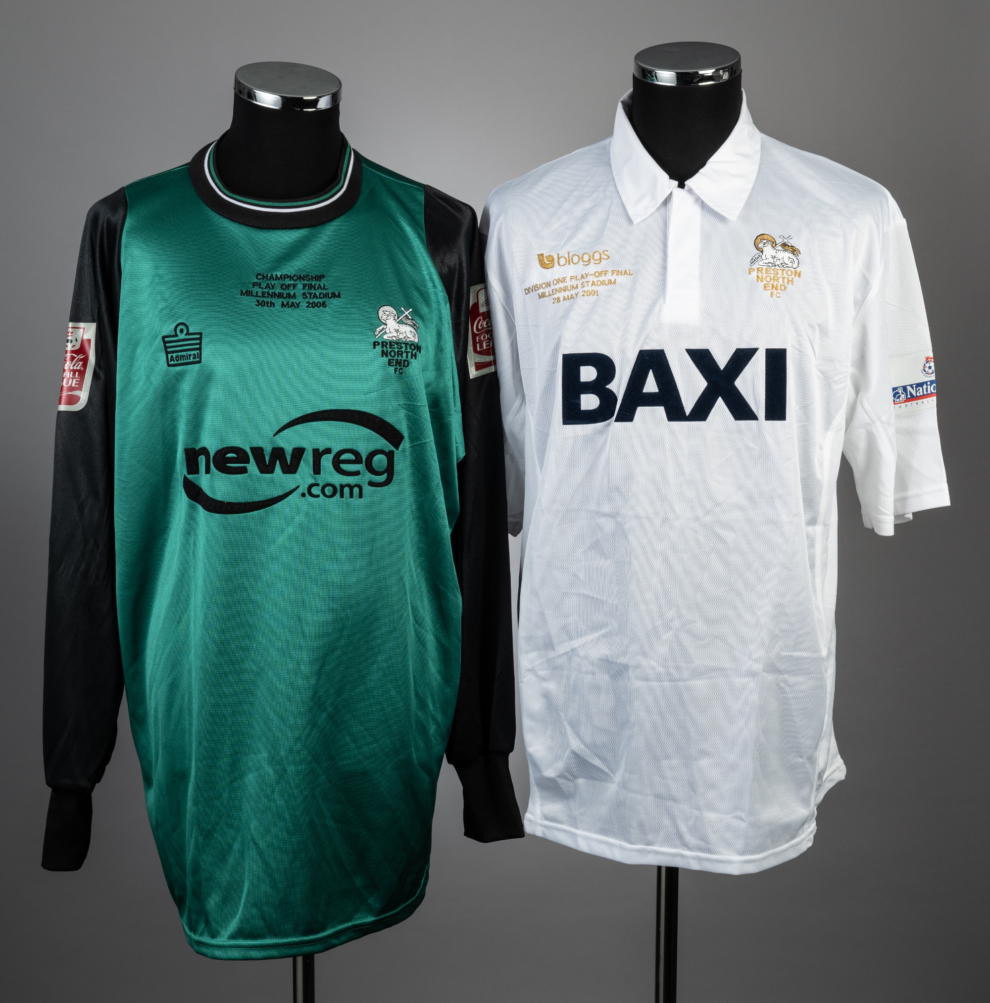 Two Preston North End Play-off Final jerseys from the Millennium Stadium, comprising David Healy white no.11 jersey for the 2001 Division One Play-off final; a Carlo Nash green and black no.33 goalkeeping jersey from the 2005 Championship Play-off final, (2)