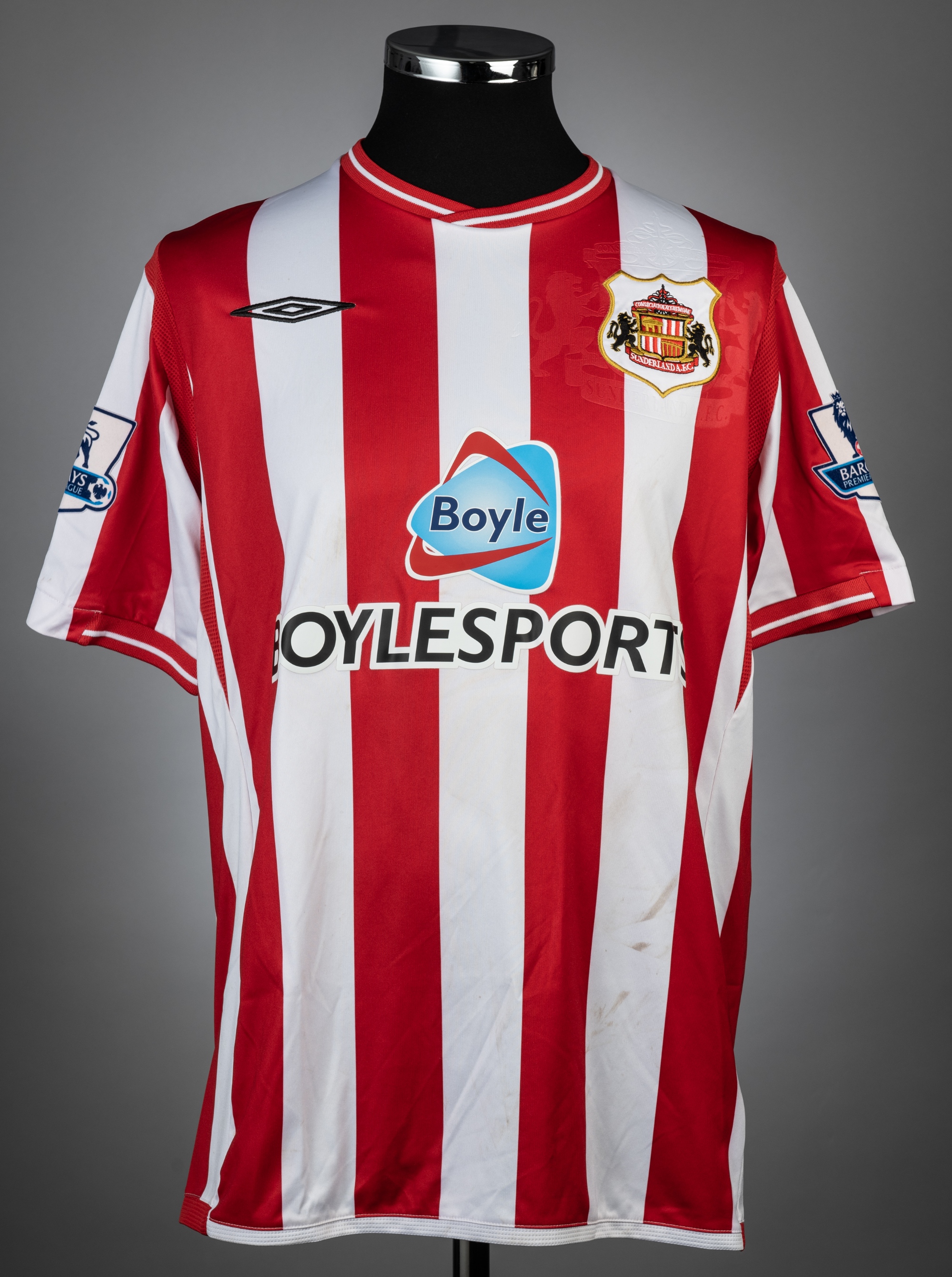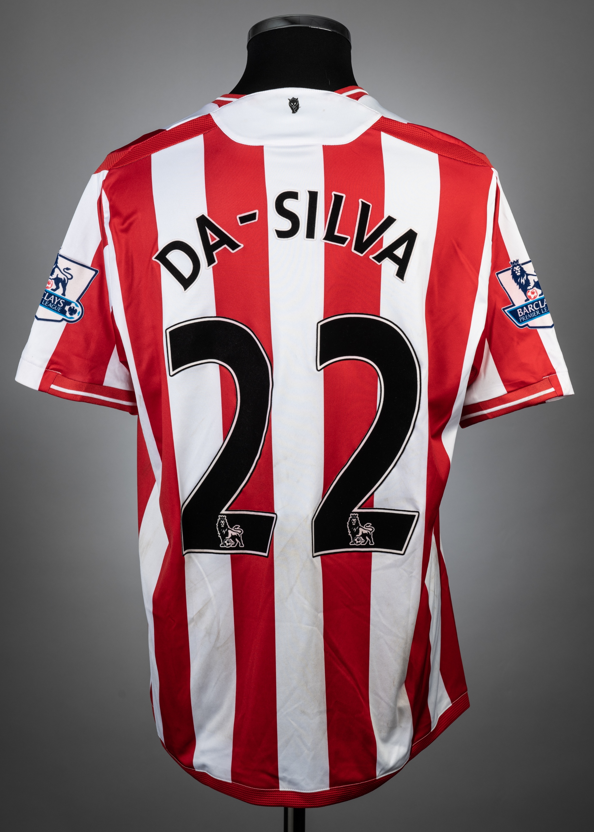 Paulo Da Silva red & white Sunderland no.22 jersey v Arsenal, played at Stadium of Light, on 21st November 2009, match-issue, Umbro, short-sleeved with BARCLAYS PREMIER LEAGUE sleeve badges, club crest and sponsor logo, reverse lettered DA-SILVA, size L, slight colour run into sleeve badges Sunderland defeated Arsenal 1-0.