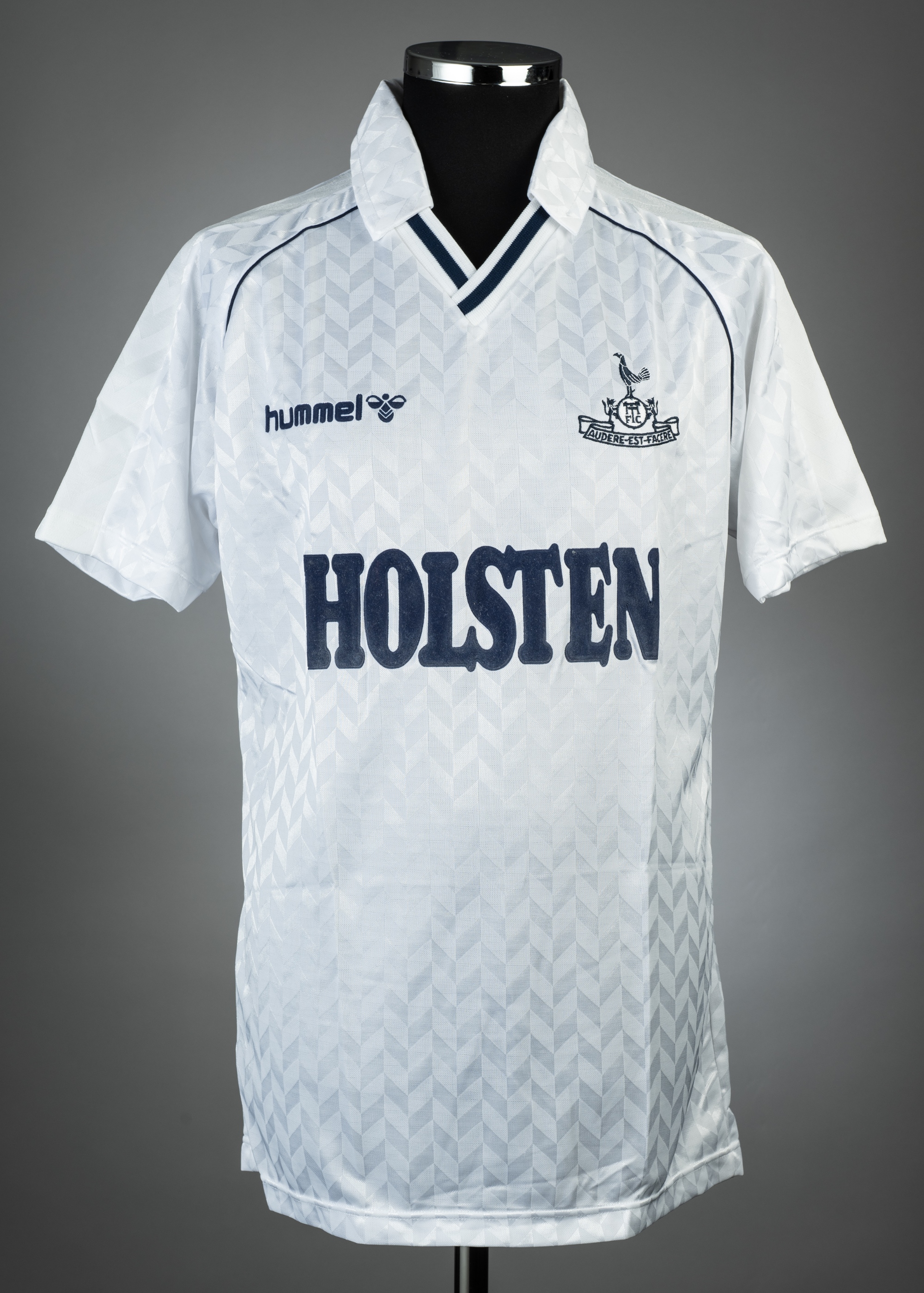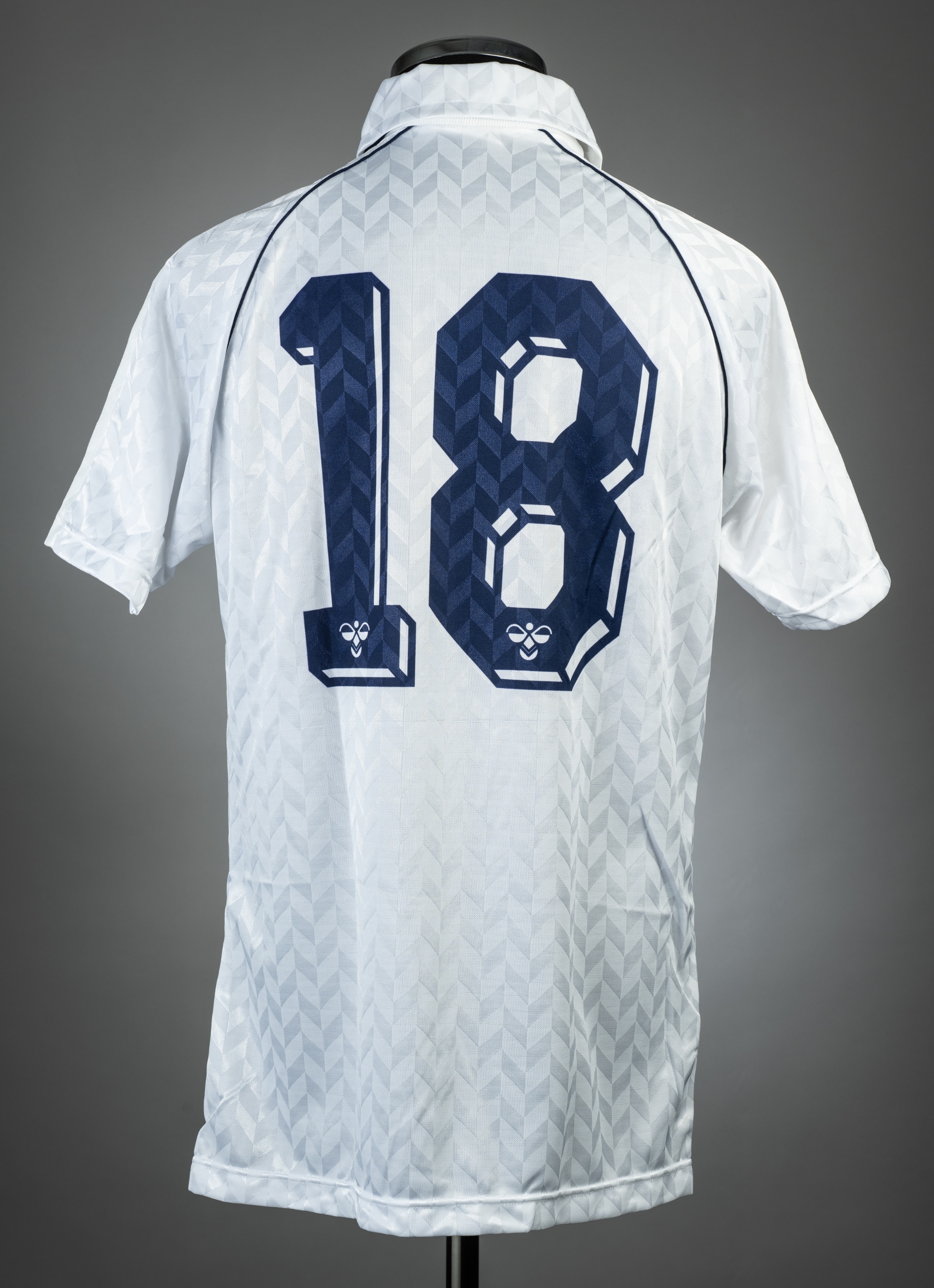 White Tottenham Hotspur no.18 home jersey, season 1987-88, Hummel, short-sleeved with club crest and sponsor logo, reverse numbered 18, size L, not brilliant white colour, slight yellowing due to age