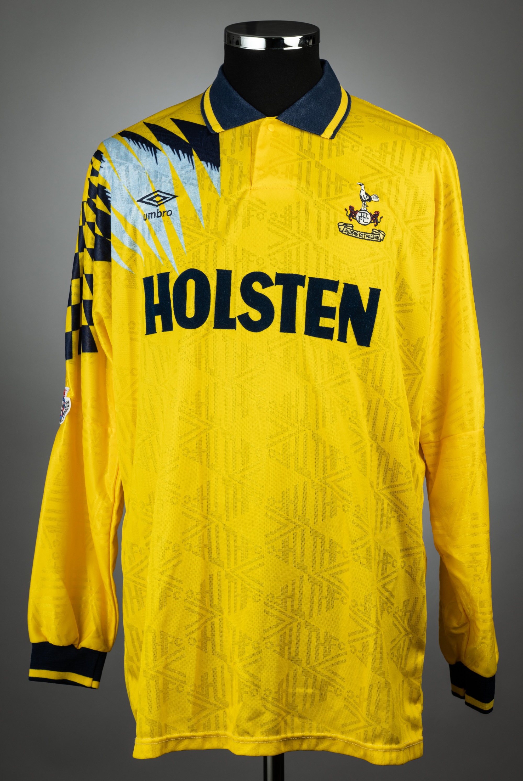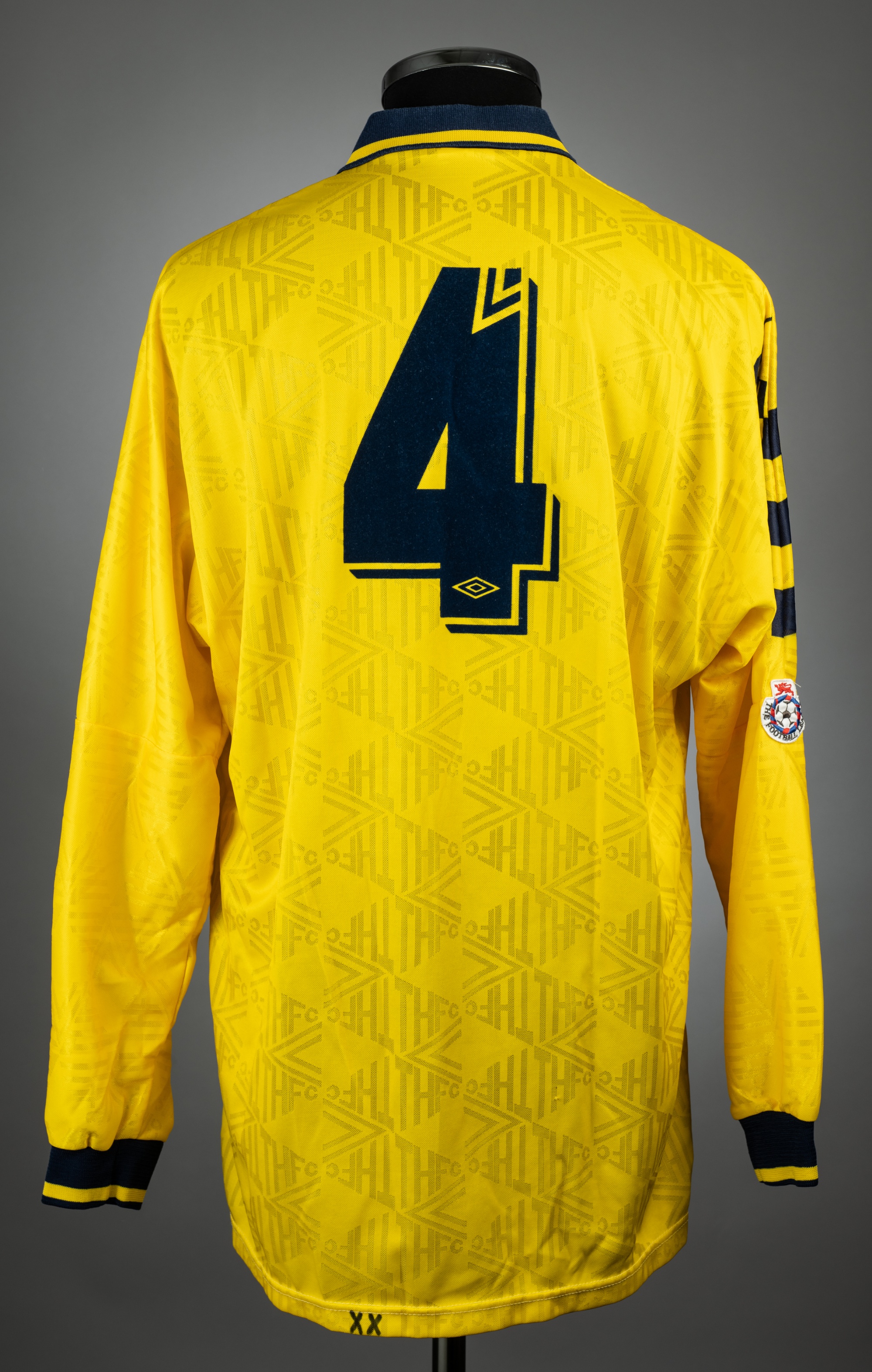 Nayim yellow and navy Tottenham Hotspur no.4 away jersey, season 1991-92, match issue, Umbro, long-sleeved with THE FOOTBALL LEAGUE sleeve badges, cl