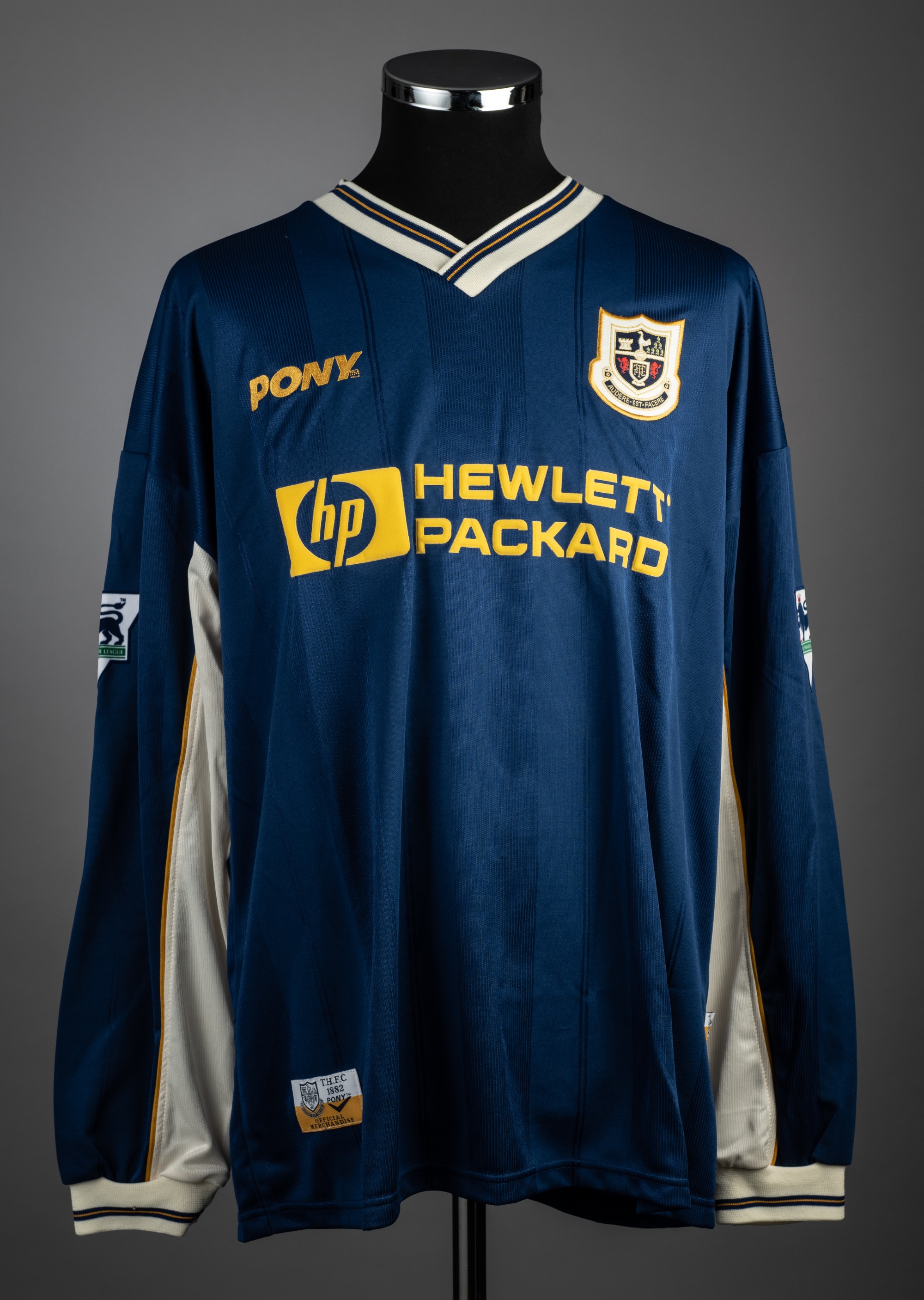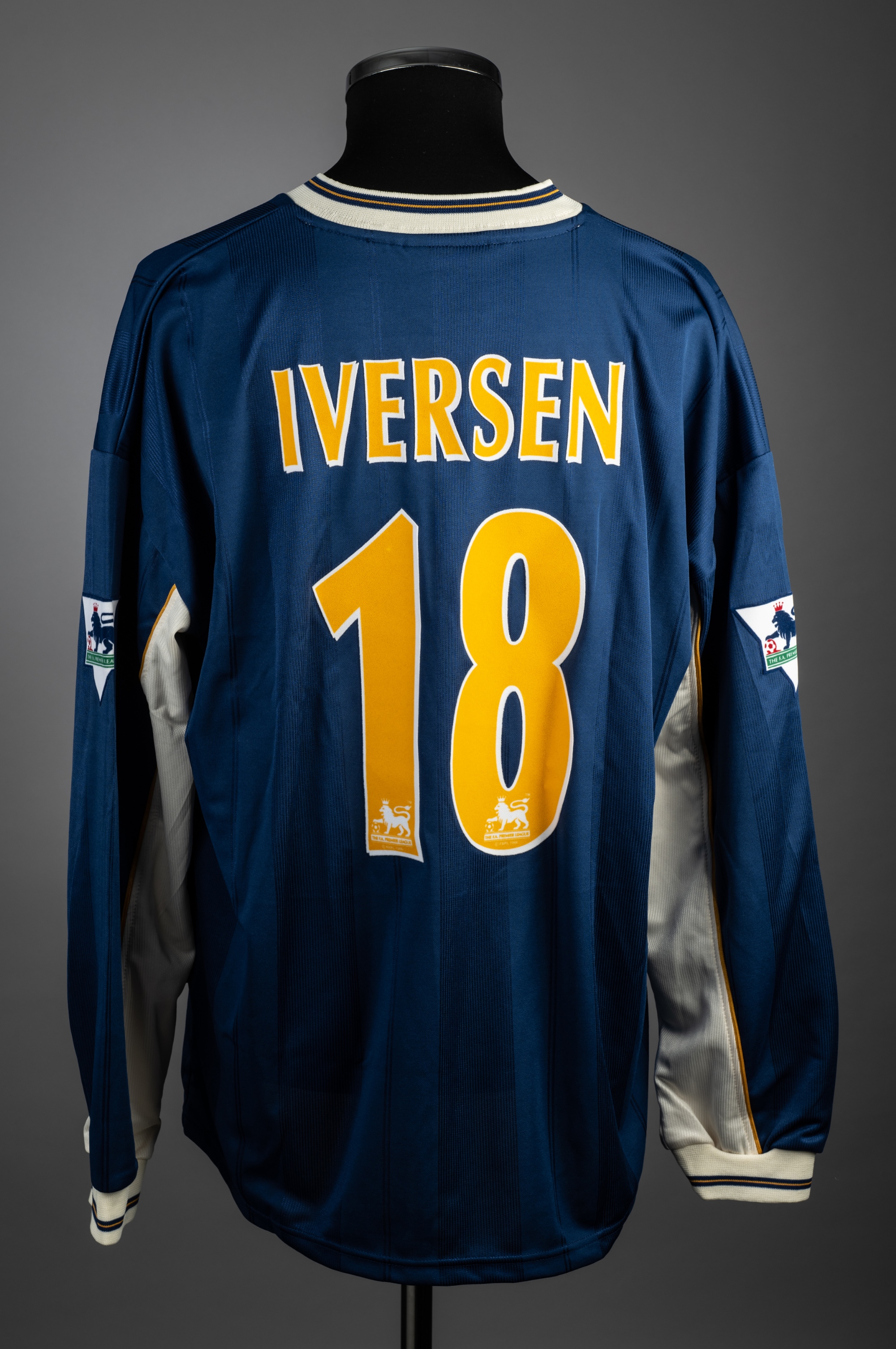 Steffen Iversen blue Tottenham Hotspur no.18 away jersey, season 1997-98, Pony, long-sleeved with THE FA PREMIER LEAGUE sleeve badges, club crest and sponsor logo reverse lettered IVERSEN, size XL, condition good