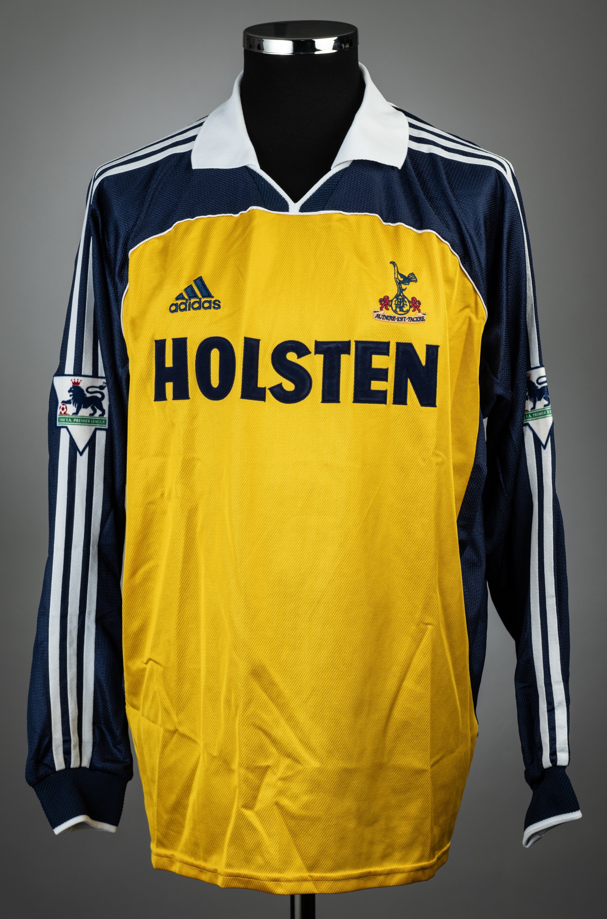 Willem Korsten yellow and navy Tottenham Hotspur no.11 away jersey, season 1999-2000, match issue, Adidas, long-sleeved with THE FA PREMIER LEAGUE sl