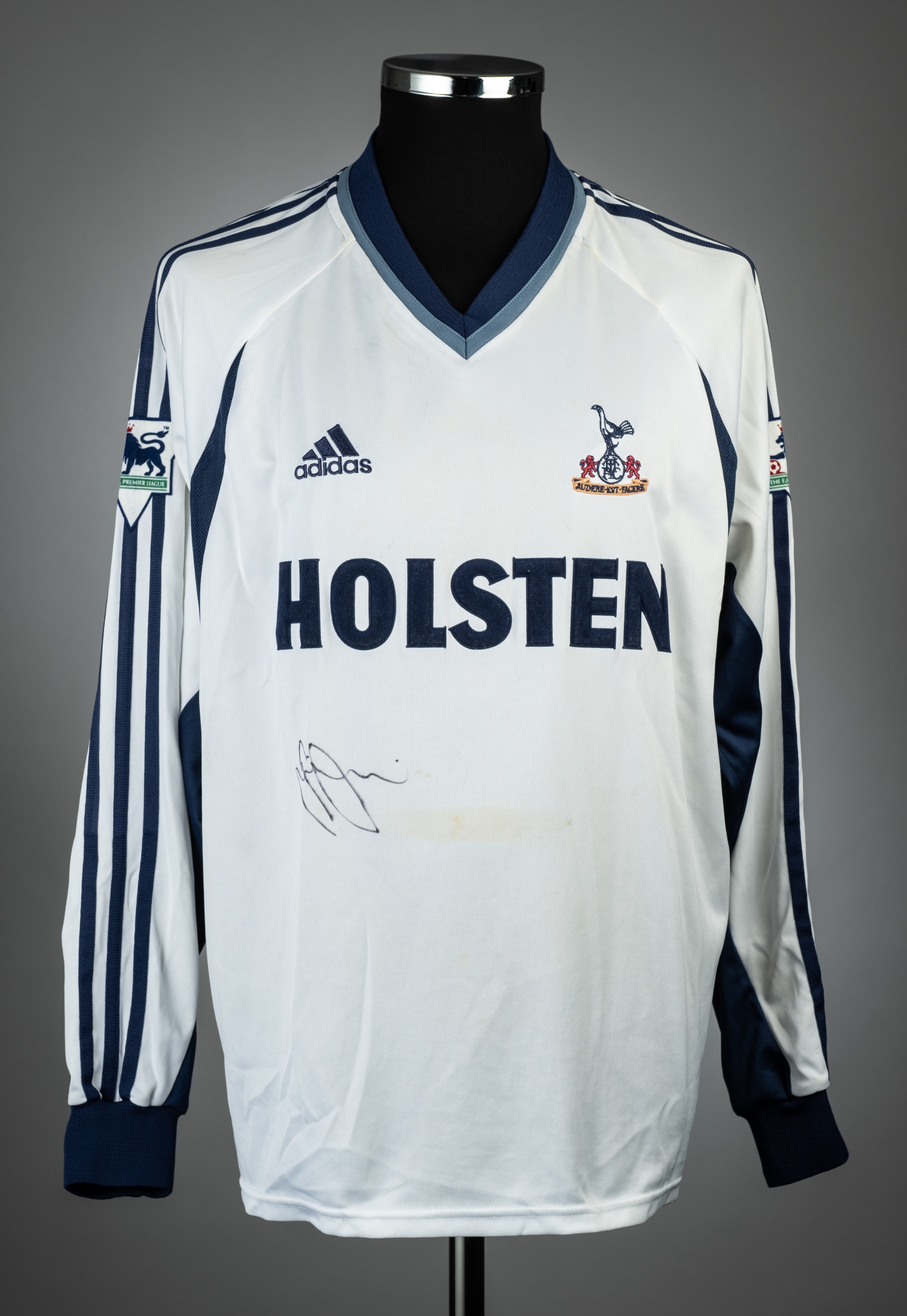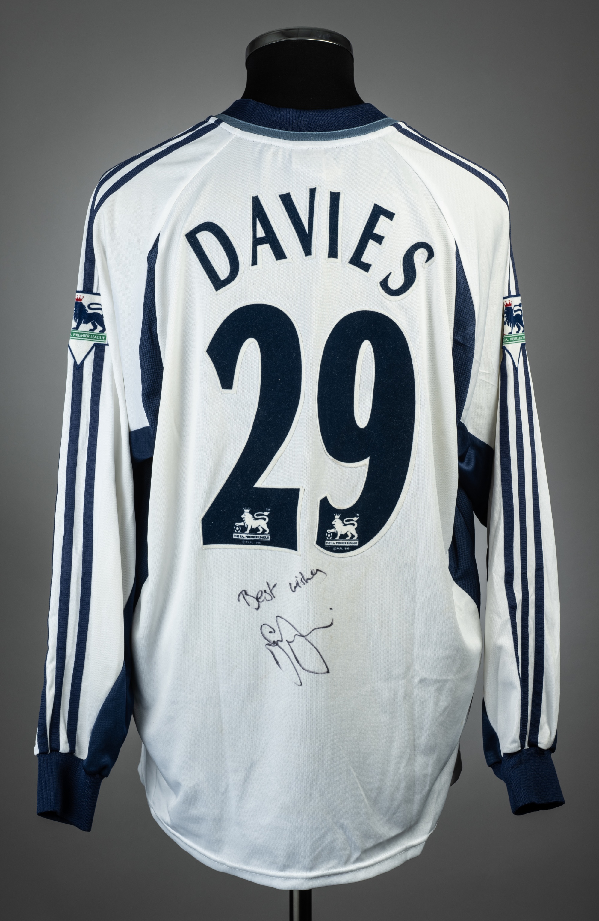 Simon Davies signed white Tottenham Hotspur no.29 home jersey, season 2001-02, match issue, Adidas, long-sleeved with THE FA PREMIER LEAGUE sleeve ba