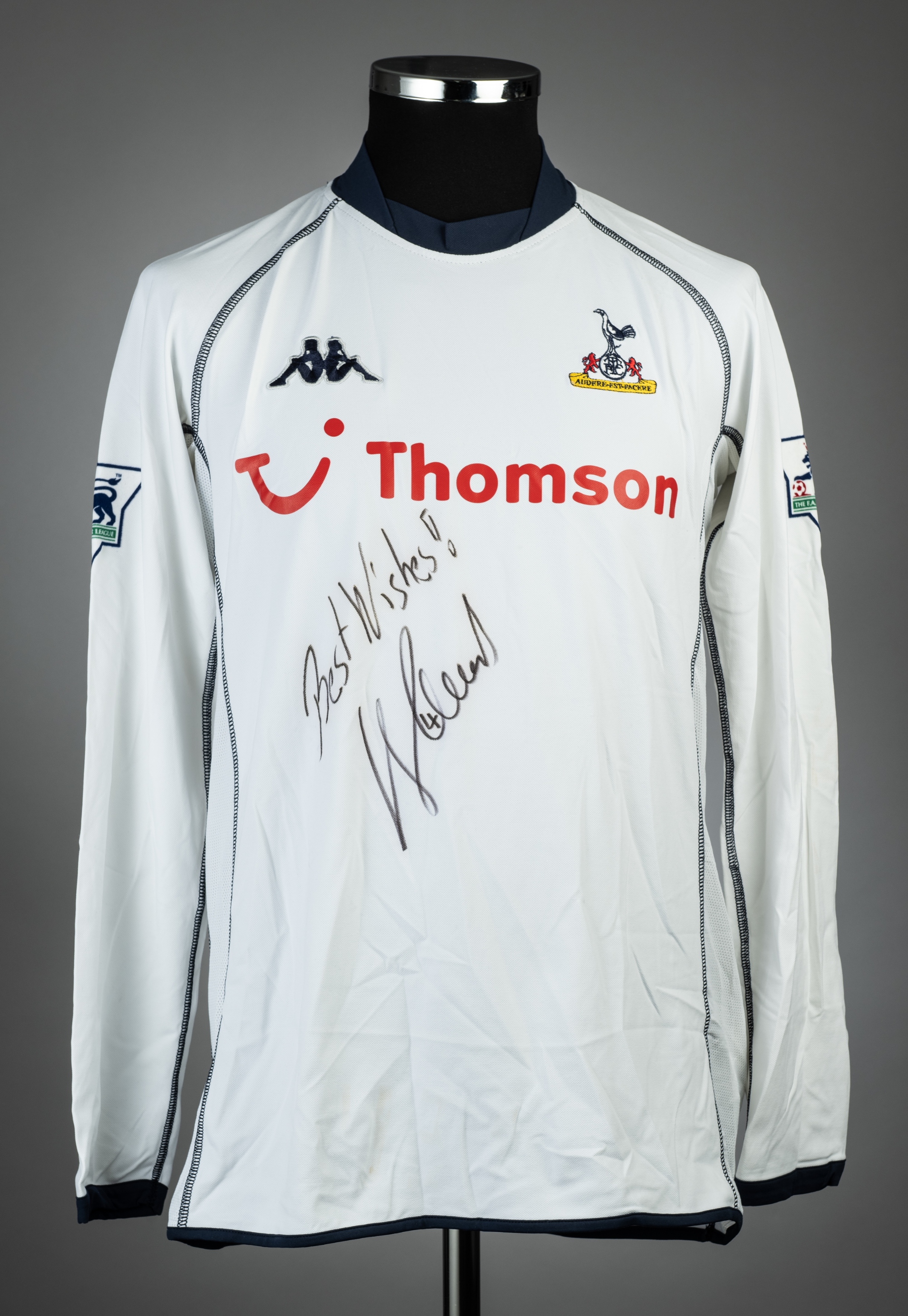 Steffen Freund signed white Tottenham Hotspur no.4 home jersey v Arsenal, played at White Hart Lane, 15th December 2002, Kappa, long-sleeved with THE