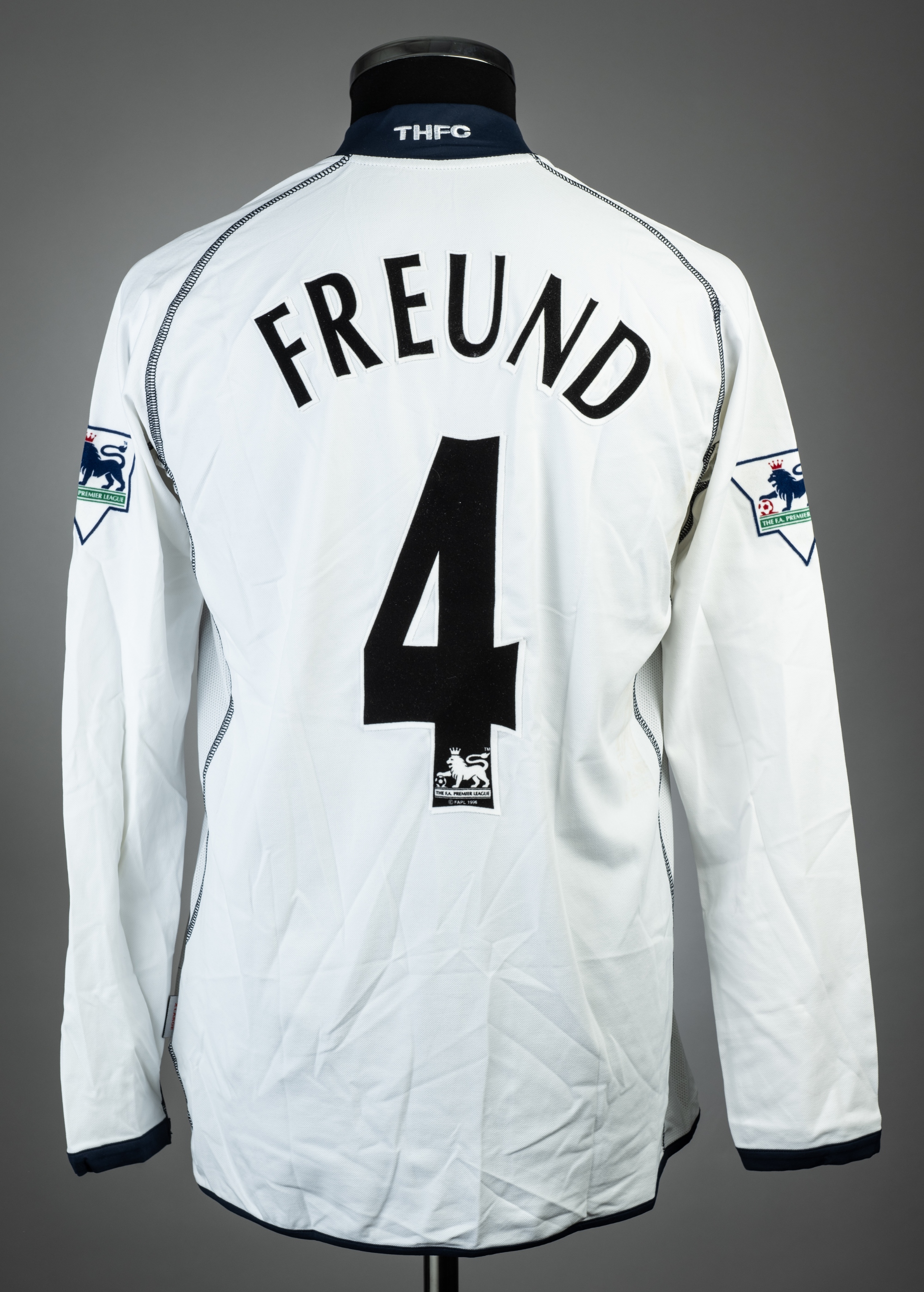 Steffen Freund signed white Tottenham Hotspur no.4 home jersey v Arsenal, played at White Hart Lane, 15th December 2002, Kappa, long-sleeved with THE FA PREMIER LEAGUE sleeve badges, club crest and sponsor logo, reverse lettered FREUND, size XXL, signed in black marker pen to front This fixture resulted in a 1-1 draw. Provenance: acquired from Roy Reyland Tottenham Hotspur kitman.