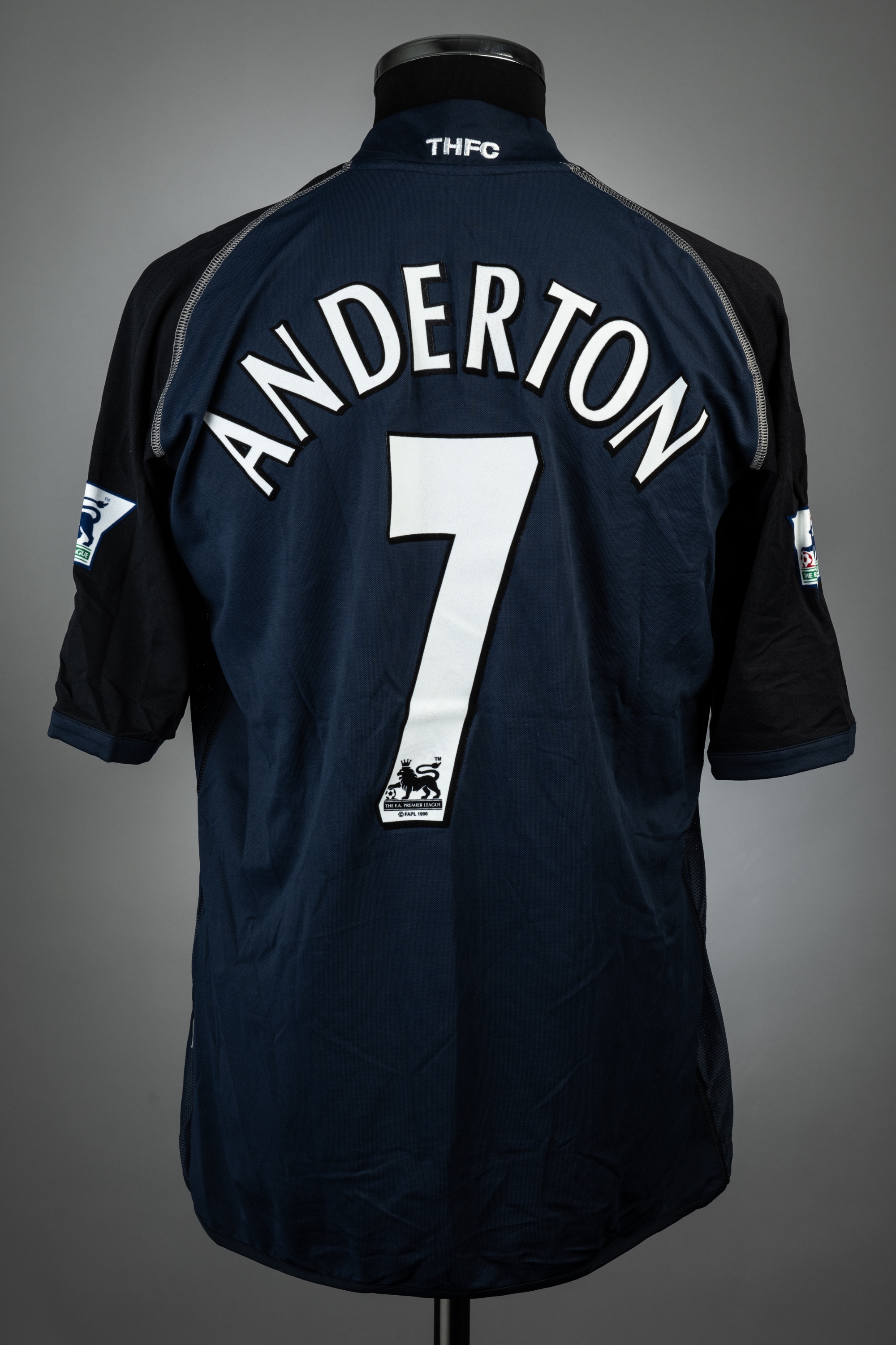 Darren Anderton navy and black Tottenham Hotspur no.7 away jersey, season 2002-03, match issue, Kappa, short-sleeved with THE FA PREMIER LEAGUE sleeve badges, club crest and sponsor logo, reverse lettered ANDERTON, size XXL