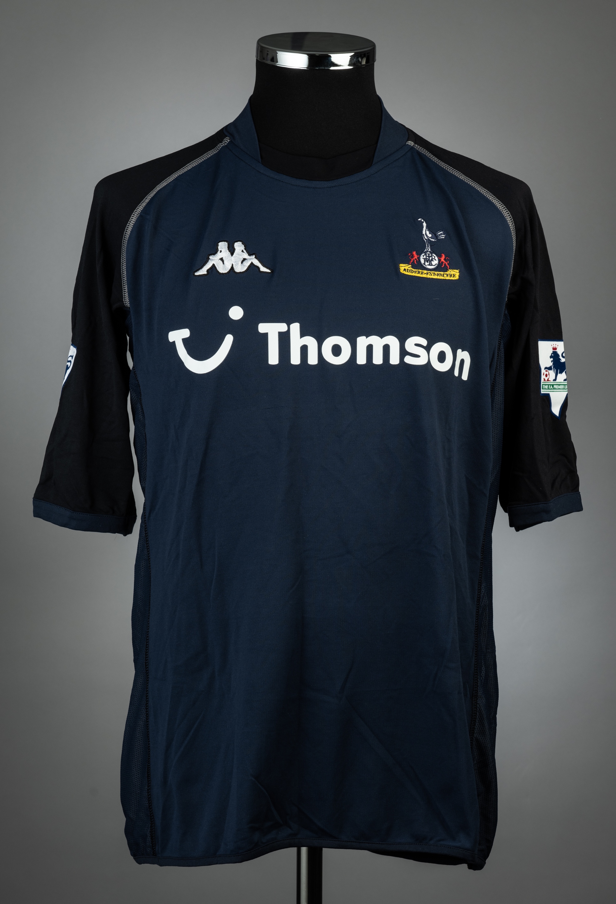 Darren Anderton navy and black Tottenham Hotspur no.7 away jersey, season 2002-03, match issue, Kappa, short-sleeved with THE FA PREMIER LEAGUE sleev